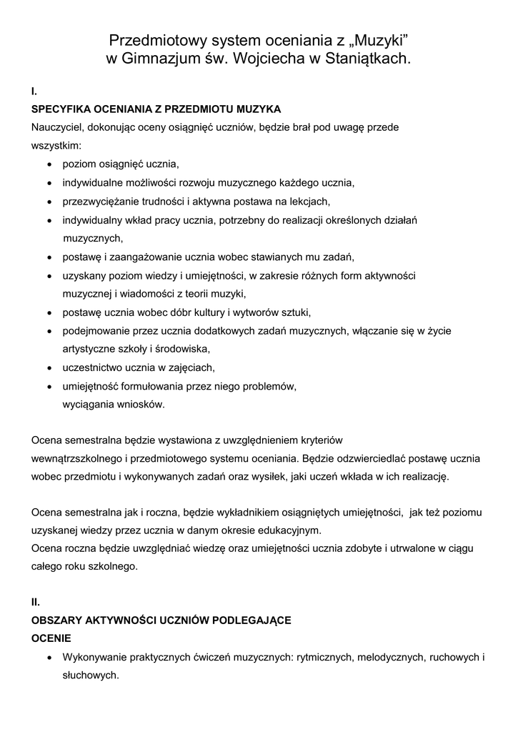 Przedmiotowy system oceniania z „Muzyki” w Gimnazjum św. Wojciecha w Staniątkach. I. SPECYFIKA OCENIANIA Z PRZEDMIOTU MUZYKA Nauczyciel, dokonując oceny osiągnięć uczniów, będzie brał pod uwagę przede wszystkim: poziom osiągnięć ucznia, indywidualne możliwości rozwoju muzycznego każdego ucznia, przezwyciężanie trudności i aktywna postawa na lekcjach, indywidualny wkład pracy ucznia, potrzebny do realizacji określonych działań muzycznych, postawę i zaangażowanie ucznia wobec stawianych mu zadań, uzyskany poziom wiedzy i umiejętności, w zakresie różnych form aktywności muzycznej i wiadomości z teorii muzyki, postawę ucznia wobec dóbr kultury i wytworów sztuki, podejmowanie przez ucznia dodatkowych zadań muzycznych, włączanie się w życie artystyczne szkoły i środowiska, uczestnictwo ucznia w zajęciach, umiejętność formułowania przez niego problemów, wyciągania wniosków. Ocena semestralna będzie wystawiona z uwzględnieniem kryteriów wewnątrzszkolnego i przedmiotowego systemu oceniania. Będzie odzwierciedlać postawę ucznia wobec przedmiotu i wykonywanych zadań oraz wysiłek, jaki uczeń wkłada w ich realizację. Ocena semestralna jak i roczna, będzie wykładnikiem osiągniętych umiejętności, jak też poziomu uzyskanej wiedzy przez ucznia w danym okresie edukacyjnym. Ocena roczna będzie uwzględniać wiedzę oraz umiejętności ucznia zdobyte i utrwalone w ciągu całego roku szkolnego. II. OBSZARY AKTYWNOŚCI UCZNIÓW PODLEGAJĄCE OCENIE Wykonywanie praktycznych ćwiczeń muzycznych: rytmicznych, melodycznych, ruchowych i słuchowych. Aktywne działania w zakresie różnych form muzycznych: śpiewu, gry na instrumencie ,słuchania muzyki, ruchu przy muzyce, twórczości muzycznej (np.: śpiewanie pieśni i piosenek, kanonów dwu i trzygłosowych, przyśpiewek ludowych, granie akompaniamentu, fragmentów utworów różnych kompozytorów, rozpoznawanie i charakteryzowanie: stylu muzycznego epoki w słuchanych utworach, brzmienia instrumentów i głosów ludzkich, budowy formalnej utworu, wykonywanie kroków i figur określonego tańca, tworzenie melodii). Śpiew- intonacja, rytm, dynamika, artykulacja; Gra na instrumentach- odczytanie zapisu nutowego, rytm, sprawność techniczna, umiejętność gry w zespole; Ruch z muzyką- rytm, dynamika, ekspresja, estetyka ruchu; Słuchanie utworów- wrażliwość, umiejętność analizy, emocje; Twórczość – współpraca w grupie, inwencja, wykorzystanie wiedzy w praktyce Odpowiedzi ustne z zakresu znajomości: zasad muzyki (np.: elementów muzyki, znaków chromatycznych, interwałów muzycznych, trójdźwięków), historii muzyki (np.: znajomość epok muzycznych, twórczości kompozytorów), form muzycznych. SPOSOBY SPAWDZANIA WIADOMOŚCI I UMIEJĘTNOŚCI UCZNIÓW - śpiewanie pieśni lub jej fragmentu solo; - śpiewanie w kwartetach - zagranie na instrumencie melodii ( flet prosty, dzwonki chromatyczne); - zagranie na instrumencie perkusyjnym, akompaniamentu; - zagranie w zespole odpowiedniej partii utworu - testy wiadomości( podsumowanie danego działu lub semestru) - odpowiedzi ustne - muzyczne ćwiczenia, krzyżówki, zagadki; - wypowiedzi na temat słuchanych utworów; - przygotowanie materiałów na określony temat do lekcji; - prace domowe( prace pisemne, prace praktyczne). - praca na lekcji (odpowiedzi ustne, aktywność w zakresie form muzycznych: śpiewu, gry na instrumencie, słuchania muzyki, ruchu przy muzyce, twórczości muzycznej). Ocenianie osiągnięć uczniów będzie systematyczne i umotywowane ustnie przez nauczyciela. Ocena nie będzie tylko wykładnikiem poziomu uzyskiwanej wiedzy i umiejętności, ale myślę, że będzie także zachęcać uczniów do rozwijania zainteresowań muzycznych. III. KRYTERIA OCENY 1. Ocenę celującą otrzymuje uczeń, który opanował zakres wiadomości i umiejętności objętych podstawą programową w stopniu bardzo dobrym i dodatkowo: - potrafi bezbłędnie i z właściwą interpretacją zaśpiewać pieśni objęte programem nauczania; - umie grać z nut melodie na instrumentach szkolnych; - potrafi tworzyć proste formy muzyczne(AB ,ABA, rondo, wariacje); - rozpoznaje i nazywa style muzyki; - rozpoznaje utwory z poznanej na lekcjach literatury muzycznej oraz podaje nazwiska ich twórców; - rozpoznaje aparat wykonawczy w słuchanych utworach; - aktywnie uczestniczy w szkolnym życiu muzycznym- konkursach, festiwalach, chórze szkolnym, zespole muzycznym, prowadzeniu gazetki itp.; – czynnie uczestniczy w zajęciach lekcyjnych, – wykazuje zainteresowanie muzyką (np. bierze udział w koncertach), – podejmuje dodatkowe zadania (zdobywa informacje z innych źródeł, angażuje się w życie artystyczne klasy i szkoły) ; – reprezentuje szkołę w konkursach muzycznych na szczeblu gminnym i powiatowym; - potrafi obronić swój pogląd i postawę twórczą; 2. Ocenę bardzo dobrą otrzymuje uczeń, który opanował zakres wiedzy i umiejętności w bardzo wysokim stopniu, a ponadto: - potrafi bezbłędnie zaśpiewać pieśni objęte programem nauczania; - umie grać z nut melodie na instrumencie szkolnym( flet prosty, dzwonki chromatyczne); - potrafi tworzyć proste akompaniamenty do znanych melodii; - rozpoznaje utwory muzyczne z literatury obowiązkowej; - rozpoznaje formy muzyczne i brzmienie instrumentów; - rozpoznaje polskie utwory ludowe( tańce narodowe i pieśni); – wykazuje aktywną postawę w pracach indywidualnych i zespołowych, – wyróżniająco wywiązuje się z wszelkich zadań i powierzonych mu ról, - aktywnie uczestniczy w życiu artystycznym szkoły i środowiska lokalnego( chór szkolny , zespoły muzyczne, koncerty); – uzyskuje bardzo dobre i dobre oceny cząstkowe, – starannie wykonuje ćwiczenia plastyczno-muzyczne, – potrafi obronić swój pogląd i postawę twórczą. 3. Ocenę dobrą otrzymuje uczeń, który opanował zakres programowy wiedzy i umiejętności w stopniu średnim, a także