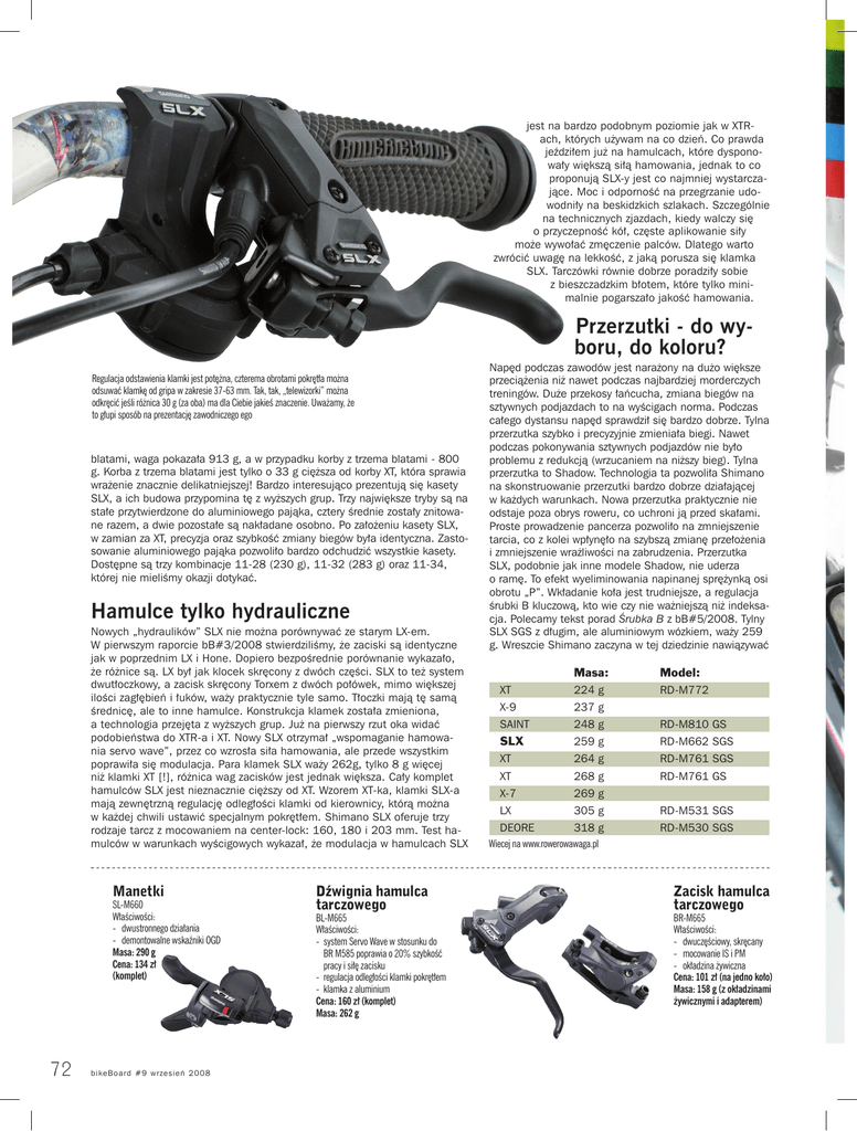 jest na bardzo podobnym poziomie jak w XTRach, których używam na co dzień. Co prawda jeździłem już na hamulcach, które dysponowały większą siłą hamowania, jednak to co proponują SLX-y jest co najmniej wystarczające. Moc i odporność na przegrzanie udowodniły na beskidzkich szlakach. Szczególnie na technicznych zjazdach, kiedy walczy się o przyczepność kół, częste aplikowanie siły może wywołać zmęczenie palców. Dlatego warto zwrócić uwagę na lekkość, z jaką porusza się klamka SLX. Tarczówki równie dobrze poradziły sobie z bieszczadzkim błotem, które tylko minimalnie pogarszało jakość hamowania. Przerzutki - do wyboru, do koloru? Regulacja odstawienia klamki jest potężna, czterema obrotami pokrętła można odsuwać klamkę od gripa w zakresie 37-63 mm. Tak, tak, „telewizorki” można odkręcić jeśli różnica 30 g (za oba) ma dla Ciebie jakieś znaczenie. Uważamy, że to głupi sposób na prezentację zawodniczego ego blatami, waga pokazała 913 g, a w przypadku korby z trzema blatami - 800 g. Korba z trzema blatami jest tylko o 33 g cięższa od korby XT, która sprawia wrażenie znacznie delikatniejszej! Bardzo interesująco prezentują się kasety SLX, a ich budowa przypomina tę z wyższych grup. Trzy największe tryby są na stałe przytwierdzone do aluminiowego pająka, cztery średnie zostały znitowane razem, a dwie pozostałe są nakładane osobno. Po założeniu kasety SLX, w zamian za XT, precyzja oraz szybkość zmiany biegów była identyczna. Zastosowanie aluminiowego pająka pozwoliło bardzo odchudzić wszystkie kasety. Dostępne są trzy kombinacje 11-28 (230 g), 11-32 (283 g) oraz 11-34, której nie mieliśmy okazji dotykać. Hamulce tylko hydrauliczne Nowych „hydraulików” SLX nie można porównywać ze starym LX-em. W pierwszym raporcie bB#3/2008 stwierdziliśmy, że zaciski są identyczne jak w poprzednim LX i Hone. Dopiero bezpośrednie porównanie wykazało, że różnice są. LX był jak klocek skręcony z dwóch części. SLX to też system dwutłoczkowy, a zacisk skręcony Torxem z dwóch połówek, mimo większej ilości zagłębień i łuków, waży praktycznie tyle samo. Tłoczki mają tę samą średnicę, ale to inne hamulce. Konstrukcja klamek została zmieniona, a technologia przejęta z wyższych grup. Już na pierwszy rzut oka widać podobieństwa do XTR-a i XT. Nowy SLX otrzymał „wspomaganie hamowania servo wave”, przez co wzrosła siła hamowania, ale przede wszystkim poprawiła się modulacja. Para klamek SLX waży 262g, tylko 8 g więcej niż klamki XT [!], różnica wag zacisków jest jednak większa. Cały komplet hamulców SLX jest nieznacznie cięższy od XT. Wzorem XT-ka, klamki SLX-a mają zewnętrzną regulację odległości klamki od kierownicy, którą można w każdej chwili ustawić specjalnym pokrętłem. Shimano SLX oferuje trzy rodzaje tarcz z mocowaniem na center-lock: 160, 180 i 203 mm. Test hamulców w warunkach wyścigowych wykazał, że modulacja w hamulcach SLX Manetki SL-M660 Właściwości: - dwustronnego działania - demontowalne wskaźniki OGD Masa: 290 g Cena: 134 zł (komplet) 72 bi k eB oar d #9 wrzes ień 2008 Dźwignia hamulca tarczowego BL-M665 Właściwości: - system Servo Wave w stosunku do BR M585 poprawia o 20% szybkość pracy i siłę zacisku - regulacja odległości klamki pokrętłem - klamka z aluminium Cena: 160 zł (komplet) Masa: 262 g Napęd podczas zawodów jest narażony na dużo większe przeciążenia niż nawet podczas najbardziej morderczych treningów. Duże przekosy łańcucha, zmiana biegów na sztywnych podjazdach to na wyścigach norma. Podczas całego dystansu napęd sprawdził się bardzo dobrze. Tylna przerzutka szybko i precyzyjnie zmieniała biegi. Nawet podczas pokonywania sztywnych podjazdów nie było problemu z redukcją (wrzucaniem na niższy bieg). Tylna przerzutka to Shadow. Technologia ta pozwoliła Shimano na skonstruowanie przerzutki bardzo dobrze działającej w każdych warunkach. Nowa przerzutka praktycznie nie odstaje poza obrys roweru, co uchroni ją przed skałami. Proste prowadzenie pancerza pozwoliło na zmniejszenie tarcia, co z kolei wpłynęło na szybszą zmianę przełożenia i zmniejszenie wrażliwości na zabrudzenia. Przerzutka SLX, podobnie jak inne modele Shadow, nie uderza o ramę. To efekt wyeliminowania napinanej sprężynką osi obrotu „P”. Wkładanie koła jest trudniejsze, a regulacja śrubki B kluczową, kto wie czy nie ważniejszą niż indeksacja. Polecamy tekst porad Śrubka B z bB#5/2008. Tylny SLX SGS z długim, ale aluminiowym wózkiem, waży 259 g. Wreszcie Shimano zaczyna w tej dziedzinie nawiązywać Masa: Model: XT 224 g RD-M772 X-9 237 g SAINT 248 g RD-M810 GS SLX 259 g RD-M662 SGS XT 264 g RD-M761 SGS XT 268 g RD-M761 GS X-7 269 g LX 305 g RD-M531 SGS DEORE 318 g RD-M530 SGS Wiecej na www.rowerowawaga.pl Zacisk hamulca tarczowego BR-M665 Właściwości: - dwuczęściowy, skręcany - mocowanie IS i PM - okładzina żywiczna Cena: 101 zł (na jedno koło) Masa: 158 g (z okładzinami żywicznymi i adapterem)