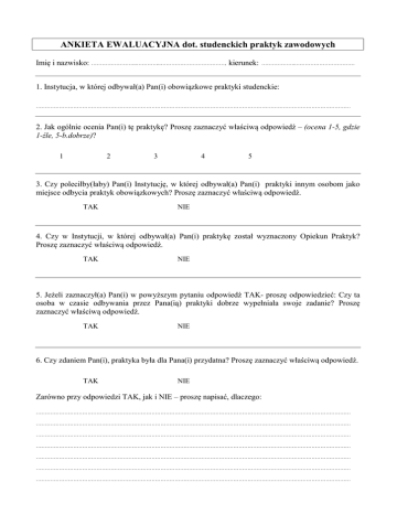 ANKIETA EWALUACYJNA dot. studenckich praktyk zawodowych Imię i nazwisko: ……………………..…………..………………………………, kierunek: ………………..…………………………… 1. Instytucja, w której odbywał(a) Pan(i) obowiązkowe praktyki studenckie: …………………………………………………………………………………………………………………………………………………………… 2. Jak ogólnie ocenia Pan(i) tę praktykę? Proszę zaznaczyć właściwą odpowiedź – (ocena 1-5, gdzie 1-źle, 5-b.dobrze)? 1 2 3 4 5 3. Czy poleciłby(łaby) Pan(i) Instytucję, w której odbywał(a) Pan(i) praktyki innym osobom jako miejsce odbycia praktyk obowiązkowych? Proszę zaznaczyć właściwą odpowiedź. TAK NIE 4. Czy w Instytucji, w której odbywał(a) Pan(i) praktykę został wyznaczony Opiekun Praktyk? Proszę zaznaczyć właściwą odpowiedź. TAK NIE 5. Jeżeli zaznaczył(a) Pan(i) w powyższym pytaniu odpowiedź TAK- proszę odpowiedzieć: Czy ta osoba w czasie odbywania przez Pana(ią) praktyki dobrze wypełniała swoje zadanie? Proszę zaznaczyć właściwą odpowiedź. TAK NIE 6. Czy zdaniem Pan(i), praktyka była dla Pana(i) przydatna? Proszę zaznaczyć właściwą odpowiedź. TAK NIE Zarówno przy odpowiedzi TAK, jak i NIE – proszę napisać, dlaczego: …………………………………………………………………………………………………………………………………………………………… …………………………………………………………………………………………………………………………………………………………… …………………………………………………………………………………………………………………………………………………………… …………………………………………………………………………………………………………………………………………………………… …………………………………………………………………………………………………………………………………………………………… …………………………………………………………………………………………………………………………………………………………… ……………………………………………………………………………………………………………………………………………………………