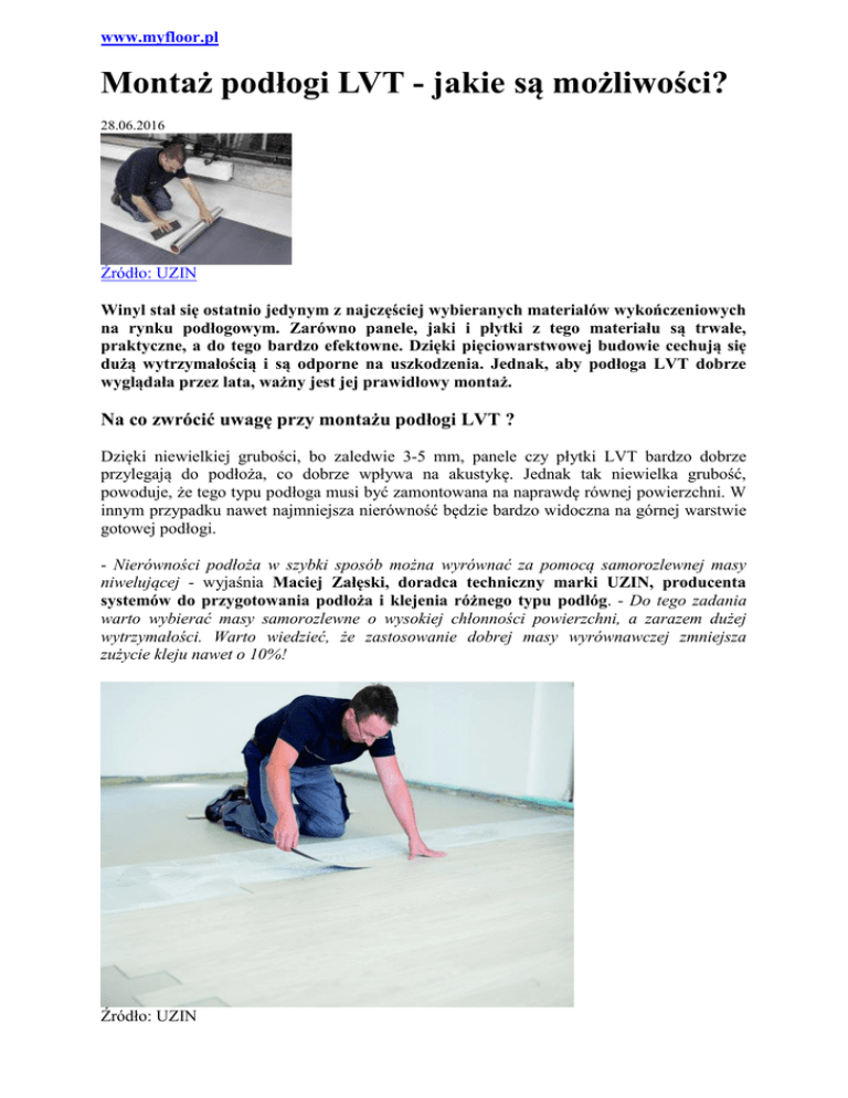 www.myfloor.pl Montaż podłogi LVT - jakie są możliwości? 28.06.2016 Źródło: UZIN Winyl stał się ostatnio jedynym z najczęściej wybieranych materiałów wykończeniowych na rynku podłogowym. Zarówno panele, jaki i płytki z tego materiału są trwałe, praktyczne, a do tego bardzo efektowne. Dzięki pięciowarstwowej budowie cechują się dużą wytrzymałością i są odporne na uszkodzenia. Jednak, aby podłoga LVT dobrze wyglądała przez lata, ważny jest jej prawidłowy montaż. Na co zwrócić uwagę przy montażu podłogi LVT ? Dzięki niewielkiej grubości, bo zaledwie 3-5 mm, panele czy płytki LVT bardzo dobrze przylegają do podłoża, co dobrze wpływa na akustykę. Jednak tak niewielka grubość, powoduje, że tego typu podłoga musi być zamontowana na naprawdę równej powierzchni. W innym przypadku nawet najmniejsza nierówność będzie bardzo widoczna na górnej warstwie gotowej podłogi. - Nierówności podłoża w szybki sposób można wyrównać za pomocą samorozlewnej masy niwelującej - wyjaśnia Maciej Załęski, doradca techniczny marki UZIN, producenta systemów do przygotowania podłoża i klejenia różnego typu podłóg. - Do tego zadania warto wybierać masy samorozlewne o wysokiej chłonności powierzchni, a zarazem dużej wytrzymałości. Warto wiedzieć, że zastosowanie dobrej masy wyrównawczej zmniejsza zużycie kleju nawet o 10%! Źródło: UZIN Wybór sposobu montażu powinien być dobrze przemyślany Podłogi winylowe można zarówno przytwierdzić na stałe do podłoża lub podobnie jak panele laminowane ułożyć "na pływająco". Przyklejenie posadzki do podłoża wpływa na jej trwałość i stabilność. Dzięki temu podłoga zwiększa swoją odporność na obciążenia – np. ciężkich mebli. W pomieszczeniach „mokrych”, jak łazienka czy strefy SPA – oprócz stabilności, taki sposób montażu zapobiega przedostawaniu się wilgoci do wylewki. Podobnie jest w przypadku montażu na ogrzewaniu podłogowym, gdzie zmniejsza straty ciepła. Klejenie "na mokro" warto jednak zlecić wykwalifikowanym fachowcom, którzy do montażu użyją odpowiedniego sprzętu i środków. - Do montażu podłóg LVT polecamy zbrojony włóknami, dyspersyjny klej UZIN KE 66 NEW. Gwarantuje on stabilność wymiarową i zapobiega powstawaniu szczelin między klejonymi płytkami. Dodatkowo środek ten ma wydłużony czas otwarty, dzięki czemu pozwala fachowcom na spokojniejszą pracę nawet w trudnych warunkach. Nadaje się także do stosowania na ogrzewanie podłogowe - mówi Maciej Załęski. Jeśli podłoga jest "narażona" na częstą zmianę aranżację wnętrz, w tym przypadku do montażu LVT warto użyć bezklejowy system loose-lay. Taki sposób stosuje się także najczęściej w przypadku przestrzeniach handlowo-usługowych, gdzie podłoga zwykle jest wymieniana wraz ze zmianą najemcy. Jaki rozwiązanie mocujące sprawdzi się najlepiej? Wybierając klej do podłogi LVT warto zwrócić uwagę, aby był on odporny na ścinanie i odkształcanie, a dodatkowo nie wypływał spomiędzy klejonych elementów. Jeśli nie chcemy używać kleju, a przy tym zależy nam na cichym i czystym, a do tego szybkim sposobie montażu, możemy zastosować nowoczesną technologię switchTec®, czyli folię nośną o właściwościach klejących. - Dużą zaletą tego rodzaju rozwiązań jest możliwość natychmiastowego użytkowania podłogi po zakończeniu montażu - zauważa ekspert marki UZIN, producenta rozwiązań SIGAN ELEMENTS i SIGAN ELEMENTS PLUS. -Co ważne, równie prosty jest demontaż takiej podłogi - można ją zdjąć bez pozostawiania śladów np. resztek klejów. To szczególnie przydatne we wnętrzach, w których często zmienia się aranżacja. Źródło: UZIN Kolejnym rozwiązaniem, który możemy zastosować podczas montażu winyli jest dyspersyjny system mocujący, który można aplikować na stojąco za pomocą wałka. Kompletny zestaw pozwala na wykonanie szybkiego i samodzielnego montażu. Ma jednak pewne ograniczenia. - Systemu UZIN U 3000 nie można traktować jako szybszego i prostszego w zastosowaniu zamiennika dla tradycyjnego kleju. Nie ma bowiem takiej siły klejenia. Sprawdzi się za to idealnie w niedużych pomieszczeniach, w których natężenie ruchu będzie niewielkie - dodaje Maciej Załęski. - Dużą zaletą jest z kolei możliwość wejścia na podłogę tuż po położeniu. Autor: Patrycja Klepczarek