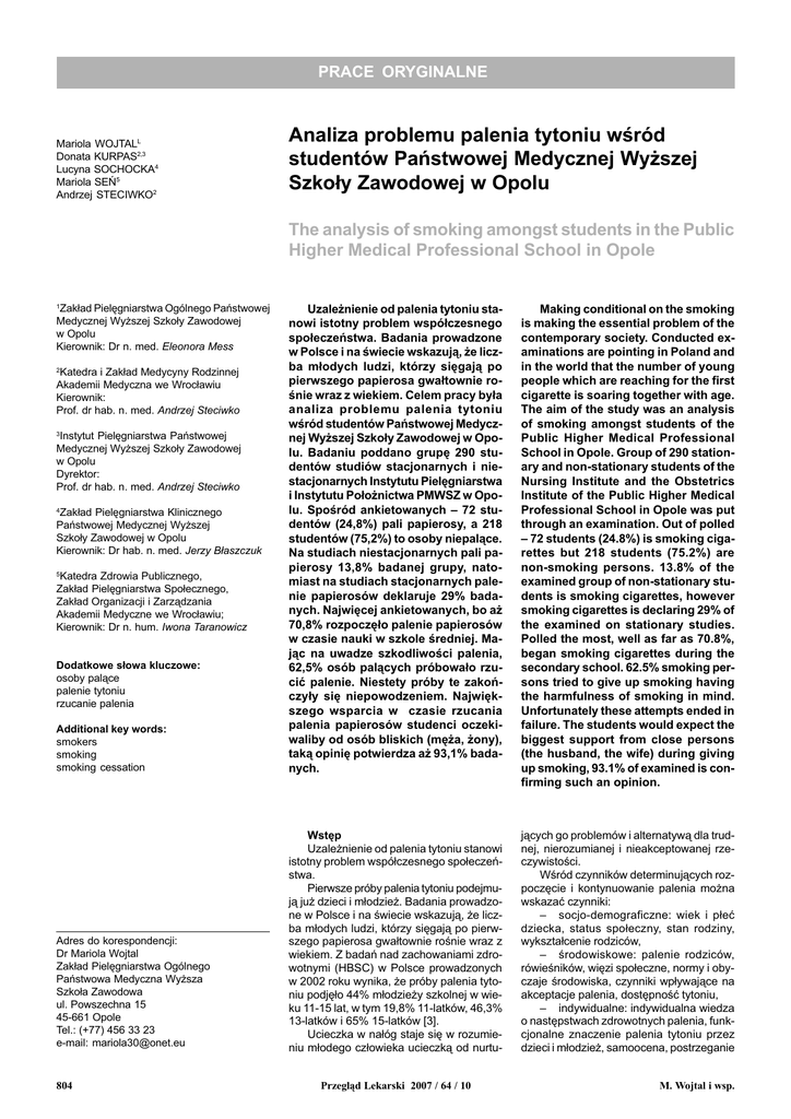 PRACE ORYGINALNE Mariola WOJTALL Donata KURPAS2,3 Lucyna SOCHOCKA4 Mariola SEÑ5 Andrzej STECIWKO2 Analiza problemu palenia tytoniu wród studentów Pañstwowej Medycznej Wy¿szej Szko³y Zawodowej w Opolu The analysis of smoking amongst students in the Public Higher Medical Professional School in Opole Additional key words: smokers smoking smoking cessation Uzale¿nienie od palenia tytoniu stanowi istotny problem wspó³czesnego spo³eczeñstwa. Badania prowadzone w Polsce i na wiecie wskazuj¹, ¿e liczba m³odych ludzi, którzy siêgaj¹ po pierwszego papierosa gwa³townie ronie wraz z wiekiem. Celem pracy by³a analiza problemu palenia tytoniu wród studentów Pañstwowej Medycznej Wy¿szej Szko³y Zawodowej w Opolu. Badaniu poddano grupê 290 studentów studiów stacjonarnych i niestacjonarnych Instytutu Pielêgniarstwa i Instytutu Po³o¿nictwa PMWSZ w Opolu. Sporód ankietowanych 72 studentów (24,8%) pali papierosy, a 218 studentów (75,2%) to osoby niepal¹ce. Na studiach niestacjonarnych pali papierosy 13,8% badanej grupy, natomiast na studiach stacjonarnych palenie papierosów deklaruje 29% badanych. Najwiêcej ankietowanych, bo a¿ 70,8% rozpoczê³o palenie papierosów w czasie nauki w szkole redniej. Maj¹c na uwadze szkodliwoci palenia, 62,5% osób pal¹cych próbowa³o rzuciæ palenie. Niestety próby te zakoñczy³y siê niepowodzeniem. Najwiêkszego wsparcia w czasie rzucania palenia papierosów studenci oczekiwaliby od osób bliskich (mê¿a, ¿ony), tak¹ opiniê potwierdza a¿ 93,1% badanych. Making conditional on the smoking is making the essential problem of the contemporary society. Conducted examinations are pointing in Poland and in the world that the number of young people which are reaching for the first cigarette is soaring together with age. The aim of the study was an analysis of smoking amongst students of the Public Higher Medical Professional School in Opole. Group of 290 stationary and non-stationary students of the Nursing Institute and the Obstetrics Institute of the Public Higher Medical Professional School in Opole was put through an examination. Out of polled 72 students (24.8%) is smoking cigarettes but 218 students (75.2%) are non-smoking persons. 13.8% of the examined group of non-stationary students is smoking cigarettes, however smoking cigarettes is declaring 29% of the examined on stationary studies. Polled the most, well as far as 70.8%, began smoking cigarettes during the secondary school. 62.5% smoking persons tried to give up smoking having the harmfulness of smoking in mind. Unfortunately these attempts ended in failure. The students would expect the biggest support from close persons (the husband, the wife) during giving up smoking, 93.1% of examined is confirming such an opinion. Adres do korespondencji: Dr Mariola Wojtal Zak³ad Pielêgniarstwa Ogólnego Pañstwowa Medyczna Wy¿sza Szko³a Zawodowa ul. Powszechna 15 45-661 Opole Tel.: (+77) 456 33 23 e-mail: [email protected] Wstêp Uzale¿nienie od palenia tytoniu stanowi istotny problem wspó³czesnego spo³eczeñstwa. Pierwsze próby palenia tytoniu podejmuj¹ ju¿ dzieci i m³odzie¿. Badania prowadzone w Polsce i na wiecie wskazuj¹, ¿e liczba m³odych ludzi, którzy siêgaj¹ po pierwszego papierosa gwa³townie ronie wraz z wiekiem. Z badañ nad zachowaniami zdrowotnymi (HBSC) w Polsce prowadzonych w 2002 roku wynika, ¿e próby palenia tytoniu podjê³o 44% m³odzie¿y szkolnej w wieku 11-15 lat, w tym 19,8% 11-latków, 46,3% 13-latków i 65% 15-latków [3]. Ucieczka w na³óg staje siê w rozumieniu m³odego cz³owieka ucieczk¹ od nurtu- j¹cych go problemów i alternatyw¹ dla trudnej, nierozumianej i nieakceptowanej rzeczywistoci. Wród czynników determinuj¹cych rozpoczêcie i kontynuowanie palenia mo¿na wskazaæ czynniki: socjo-demograficzne: wiek i p³eæ dziecka, status spo³eczny, stan rodziny, wykszta³cenie rodziców, rodowiskowe: palenie rodziców, rówieników, wiêzi spo³eczne, normy i obyczaje rodowiska, czynniki wp³ywaj¹ce na akceptacje palenia, dostêpnoæ tytoniu, indywidualne: indywidualna wiedza o nastêpstwach zdrowotnych palenia, funkcjonalne znaczenie palenia tytoniu przez dzieci i m³odzie¿, samoocena, postrzeganie Zak³ad Pielêgniarstwa Ogólnego Pañstwowej Medycznej Wy¿szej Szko³y Zawodowej w Opolu Kierownik: Dr n. med. Eleonora Mess 1 Katedra i Zak³ad Medycyny Rodzinnej Akademii Medyczna we Wroc³awiu Kierownik: Prof. dr hab. n. med. Andrzej Steciwko 2 Instytut Pielêgniarstwa Pañstwowej Medycznej Wy¿szej Szko³y Zawodowej w Opolu Dyrektor: Prof. dr hab. n. med. Andrzej Steciwko 3 Zak³ad Pielêgniarstwa Klinicznego Pañstwowej Medycznej Wy¿szej Szko³y Zawodowej w Opolu Kierownik: Dr hab. n. med. Jerzy B³aszczuk 4 Katedra Zdrowia Publicznego, Zak³ad Pielêgniarstwa Spo³ecznego, Zak³ad Organizacji i Zarz¹dzania Akademii Medyczne we Wroc³awiu; Kierownik: Dr n. hum. Iwona Taranowicz 5 Dodatkowe s³owa kluczowe: osoby pal¹ce palenie tytoniu rzucanie palenia 804 Przegl¹d Lekarski 2007 / 64 / 10 M. Wojtal i wsp. Wyniki badañ Objêta badaniem grupa studentów reprezentowana by³a przez 255 kobiet (87,9%) i 35 mê¿czyzn (12,1%). Najliczniejsz¹ grupê 210 osób (72,4%) stanowili studenci studiów stacjonarnych Instytutu Pielêgniarstwa w wieku 20-25 lat. Grupê 80 osób (27,6%) reprezentowali studenci studiów niestacjonarnych Instytutu Pielêgniarstwa i Instytutu Po³o¿nictwa w nastêpuj¹cych przedzia³ach wiekowych: 26-35 lat 34 studentów (11,7%), 36-45 lat 33 studentów (11,4%), 46-50 lat 13 studentów (4,5%) (rycina 1). Przegl¹d Lekarski 2007 / 64 / 10 90 80 72,4 70 % 60 50 40 30 20 10 0 20-25 lat 11,7 11,4 26-35 lat 36-45 lat 4,5 46-55 lat Wiek Rycina 1 Wiek ankietowanych studentów. Age of questioned students. 80 75,2 70 60 studenci pal¹cy % 50 40 30 studenci niepal¹cy 24,8 20 10 0 Rycina 2 Palenie tytoniu w badanej grupie. Tobacco smoking in the examined group. 90 86,2 80 71 70 60 pal cy pal¹cy niepal¹cycy niepal 50 4
