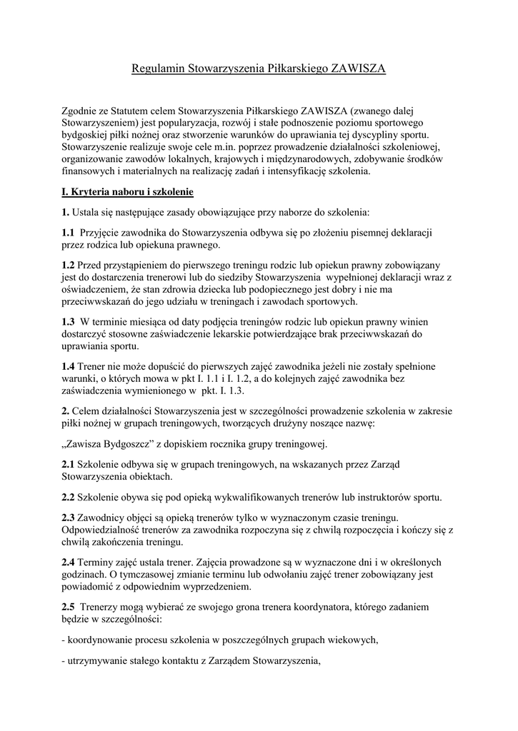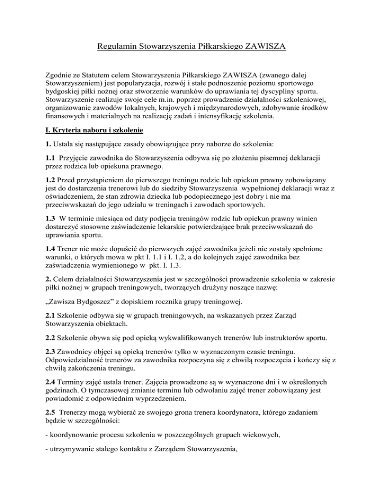 Regulamin Stowarzyszenia Piłkarskiego ZAWISZA Zgodnie ze Statutem celem Stowarzyszenia Piłkarskiego ZAWISZA (zwanego dalej Stowarzyszeniem) jest popularyzacja, rozwój i stałe podnoszenie poziomu sportowego bydgoskiej piłki nożnej oraz stworzenie warunków do uprawiania tej dyscypliny sportu. Stowarzyszenie realizuje swoje cele m.in. poprzez prowadzenie działalności szkoleniowej, organizowanie zawodów lokalnych, krajowych i międzynarodowych, zdobywanie środków finansowych i materialnych na realizację zadań i intensyfikację szkolenia. I. Kryteria naboru i szkolenie 1. Ustala się następujące zasady obowiązujące przy naborze do szkolenia: 1.1 Przyjęcie zawodnika do Stowarzyszenia odbywa się po złożeniu pisemnej deklaracji przez rodzica lub opiekuna prawnego. 1.2 Przed przystąpieniem do pierwszego treningu rodzic lub opiekun prawny zobowiązany jest do dostarczenia trenerowi lub do siedziby Stowarzyszenia wypełnionej deklaracji wraz z oświadczeniem, że stan zdrowia dziecka lub podopiecznego jest dobry i nie ma przeciwwskazań do jego udziału w treningach i zawodach sportowych. 1.3 W terminie miesiąca od daty podjęcia treningów rodzic lub opiekun prawny winien dostarczyć stosowne zaświadczenie lekarskie potwierdzające brak przeciwwskazań do uprawiania sportu. 1.4 Trener nie może dopuścić do pierwszych zajęć zawodnika jeżeli nie zostały spełnione warunki, o których mowa w pkt I. 1.1 i I. 1.2, a do kolejnych zajęć zawodnika bez zaświadczenia wymienionego w pkt. I. 1.3. 2. Celem działalności Stowarzyszenia jest w szczególności prowadzenie szkolenia w zakresie piłki nożnej w grupach treningowych, tworzących drużyny noszące nazwę: „Zawisza Bydgoszcz” z dopiskiem rocznika grupy treningowej. 2.1 Szkolenie odbywa się w grupach treningowych, na wskazanych przez Zarząd Stowarzyszenia obiektach. 2.2 Szkolenie obywa się pod opieką wykwalifikowanych trenerów lub instruktorów sportu. 2.3 Zawodnicy objęci są opieką trenerów tylko w wyznaczonym czasie treningu. Odpowiedzialność trenerów za zawodnika rozpoczyna się z chwilą rozpoczęcia i kończy się z chwilą zakończenia treningu. 2.4 Terminy zajęć ustala trener. Zajęcia prowadzone są w wyznaczone dni i w określonych godzinach. O tymczasowej zmianie terminu lub odwołaniu zajęć trener zobowiązany jest powiadomić z odpowiednim wyprzedzeniem. 2.5 Trenerzy mogą wybierać ze swojego grona trenera koordynatora, którego zadaniem będzie w szczególności: - koordynowanie procesu szkolenia w poszczególnych grupach wiekowych, - utrzymywanie stałego kontaktu z Zarządem Stowarzyszenia, - zgłaszanie inicjatyw i uwag dotyczących spraw szkoleniowych, propozycji udziału w rozgrywkach, udzielanie pomocy w organizacji wyjazdów na mecze, turnieje i obozy treningowe. 2.6 Do programu szkolenia mogą zostać wprowadzone, jako uzupełniające, zajęcia w innych dyscyplinach sportu, podnoszące ogólną sprawność zawodników. Zajęcia dodatkowe mogą być odpłatne lub nieodpłatne. Decyzję w sprawie zasad wprowadzenia do programu szkolenia zajęć dodatkowych podejmuje Zarząd Stowarzyszenia po konsultacji z trenerem koordynatorem i trenerami grup. II. Opłaty 1. Opłaty które są wnoszone przez rodziców lub opiekunów prawnych pomagają w finansowaniu Stowarzyszenia i są przeznaczane na realizację programu szkolenia oraz celów statutowych. 2. Wprowadza się następujące zasady określające wysokość opłat i sposób ich regulowania: 2.1 Wysokość miesięcznej opłaty zawodniczej ustala Zarząd Stowarzyszenia w formie uchwały, która z chwilą jej podjęcia stanowi załącznik do niniejszego regulaminu. 2.2 Miesięczne opłaty zawodnicze powinny być uiszczane z góry, w terminie do 15-tego dnia danego miesiąca gotówką u trenera lub innej osoby upoważnionej przez Zarząd Stowarzyszeni, za stosownym pokwitowaniem. 2.3 W przypadku braku możliwości wniesienia opłaty zawodniczej rodzic lub opiekun prawny winien złożyć u trenera pisemne wyjaśnienie skierowane do Zarządu Stowarzyszenia wraz z deklaracją terminu uregulowania zaległości. 2.4 Stowarzyszenie nie zwraca opłaty za kilkudniowe nieobecności zawodnika na treningu. W przypadku absencji na zajęciach w wyniku choroby lub kontuzji dłuższej niż dwa tygodnie wysokość opłaty należy uzgodnić z Zarządem Stowarzyszenia.. 2.5 W przypadku szkolenia rodzeństwa, rodzice lub opiekunowie prawni są zwolnieni z opłaty za kolejne dziecko. W przypadku szkolenia drugiego lub kolejnego dziecka w Spółce WKS Zawisza Bydgoszcz S.A opłata wynosi 50% miesięcznej stawki. 2.6 Zarząd Stowarzyszenia może w uzasadnionych przypadkach (trudna sytuacja materialna, zdrowotna, rodzinna, zdarzenie losowe) podjąć decyzję o stałym lub o okresowym zmniejszeniu wysokości opłaty lub o zwolnieniu z jej uiszczania. Powyższe może nastąpić na pisemny wniosek wraz z uzasadnieniem, złożony przez trenera, rodzica lub opiekuna prawnego zawodnika. 2.7 W przypadku rezygnacji ze szkolenia, nie zakwalifikowania do szkolenia lub wykreślenia z listy zawodników przez Zarząd Stowarzyszenia, opłata zawodnicza wniesiona za dany miesiąc nie podlega zwrotowi. 2.8 Za miesiące wakacyjne (lipiec i sierpień) opłata zawodnicza nie jest pobierana. W przypadku podjęcia decyzji o prowadzeniu zajęć w tych miesiącach Zarząd Stowarzyszenia podejmie uchwałę w sprawie terminu i zasad prowadzenia szkolenia oraz wysokości ewentualnej opłaty. III Obozy treningowe i wyjazdy na mecze i turnieje towarzyskie. 1. Decyzję w sprawie organizacji obozu treningowego i wyjazdu na turniej towarzyski podejmuje Zarząd Stowarzyszenia. 1.1 Organizatorem wyjazdów na mecze i turnieje towarzyskie jest Zarząd Stowarzyszenia. Wyjątek może stanowić sytuacja gdy rodzic lub opiekun prawny zawodnika złoży pisemne oświadczenie, iż zapewni przewóz dziecka na mecz lub turniej własnym środkiem transportu i zapewni mu zakwaterowanie i wyżywienie or