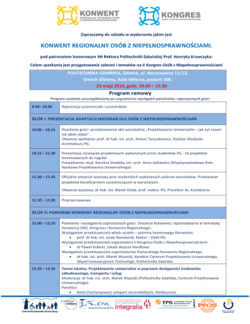 Zapraszamy do udziału w wydarzeniu jakim jest KONWENT REGIONALNY OSÓB Z NIEPEŁNOSPRAWNOŚCIAMI, pod patronatem honorowym JM Rektora Politechniki Gdańskiej Prof. Henryka Krawczyka: Celem spotkania jest przygotowanie zaleceń i tematów na II Kongres Osób z Niepełnosprawnościami POLITECHNIKA GDAŃSKA, Gdańsk, ul. Narutowicza 11/12, Gmach Główny, Aula Główna, poziom 300, 23 maja 2016, godz. 10.00 – 15.30 Program ramowy Program zostanie uszczegółowiony po uzgodnieniu wystąpień panelistów i zaproszonych gości 9.30– 10.00 Rejestracja uczestniczek i uczestników BLOK I: PREZENTACJA ADAPTACJI MIESZKAŃ DLA OSÓB Z NIEPEŁNOSPRAWNOŚCIAMI 10.00 – 10.15 Powitanie gości i przedstawienie idei warsztatów „Projektowanie Uniwersalne – jak żyć razem nie obok siebie”. Otwarcie spotkania: prof. dr hab. inż. arch. Antoni Taraszkiewicz, Dziekan Wydziału Architektury PG. 10.15 – 11.30 Prezentacja rozwiązań projektowych wykonanych przez studentów PG - 10 projektów nominowanych do nagród. Prowadzenie: stud. Karolina Grodzka, inż. arch. Anna Jaśkiewicz (Międzywydziałowe Koło Naukowe Projektowania Uniwersalnego) 11.30 – 11.45 Oficjalne otwarcie wystawy prac studenckich wykonanych podczas warsztatów. Przekazanie projektów beneficjentom uczestniczącym w warsztatach. Otwarcie wystawy: dr hab. inż. Marek Dzida, prof. nadzw. PG, Prorektor ds. Kształcenia 11.30 – 12.00 Przerwa kawowa BLOK II: POMORSKI KONWENT REGIONALNY OSÓB Z NIEPEŁNOSPRAWNOŚCIAMI 12.00 – 12.20 Powitanie i wystąpienia zaproszonych gości. Otwarcie Konwentu: wprowadzenie w tematykę Konwencji ONZ, Kongresu i Konwentu Regionalnego:. Wystąpienie przedstawiciela władz uczelni – patrona honorowego Konwentu: prof. dr hab. inż. Jacek Namieśnik, Rektor – Elekt PG. Wystąpienie przedstawiciela organizatora II Kongresu Osób z Niepełnosprawnościami: dr Paweł Kubicki, Szkoła Wyższa Handlowa Wystąpienie przedstawiciela organizatorów Pomorskiego Konwentu Regionalnego: dr hab. inż. arch. Marek Wysocki, dyrektor Centrum Projektowania Uniwersalnego, Węzeł Innowacyjnych Technologii, Politechnika Gdańska 12.20 – 13.20 Temat lokalny: Projektowanie uniwersalne w poprawie dostępności środowiska zabudowanego, transportu i usług: Moderacja: dr hab. inż. arch. Marek Wysocki (Politechnika Gdańska, Centrum Projektowania Uniwersalnego) Paneliści: Rafał Charłampowicz (ekspert AccessibilityOz, Melbourne), Maciej Kasperkowiak (Polska Fundacja Osób Słabosłyszących), Jolanta Urbańska (Fundacja Podróże bez Granic, Fundacja TUS), Beata Wachowiak-Zwara (Pełnomocnik Prezydenta Miasta Gdyni ds. Osób Niepełnosprawnych). Dyskusja 13.20 – 13.35 Ogłoszenie wyników i wręczenie nagród w konkursie studenckim na najlepiej zaaranżowaną przestrzeń mieszkalną wykonaną podczas warsztatów partycypacyjnych „Projektowanie uniwersalne – jak żyć razem nie obok siebie” Wystąpienie beneficjenta projektu nagrodzonego nagrodą Grand Prix, 13.35 – 13.50 Przerwa kawowa 13.50 – 14.50 Temat wspólny dla Konwentów: Orzecznictwo i system wsparcia osób z niepełnosprawnościami. Moderacja: dr Paweł Kubicki (Szkoła Główna Handlowa, Stowarzyszenie Nie-Grzeczne Dzieci). Paneliści: mec. Katarzyna Heba (doktorantka Wydziału Prawa Uniwersytetu w Białymstoku), Danuta Kłopocka (Prezeska Fundacji ADAPA), Agnieszka Zborowska (Agencja Pośrednictwa Pracy Fundacji Integralia), Dyskusja 14.50 – 15.20. Dyskusja na wszelkie tematy zgłaszane przez uczestników i zgłaszanie tematów do sesji równoległych na II Kongresie Osób z Niepełnosprawnościami. 15.20 – 15.30 Podsumowanie i zakończenie Konwentu Regionalnego. Równolegle z Pomorskim Konwentem Regionalnym odbędą się warsztaty symulacyjne dla studentów Wydziału Architektury organizowane przez Fundację Polska bez Barier i firmę TechnoNICOL. Miejsce spotkania jest dostępne dla osób mających trudności z poruszaniem się. Zapewniamy tłumacza polskiego języka migowego i pętlę indukcyjną. Udział w Konwencie jest bezpłatny. Wypełniony formularz zgłoszeniowy należy przesłać do 19 maja 2016 r. na adres mail: [email protected] lub faksem na nr tel.: 58 348 61 63 Więcej aktualnych szczegółów na temat Kongresu można znaleźć na stronie www.konwencja.org Serdecznie zapraszamy! PATRONAT HONOROWY: WSPARCIA ORGANIZATOROM UDZIELILI: ORGANIZATORZY KONWENTU REGIONALNEGO