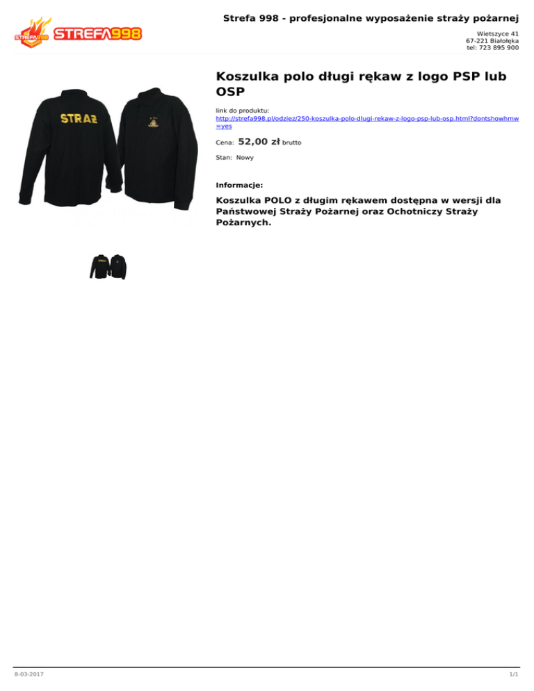 Strefa 998 - profesjonalne wyposażenie straży pożarnej Wietszyce 41 67-221 Białołęka tel: 723 895 900 Koszulka polo długi rękaw z logo PSP lub OSP link do produktu: http://strefa998.pl/odziez/250-koszulka-polo-dlugi-rekaw-z-logo-psp-lub-osp.html?dontshowhmw =yes Cena: 52,00 zł brutto Stan: Nowy Informacje: Koszulka POLO z długim rękawem dostępna w wersji dla Państwowej Straży Pożarnej oraz Ochotniczy Straży Pożarnych. 8-03-2017 1/1