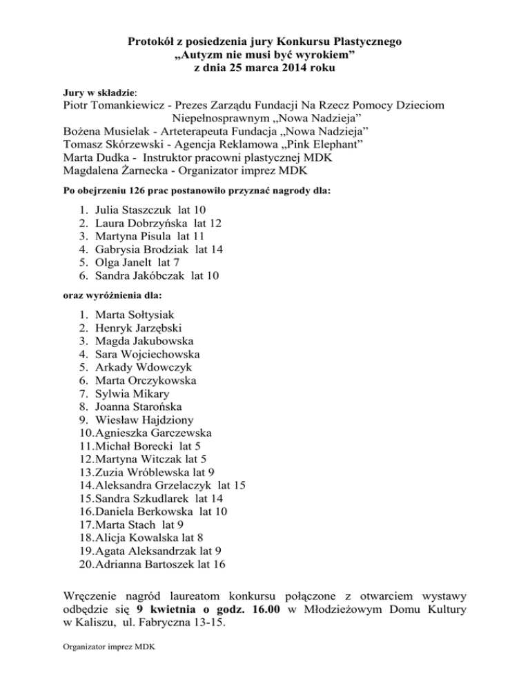 Protokół z posiedzenia jury Konkursu Plastycznego „Autyzm nie musi być wyrokiem” z dnia 25 marca 2014 roku Jury w składzie: Piotr Tomankiewicz - Prezes Zarządu Fundacji Na Rzecz Pomocy Dzieciom Niepełnosprawnym „Nowa Nadzieja” Bożena Musielak - Arteterapeuta Fundacja „Nowa Nadzieja” Tomasz Skórzewski - Agencja Reklamowa „Pink Elephant” Marta Dudka - Instruktor pracowni plastycznej MDK Magdalena Żarnecka - Organizator imprez MDK Po obejrzeniu 126 prac postanowiło przyznać nagrody dla: 1. 2. 3. 4. 5. 6. Julia Staszczuk lat 10 Laura Dobrzyńska lat 12 Martyna Pisula lat 11 Gabrysia Brodziak lat 14 Olga Janelt lat 7 Sandra Jakóbczak lat 10 oraz wyróżnienia dla: 1. Marta Sołtysiak 2. Henryk Jarzębski 3. Magda Jakubowska 4. Sara Wojciechowska 5. Arkady Wdowczyk 6. Marta Orczykowska 7. Sylwia Mikary 8. Joanna Starońska 9. Wiesław Hajdziony 10.Agnieszka Garczewska 11.Michał Borecki lat 5 12.Martyna Witczak lat 5 13.Zuzia Wróblewska lat 9 14.Aleksandra Grzelaczyk lat 15 15.Sandra Szkudlarek lat 14 16.Daniela Berkowska lat 10 17.Marta Stach lat 9 18.Alicja Kowalska lat 8 19.Agata Aleksandrzak lat 9 20.Adrianna Bartoszek lat 16 Wręczenie nagród laureatom konkursu połączone z otwarciem wystawy odbędzie się 9 kwietnia o godz. 16.00 w Młodzieżowym Domu Kultury w Kaliszu, ul. Fabryczna 13-15. Organizator imprez MDK Magdalena Żarnecka