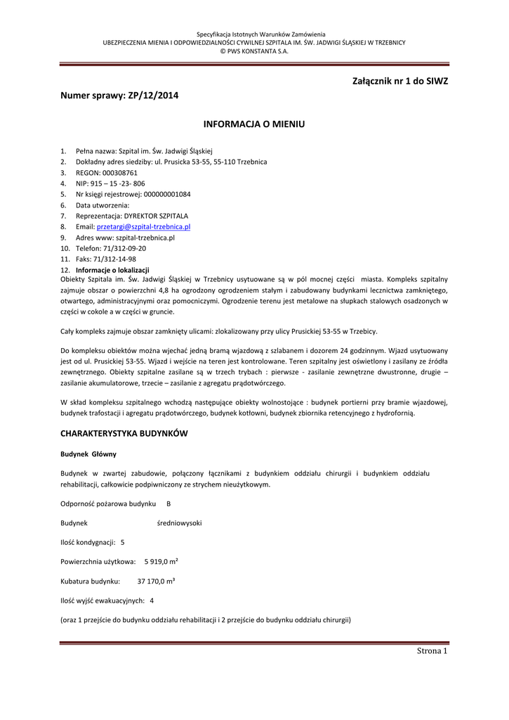 Specyfikacja Istotnych Warunków Zamówienia UBEZPIECZENIA MIENIA I ODPOWIEDZIALNOŚCI CYWILNEJ SZPITALA IM. ŚW. JADWIGI ŚLĄSKIEJ W TRZEBNICY © PWS KONSTANTA S.A. Załącznik nr 1 do SIWZ Numer sprawy: ZP/12/2014 INFORMACJA O MIENIU 1. Pełna nazwa: Szpital im. Św. Jadwigi Śląskiej 2. Dokładny adres siedziby: ul. Prusicka 53-55, 55-110 Trzebnica 3. REGON: 000308761 4. NIP: 915 – 15 -23- 806 5. Nr księgi rejestrowej: 000000001084 6. Data utworzenia: 7. Reprezentacja: DYREKTOR SZPITALA 8. Email: [email protected] 9. Adres www: szpital-trzebnica.pl 10. Telefon: 71/312-09-20 11. Faks: 71/312-14-98 12. Informacje o lokalizacji Obiekty Szpitala im. Św. Jadwigi Śląskiej w Trzebnicy usytuowane są w pól mocnej części miasta. Kompleks szpitalny zajmuje obszar o powierzchni 4,8 ha ogrodzony ogrodzeniem stałym i zabudowany budynkami lecznictwa zamkniętego, otwartego, administracyjnymi oraz pomocniczymi. Ogrodzenie terenu jest metalowe na słupkach stalowych osadzonych w części w cokole a w części w gruncie. Cały kompleks zajmuje obszar zamknięty ulicami: zlokalizowany przy ulicy Prusickiej 53-55 w Trzebicy. Do kompleksu obiektów można wjechać jedną bramą wjazdową z szlabanem i dozorem 24 godzinnym. Wjazd usytuowany jest od ul. Prusickiej 53-55. Wjazd i wejście na teren jest kontrolowane. Teren szpitalny jest oświetlony i zasilany ze źródła zewnętrznego. Obiekty szpitalne zasilane są w trzech trybach : pierwsze - zasilanie zewnętrzne dwustronne, drugie – zasilanie akumulatorowe, trzecie – zasilanie z agregatu prądotwórczego. W skład kompleksu szpitalnego wchodzą następujące obiekty wolnostojące : budynek portierni przy bramie wjazdowej, budynek trafostacji i agregatu prądotwórczego, budynek kotłowni, budynek zbiornika retencyjnego z hydrofornią. CHARAKTERYSTYKA BUDYNKÓW Budynek Główny Budynek w zwartej zabudowie, połączony łącznikami z budynkiem oddziału chirurgii i budynkiem oddziału rehabilitacji, całkowicie podpiwniczony ze strychem nieużytkowym. Odporność pożarowa budynku Budynek B średniowysoki Ilość kondygnacji: 5 Powierzchnia użytkowa: Kubatura budynku: 5 919,0 m² 37 170,0 m³ Ilość wyjść ewakuacyjnych: 4 (oraz 1 przejście do budynku oddziału rehabilitacji i 2 przejście do budynku oddziału chirurgii) Strona 1 Specyfikacja Istotnych Warunków Zamówienia UBEZPIECZENIA MIENIA I ODPOWIEDZIALNOŚCI CYWILNEJ SZPITALA IM. ŚW. JADWIGI ŚLĄSKIEJ W TRZEBNICY © PWS KONSTANTA S.A. Konstrukcja dachu: betonowo-stalowa Pokrycie dachu: dachówka i papa Konstrukcja ścian: murowana z elementów ceramicznych Konstrukcja stropów: masywne żelbetowe oparte na ścianach nośnych W budynku jest instalacja gazowa –nieczynna, niezagazowana Budynek posiada klapy dymowe Zaopatrzenie wodne: hydranty sieci miejskiej, w przypadku zaniku zasilania z sieci zewnętrznej zasilanie jest ze zbiornika retencyjnego z hydrofornią Budynek Główny podzielony jest na 4 cztery strefy pożarowe. Podręczny sprzęt gaśniczy: - piwnica - hydrant Ø 25 mm (3 szt.) gaśnica proszkowa 4 kg -15 szt. Gaśnica proszkowa 6 kg -3 szt. Gaśnica śniegowa 5 kg -13 szt. Urządzenie gaśnicze śniegowe 2 kg – 1 szt. - parter - hydrant Ø 25 mm ( 3 szt.) gaśnica proszkowa 4 kg -10 szt. - I piętro – hydrant Ø 25 mm (3 szt.) gaśnica proszkowa 4 kg -10 szt. - II piętro – hydrant Ø 25 mm (3 szt.) gaśnica proszkowa 4 kg – 8 szt. - III piętro – hydrant Ø 25 mm (3 szt.) gaśnica proszkowa 4 kg -8 szt. Wskazane w opisach klasy odporności pożarowej spełniają następujące warunki: Klasa Klasa odporności ogniowej elementów budynku odporności konstrukcja konstrukcja dachu strop zewnętrzna wewnętrzna R 30 R E I 60 E I 60 E I 30 pożarowej ściana 1), 2) główna 1) ściana pokrycie 1) 3) dachu budynku nośna „B” R 120 4) E 30 Strona 2 Specyfikacja Istotnych Warunków Zamówienia UBEZPIECZENIA MIENIA I ODPOWIEDZIALNOŚCI CYWILNEJ SZPITALA IM. ŚW. JADWIGI ŚLĄSKIEJ W TRZEBNICY © PWS KONSTANTA S.A. Oznaczenia w tabeli: R – nośność ogniowa (w minutach), określona zgodnie z Polską Normą dotyczącą zasad ustalania klas odporności ogniowej elementów budynku. E – szczelność ogniowa (w minutach), określona jw., I – izolacyjność ogniowa (w minutach), określona jw., (-) – nie stawia się wymagań INSTALACJE TECHNICZNE Ogrzewanie i instalacja gazu ziemnego Instalacja co zasilana z kotłowni centralnej, brak instalacji gazu ziemnego Instalacja wodna Instalacja zimnej i ciepłej wody użytkowej z sieci miejskiej Instalacja tlenowa Instalacja tlenowa wewnętrzna Instalacja elektryczna Instalacja elektryczna wewnętrzna Urządzenia i instalacje przeciwpożarowe Instalacja p.poż. hydrantowa Pozostałe instalacje: Antenowa, telefoniczna, sygnalizacji ciśnienia gazów medycznych, odgromowa, sygnalizacja mechanicznej, gazów medycznych : tlenu, sprężonego powietrza i próżni. przywoławcza, wentylacji Budynek Oddziału Chirurgii Budynek w zwartej zabudowie, połączony łącznikami z budynkiem oddziału chirurgii i budynkiem oddziału rehabilitacji, całkowicie podpiwniczony ze strychem nieużytkowym. Odporność pożarowa budynku Budynek B średniowysoki Ilość kondygnacji: 3 Powierzchnia użytkowa: Kubatura budynku: 4 393,2 m² 20 545,4 m³ Ilość wyjść ewakuacyjnych: 5 (oraz 2 przejście do budynku głównego) Konstrukcja dachu: betonowo-stalowa Pokrycie dachu: dachówka i papa Konstrukcja ścian: murowana z elementów ceramicznej Konstrukcja stropów: gęsto żebrowe oparte na ścianach nośnych Strona 3 Specyfikacja Istotnych Warunków Zamówienia UBEZPIECZENIA MIENIA I ODPOWIEDZIALNOŚCI CYWILNEJ SZPITALA IM. ŚW. JADWIGI ŚLĄSKIEJ W TRZEBNICY © PWS KONSTANTA S.A. W budynku jest instalacja gazowa –brak Budynek posiada klapy dymowe Zaopatrzenie wodne: hydranty sieci miejskiej, w przypadku zaniku zasilania z sieci zewnętrznej zasilanie jest ze zbiornika retencyjnego z hydrofornią Budynek Oddziału Chirurgii podzielo