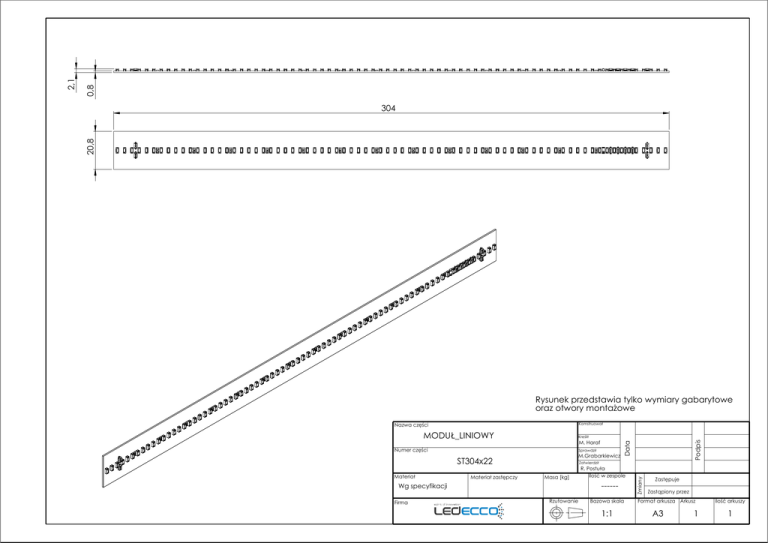 Rysunek przedstawia tylko wymiary gabarytowe oraz otwory montażowe Komstruował Nazwa części MODUŁ_LINIOWY M. Haraf Numer części Sprawdził M.Grabarkiewicz ST304x22 Materiał zastępczy Zatwierdził Masa [kg] ------ Wg specyfikacji Firma R. Postuła Ilość w zespole Rzutowanie Bazowa skala 1:1 Zmiany Materiał Podpis Kreślił Data 2,1 0,8 20,8 304 Zastępuje Zastąpiony przez Format arkusza Arkusz A3 1 Ilość arkuszy 1