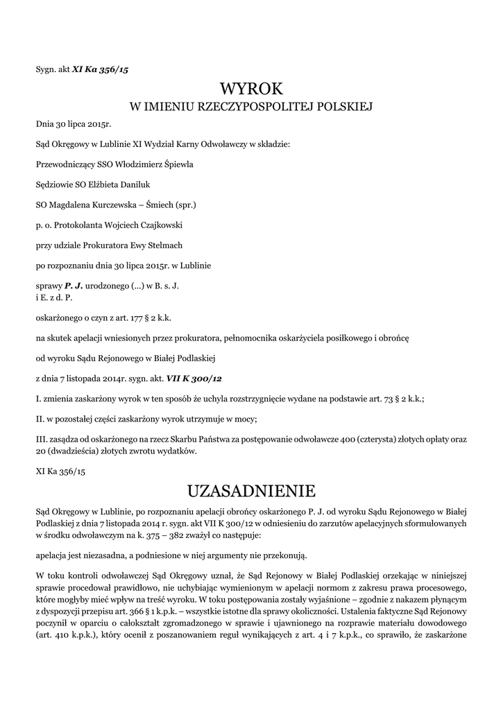 Sygn. akt XI Ka 356/15 WYROK W IMIENIU RZECZYPOSPOLITEJ POLSKIEJ Dnia 30 lipca 2015r. Sąd Okręgowy w Lublinie XI Wydział Karny Odwoławczy w składzie: Przewodniczący SSO Włodzimierz Śpiewla Sędziowie SO Elżbieta Daniluk SO Magdalena Kurczewska – Śmiech (spr.) p. o. Protokolanta Wojciech Czajkowski przy udziale Prokuratora Ewy Stelmach po rozpoznaniu dnia 30 lipca 2015r. w Lublinie sprawy P. J. urodzonego (...) w B. s. J. i E. z d. P. oskarżonego o czyn z art. 177 § 2 k.k. na skutek apelacji wniesionych przez prokuratora, pełnomocnika oskarżyciela posiłkowego i obrońcę od wyroku Sądu Rejonowego w Białej Podlaskiej z dnia 7 listopada 2014r. sygn. akt. VII K 300/12 I. zmienia zaskarżony wyrok w ten sposób że uchyla rozstrzygnięcie wydane na podstawie art. 73 § 2 k.k.; II. w pozostałej części zaskarżony wyrok utrzymuje w mocy; III. zasądza od oskarżonego na rzecz Skarbu Państwa za postępowanie odwoławcze 400 (czterysta) złotych opłaty oraz 20 (dwadzieścia) złotych zwrotu wydatków. XI Ka 356/15 UZASADNIENIE Sąd Okręgowy w Lublinie, po rozpoznaniu apelacji obrońcy oskarżonego P. J. od wyroku Sądu Rejonowego w Białej Podlaskiej z dnia 7 listopada 2014 r. sygn. akt VII K 300/12 w odniesieniu do zarzutów apelacyjnych sformułowanych w środku odwoławczym na k. 375 – 382 zważył co następuje: apelacja jest niezasadna, a podniesione w niej argumenty nie przekonują. W toku kontroli odwoławczej Sąd Okręgowy uznał, że Sąd Rejonowy w Białej Podlaskiej orzekając w niniejszej sprawie procedował prawidłowo, nie uchybiając wymienionym w apelacji normom z zakresu prawa procesowego, które mogłyby mieć wpływ na treść wyroku. W toku postępowania zostały wyjaśnione – zgodnie z nakazem płynącym z dyspozycji przepisu art. 366 § 1 k.p.k. – wszystkie istotne dla sprawy okoliczności. Ustalenia faktyczne Sąd Rejonowy poczynił w oparciu o całokształt zgromadzonego w sprawie i ujawnionego na rozprawie materiału dowodowego (art. 410 k.p.k.), który ocenił z poszanowaniem reguł wynikających z art. 4 i 7 k.p.k., co sprawiło, że zaskarżone rozstrzygnięcie zapadło w oparciu o prawidłowe ustalenia faktyczne dotyczące sprawstwa oskarżonego. Ponadto swoje stanowisko Sąd Rejonowy w sposób należyty uzasadnił w pisemnych motywach wyroku, sporządzonych zgodnie z wymogami art. 424 § 1 i 2 k.p.k. Zasadnie wskazuje obrońca oskarżonego na konieczność czynienia ustaleń faktycznych dotyczących związku pomiędzy naruszeniem zasad bezpieczeństwa w ruchu drogowym a zaistniałym skutkiem. Sąd Okręgowy w pełni podziela przytoczone orzecznictwo Sądu Najwyższego, konkludując jednak odmiennie od stanowiska skarżącego, że ustalenia faktyczne poczynione przez Sąd Rejonowy, który przyjął umyślne naruszenie zasad bezpieczeństwa ruchu drogowego i związek przyczynowy pomiędzy tym naruszeniem a zdarzeniem drogowym w wyniku, którego M. G. poniósł śmierć, są prawidłowe. Wbrew twierdzeniom obrońcy oskarżonego Sąd Rejonowy prawidłowo ustalił, że oskarżony dysponując wyłącznie prawem jazdy kategorii B dopuścił się umyślnego naruszenia zasad ruchu drogowego poprzez poruszanie się pojazdem nienormatywnym, bez wymaganych do tego uprawnień oraz bez należytego oświetlenia i oznaczenia w/w maszyny. Nie budzi wątpliwości w świetle opinii biegłych J. W. oraz J. K. (1), że ciągnik z maszyną rolniczą tzw. talerzówką hydrauliczną stanowił, z uwagi na swoje gabaryty, pojazd nienormatywny, ze swej istoty wyposażony w światło odblaskowe na dachu ciągnika, mające przecież za zadanie zwiększenie jego widoczności, z uwagi na wymiary samego ciągnika 3,3 m będącego nawet bez brony talerzowej pojazdem nienormatywnym (k. 266 opinia biegłego). Wraz z zamontowaną broną talerzową, nawet w stanie złożonym, gabaryty tak poruszającego się ciągnika z maszyną rolniczą miały ponad 5 m (opinia biegłego k. 300v). Bezwzględnie zatem, dla poruszania się takiego typu pojazdu, oskarżony winien dopełnić wymagania wskazane w art. 64 prawa o ruchu drogowym. Zgodnie z treścią w/w normy, stanowiącej przecież gwarant bezpieczeństwa w ruchu drogowym, ruch pojazdu nienormatywnego jest dozwolony pod warunkiem zezwolenia wydanego w drodze decyzji administracyjnej, pilotowania pojazdu, gdy przekracza on szerokością 3,2m, zachowania szczególnej ostrożności przez kierującego pojazdem nienormatywnym. P. J. wyjeżdżając na drogę publiczną nie wypełnił żadnego ze wskazanych wyżej nakazów. Co więcej, jak wynika z jego wyjaśnień oskarżonego, oprócz świateł mijania nie włączył nawet żółtego oświetlenia na dachu ciągnika, bo jak podał uznał, że jest jeszcze widno. Właściwie, choć w sposób nie odnoszący się do przepisów prawa o ruchu drogowym, Sąd Rejonowy wskazał, że oskarżony będąc po szkoleniu teoretycznym i praktycznym, które warunkowało uzyskanie przez niego prawa jazdy, znał wskazaną wyżej normę prawa o ruchu drogowym, z której wynikają nakazy warunkujące bezpieczne poruszanie się pojazdu nienormatywnego. Złamał ją w sposób umyślny, mając pełną świadomość niebezpieczeństwa jakie stworzył na drodze, płynącego nie tylko z przepisów prawa ale także zaleceń właściciela pojazdu, który choć także wykazał się ignorancją dotyczącą reguł ruchu drogowego, to jednak nakazywał poruszanie się w/w sprzętem rolniczym po drogach bocznych. Pomijanie przez skarżącego ewidentnego złamania zasad bezpieczeństwa w ruchu drogowym związanych z poruszaniem się pojazdów nienormatywnych, stanowi o bezzasadności kwestionowania prawidłowego ustalenia Sądu I instancji. Podnoszony przez skarżącego element, że P. J. zjechał przed wypadkiem na pobocze drogi, co skutkowało, że inne samochody go minęły, nie uchyla przecież faktu, że przy tej postaci pojazdu , P. J. w ogóle nie powinien być uczestnikiem ruchu drogowego, co zasadnie podnos