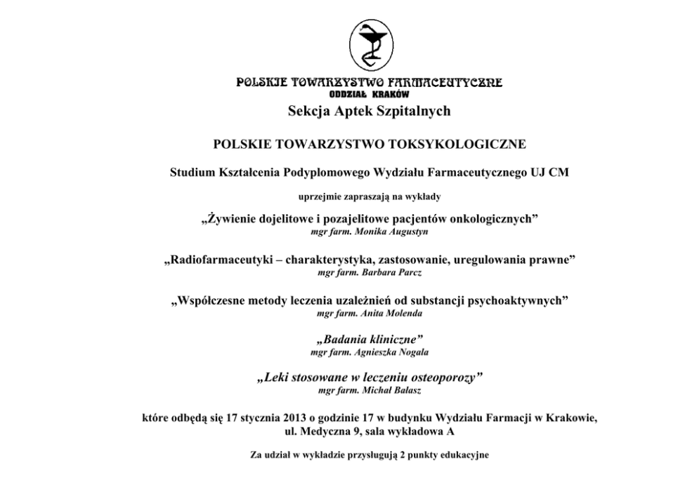 Sekcja Aptek Szpitalnych POLSKIE TOWARZYSTWO TOKSYKOLOGICZNE Studium Kształcenia Podyplomowego Wydziału Farmaceutycznego UJ CM uprzejmie zapraszają na wykłady „Żywienie dojelitowe i pozajelitowe pacjentów onkologicznych” mgr farm. Monika Augustyn „Radiofarmaceutyki – charakterystyka, zastosowanie, uregulowania prawne” mgr farm. Barbara Parcz „Współczesne metody leczenia uzależnień od substancji psychoaktywnych” mgr farm. Anita Molenda „Badania kliniczne” mgr farm. Agnieszka Nogala „Leki stosowane w leczeniu osteoporozy” mgr farm. Michał Bałasz które odbędą się 17 stycznia 2013 o godzinie 17 w budynku Wydziału Farmacji w Krakowie, ul. Medyczna 9, sala wykładowa A Za udział w wykładzie przysługują 2 punkty edukacyjne
