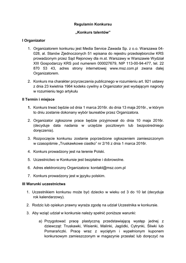 Regulamin Konkursu „Konkurs talentów” I Organizator 1. Organizatorem konkursu jest Media Service Zawada Sp. z o.o. Warszawa 04028, al. Stanów Zjednoczonych 51 wpisana do rejestru przedsiębiorców KRS prowadzonym przez Sąd Rejonowy dla m.st. Warszawy w Warszawie Wydział XIII Gospodarczy KRS pod numerem 000027679, NIP 113-00-94-477, tel. 22 870 53 43, adres strony internetowej www.msz.com.pl zwana dalej Organizatorem. 2. Konkurs ma charakter przyrzeczenia publicznego w rozumieniu art. 921 ustawy z dnia 23 kwietnia 1964 kodeks cywilny a Organizator jest wydającym nagrody w rozumieniu tego artykułu II Termin i miejsce 1. Konkurs trwać będzie od dnia 1 marca 2016r. do dnia 13 maja 2016r., w którym to dniu zostanie dokonany wybór laureatów przez Organizatora. 2. Organizator zgłoszone prace będzie przyjmował do dnia 10 maja 2016r. (decyduje data nadania w urzędzie pocztowym lub bezpośredniego doręczenia). 3. Rozpoczęcie konkursu zostanie poprzedzone ogłoszeniem zamieszczonym w czasopiśmie „Truskawkowe ciastko” nr 2/16 z dnia 1 marca 2016r. 4. Konkurs prowadzony jest na terenie Polski. 5. Uczestnictwo w Konkursie jest bezpłatne i dobrowolne. 6. Adres elektroniczny Organizatora: [email protected] 7. Konkurs prowadzony jest w języku polskim. III Warunki uczestnictwa 1. Uczestnikiem konkursu może być dziecko w wieku od 3 do 10 lat (decyduje rok kalendarzowy). 2. Rodzic lub opiekun prawny wyraża zgodę na udział Uczestnika w konkursie. 3. Aby wziąć udział w konkursie należy spełnić poniższe warunki: a) Przygotować pracę plastyczną przedstawiającą występ jednej z dziewcząt: Truskawki, Wisienki, Malinki, Jagódki, Cytrynki, Śliwki lub Pomarańczki. Pracę wraz z wyciętym i wypełnionym kuponem konkursowym zamieszczonym w magazynie przesłać lub doręczyć na adres: Konkurs talentów, Media Service Zawada Sp. z o.o., al. Stanów Zjednoczonych 51, 04-028 Warszawa, b) Na przesyłce czytelnie napisać swoje imię, nazwisko oraz adres dla doręczeń (adres zamieszkania lub pobytu), c) Kupon konkursowy powinien być wypełniony przez rodzica lub opiekuna prawnego. d) Każdy Uczestnik może wysłać dowolną ilość prac. e) Regulamin w PDF jest dostępny na stronie www.msz.com.pl (wejście przez zakładkę „Konkursy”) oraz jest udostępniony w siedzibie Organizatora. Uczestnik przed wzięciem udziału w Konkursie powinien zapoznać się z jego treścią. Regulamin może być pobrany w wersji PDF. f) Biorąc udział w Konkursie, Uczestnik nie będzie dostarczać treści bezprawnych, w szczególności używać obraźliwych oznaczeń UWAGA: Z uwagi na fakt, iż Uczestnikiem Konkursu może być osoba małoletnia, poniżej 18 lat, z Regulaminem Konkursu oraz Polityką prywatności powinien zapoznać się rodzic albo opiekun prawny. Określone czynności powinny być podejmowane przez rodzica (opiekuna prawnego) albo być przez niego potwierdzone. 4. Uczestnikowi nie przysługuje zwrot kosztów wykonania i przesłania prac. 5. Organizator ma prawo do konkursu i ich publikacji. zatrzymania oryginału prac zgłoszonych IV Wyłonienie laureata 1. Organizator w terminie do 13 maja wyłoni 6 laureatów. 2. Spośród Uczestników Konkursu, którzy dokonali Zgłoszenia do Konkursu. Nagroda przyznana zostanie temu Uczestnikowi, którego odpowiedź na zadanie Konkursowe zostanie uznana za najciekawszą, i która najpełniej spełniła kryteria Konkursu opisane poniżej. Laureatów Konkursu wybierze Komisja Konkursowa, składająca się z 3-5 osób, która przy wyborze Laureata będzie kierowała się następującymi kryteriami: • zgodność merytoryczna, • oryginalność, pomysłowość, • kreatywność, • poprawność językowa. 3. Przy wyborze Laureata nie ma znaczenia kolejność zgłoszeń. 4. Organizator sporządzi listę laureatów zawierającą imiona, nazwiska i adresy dla doręczeń laureatów, rodzaj przyznanej nagrody, datę i podpis osoby sporządzającej listę. 5. Informacja o otrzymaniu nagrody głównej lub nagród dodatkowych zostanie przesłana na adres e-mail Uczestnika lub rodzica/opiekuna prawnego podany w kuponie konkursowym oraz zostanie opublikowana wraz z imieniem, nazwiskiem, miejscowością zamieszkania w czasopiśmie „Truskawkowe ciastko” nr 4/16 z dnia 27.06.2016r. lub na stronie internetowej. V Nagrody 1. Laureaci konkursu otrzymają nagrody w postaci: a) 2 lalek Barbie z serii „Tajne Agentki” ufundowanych przez firmę Mattel Poland Sp. z o.o. o wartości jednostkowej 90 zł brutto, b) 2 lalek Teresa z serii „Tajne Agentki” ufundowanych przez firmę Mattel Poland Sp. z o.o. o wartości jednostkowej 90 zł brutto, c) 2 lalek Renee z serii „Tajne Agentki” ufundowanych przez firmę Mattel Poland Sp. z o.o. o wartości jednostkowej 90 zł brutto, 2. Nagroda nie może zostać zamieniona na ekwiwalent pieniężny lub inną nagrodę rzeczową. 3. Jeden Uczestnik może otrzymać tylko jedną nagrodę. 4. Odbiór nagrody: nagroda zostanie przesłana pocztą – listem poleconym na koszt Organizatora w terminie 6 tygodni od daty opublikowania listy laureatów w numerze 4/2016 z dnia 27.06.2016 na podany adres dla doręczeń. VI Reklamacje 1. Każdemu Uczestnikowi przysługuje prawo wniesienia reklamacji związanej z rozstrzygnięciem konkursu. Konkursem. Reklamacje powinno składać się w terminie do 30 dni od dnia zakończenia Konkursu. 2. Reklamacje można zgłaszać do Organizatora: a) Drogą pocztową, pod adresem: Media Service Zawada sp. z o.o. siedzibą: 04-028 Warszawa, al. Stanów Zjednoczonych 51.albo z b) za pośrednictwem poczty elektronicznej: [email protected], albo c) faxem: +48 22 870 75 51. 3. W reklamacji należy zaznaczyć: „Reklamacja”, podać nazwę konkursu, wskazując co jest przedmiotem reklamacji . Uczestnik może też wskazać jakiego rozstrzygnięcia oczekuje od Organizatora. 4. Reklamacja zostanie rozpatrzona najpóźniej w ciągu 14 dni od jej otrzymania. 5. Powyższe terminy nie zmieniają