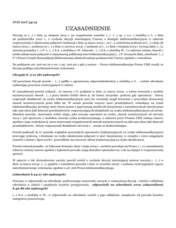 XVII AmT 54/14 UZASADNIENIE Decyzją nr (...) z dnia 14 sierpnia 2014 r, po rozpatrzeniu wniosku (...) (...) sp. z o.o. z siedzibą w Ł. z dnia 26 października 2010 r., o wydanie decyzji zmieniającej Umowę o dostępie telekomunikacyjnym w zakresie rozpoczynania i zakańczania połączeń i kolokacji z dnia 15 marca 2013 r., nr (...), zmienioną aneksem nr (...) z dnia 28 marca 2013 r., aneksem nr (...) z dnia 11 czerwca 2013r., i aneksem nr (...) z dnia 7 sierpnia 2013 r. (zwaną dalej (...)), zawartą pomiędzy (...) P. a (...) S.A. z siedzibą w W. (obecnie: (...) S.A. z siedzibą W. ) w zakresie zmiany stawek z tytułu zakańczania połączeń w stacjonarnej publicznej sieci telekomunikacyjnej (...) P. (zwanych dalej „stawkami (...) P.’) Prezes Urzędu Komunikacji Elektronicznej odmówił zmiany postanowień Umowy zgodnie z wnioskiem. Na podstawie art. 206 ust 2a w zw. z art. 206 ust 2 pkt 5 ustawy – Prawo telekomunikacyjne Prezes URE orzekł, że decyzja podlega natychmiastowemu wykonaniu. (decyzja k. 5-21 akt sądowych) Od powyższej decyzji powód - (...) spółka z ograniczoną odpowiedzialnością z siedzibą w Ł. - wniósł odwołanie zaskarżając powyższe rozstrzygnięcie w całości . W uzasadnieniu powód wskazał , że umowę z O. podpisał w dniu 15 marca 2013r. a zatem korzystał z modelu asymetrycznych stawek (...) przez bardzo krótki okres tj. do końca 2013roku- podczas gdy operatorzy , którzy rozpoczęli działalność na rynku telekomunikacyjnym parę lat wcześniej mogli korzystać z przywileju stosowania stawek asymetrycznych przez kilka lat. W ocenie powoda wszyscy nowi przedsiębiorcy wchodzący na rynek telekomunikacyjny powinny mieć równe szanse i zapewnioną możliwość korzystania z asymetrycznych stawek przez taki sam okres jaki dotyczył przedsiębiorców rozpoczynających działalność na rynku telekomunikacyjnym od 2009r. Zdaniem powoda, stosowanie wobec niego, jako nowego operatora na rynku, stawek symetrycznych od stycznia 2014 r. jest sprzeczne z modelem rozwoju rynku konkurencyjnego, a odmowę przez Prezesa UKE zmiany umowy zgodnie z jego wnioskiem tj. przez stosowanie uregulowanych stawek asymetrycznych na taki sam okres jaki dotyczył przedsiębiorców , którzy rozpoczynali działalność od 2009 r. - uważa za dyskryminujące. Powód podnosił, że O. posiada względem pozostałych operatorów funkcjonujących na rynku telekomunikacyjnym przewagę rynkową, i dominuje na rynku zakańczania połączeń w sieci stacjonarnej, w związku z czym osiągnięcie symetrii z dniem 1 lipca 2018 r. pozwoliłoby mu stworzyć ofertę konkurencyjną na rynku detalicznym. Powód wskazał ponadto , że Zalecenie Komisji z dnia 7 maja 2009 r., na które powołuje się Prezes (...) w uzasadnieniu odmowy zmiany umowy zgodnie z żądaniem powoda, mają charakter opiniodawczy, i nie są wiążące w rozpoznawanej sprawie. W oparciu o tak sformułowane zarzuty powód wniósł o wydanie decyzji zmieniającej umowę zawartą z (...) w dniu 15 marca 2013r. (...), zgodnie z wnioskiem powoda z dnia 12 września 2013r. i nadania rozstrzygnięciu rygoru natychmiastowego wykonania, zgodnie z art. 206 Prawa telekomunikacyjnego. (odwołanie k.24-27 akt sądowych) Pozwany w odpowiedzi na odwołanie, podtrzymując stanowisko zawarte w zaskarżonej decyzji , wniósł o oddalenie odwołania w całości i zasądzenie kosztów postępowania. odpowiedź na odwołanie wraz załącznikami k.46-86 akt sądowych) (...) S.A. z siedzibą w W., w odpowiedzi na odwołanie wniósł o jego oddalenie, zasądzenie od powoda kosztów zastępstwa procesowego. W uzasadnieniu swojego stanowiska zarzucił , że (...) w żaden sposób nie uzasadnił wysokości żądanych stawek za zakańczanie połączenia w sieci (...) a także zasadności stosowania asymetrycznych stawek w relacji z innymi przedsiębiorcami telekomunikacyjnymi w tym z (...). ( odpowiedź zainteresowanego wraz z załącznikami k.59 – 60 akt sądowych,) Sąd Okręgowy ustalił następujący stan faktyczny: W dniu 17 grudnia 2008 r. Prezes UKE opublikował na stronie internetowej Urzędu Komunikacji Elektronicznej stanowisko z dnia 16 grudnia 2008 r. w sprawie symetrii stawek na rynku zakańczania połączeń głosowych w publicznych telefonicznych sieciach stacjonarnych, w którym został określony harmonogram dochodzenia do symetrii w okresie do 31 grudnia 2013r. Bezsporne jest, że od 15 marca 2013 r., (...) P. i O. wiąże umowa, zgodnie z którą stawki (...) 3 P. wynoszą: a) Od dnia 1 stycznia 2013r. 119% określonej w Umowie stawki za zakańczanie połączeń w stacjonarnej publicznej sieci telekomunikacyjnej O.( stawka (...) O.) usługa zakańczanie strefowe w okresach taryfikacyjnych 01,02,03, b) Od dnia 1 lipca 2013 r. 109% określonej w Umowie stawki (...), O. usługa zakańczanie strefowe w okresach taryfikacyjnych 01,02,03; c) Od dnia 1 stycznia 2014 .r 100% określonej w Umowie stawki (...) O. usługa zakańczanie strefowe w okresach taryfikacyjnych 01,02,03; Pismem z dnia 15 kwietnia 2013r. (...) P. wystąpiła do O. z wnioskiem o zmianę umowy w zakresie zmiany stawek (...) P. , załączając projekt aneksu zgodnie z którym stawki (...) P. miałyby wynosić : - do dnia 31 grudnia 2013 r. 192% określonej w umowie stawki (...) O. usługa zakańczanie strefowe w okresie taryfikacyjnym O1 ; - od dnia 1 stycznia 2014 r. 182% określonej w umowie stawki (...) O. usługa zakańczanie strefowe w okresie taryfikacyjnym O1 ; - od dnia 1 lipca 2014 r. 173% określonej w umowie stawki taryfikacyjnym O1 ; (...) O. usługa zakańczanie strefowe w okresie - od dnia 1 stycznia 2015 r. 164% określonej w umowie stawki (...) O. usługa zakańczanie strefowe w okresie taryfikacyjnym O1 ; - od dnia 1 lipca 2015 r. 155% określonej w umowie stawki taryfikacyjnym O1 ; (...) O. usługa zakańczanie strefowe w okresie - od dnia 1 stycznia 2016 r. 146% określonej w umowie stawki (...) O. usługa zakańczanie strefowe w okr