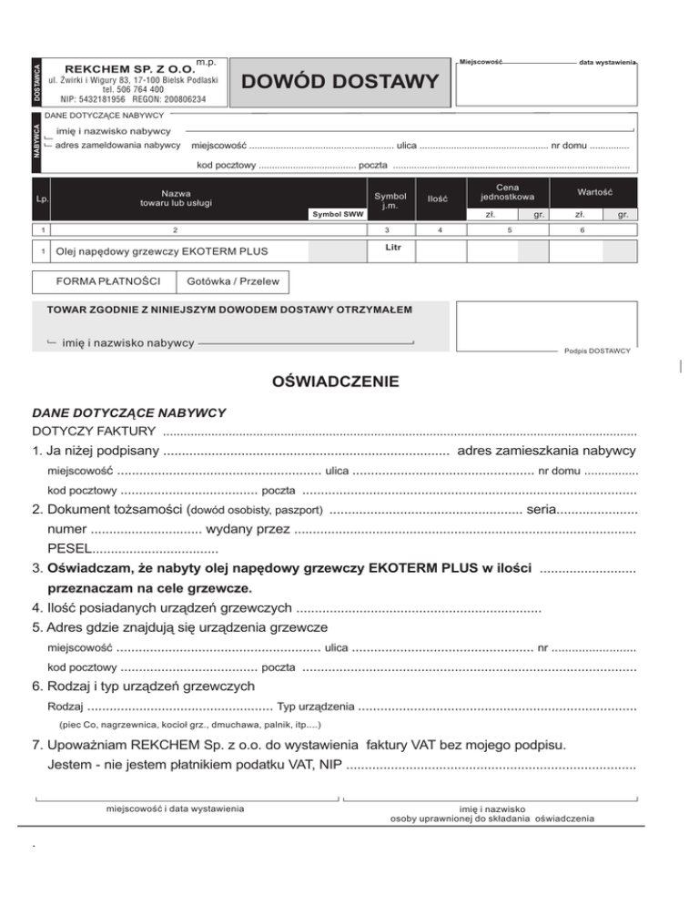 DOSTAWCA REKCHEM SP. Z O.O. m.p. ul. ¯wirki i Wigury 83, 17-100 Bielsk Podlaski tel. 506 764 400 NIP: 5432181956 REGON: 200806234 Miejscowoœæ data wystawienia DOWÓD DOSTAWY NABYWCA DANE DOTYCZ¥CE NABYWCY imiê i nazwisko nabywcy adres zameldowania nabywcy miejscowoœæ ....................................................... ulica ................................................. nr domu ............... kod pocztowy ..................................... poczta .......................................................................................... Nazwa towaru lub us³ugi Lp. Symbol j.m. Iloœæ z³. Symbol SWW 1 1 2 3 4 Wartoœæ gr. z³. 5 gr. 6 Litr Olej napêdowy grzewczy EKOTERM PLUS FORMA P£ATNOŒCI Cena jednostkowa Gotówka / Przelew TOWAR ZGODNIE Z NINIEJSZYM DOWODEM DOSTAWY OTRZYMA£EM imiê i nazwisko nabywcy Podpis DOSTAWCY OŒWIADCZENIE DANE DOTYCZ¥CE NABYWCY DOTYCZY FAKTURY ......................................................................................................................................... 1. Ja ni¿ej podpisany ............................................................................. adres zamieszkania nabywcy miejscowoœæ ....................................................... ulica ................................................. nr domu ................ kod pocztowy ..................................... poczta .......................................................................................... 2. Dokument to¿samoœci (dowód osobisty, paszport) .................................................... seria...................... numer .............................. wydany przez ............................................................................................ PESEL.................................. 3. Oœwiadczam, ¿e nabyty olej napêdowy grzewczy EKOTERM PLUS w iloœci .......................... przeznaczam na cele grzewcze. 4. Iloœæ posiadanych urz¹dzeñ grzewczych .................................................................. 5. Adres gdzie znajduj¹ siê urz¹dzenia grzewcze miejscowoœæ ....................................................... ulica ................................................. nr ......................... kod pocztowy ..................................... poczta .......................................................................................... 6. Rodzaj i typ urz¹dzeñ grzewczych Rodzaj .................................................. Typ urz¹dzenia ........................................................................... (piec Co, nagrzewnica, kocio³ grz., dmuchawa, palnik, itp....) 7. Upowa¿niam REKCHEM Sp. z o.o. do wystawienia faktury VAT bez mojego podpisu. Jestem - nie jestem p³atnikiem podatku VAT, NIP .............................................................................. miejscowoœæ i data wystawienia . imiê i nazwisko osoby uprawnionej do sk³adania oœwiadczenia