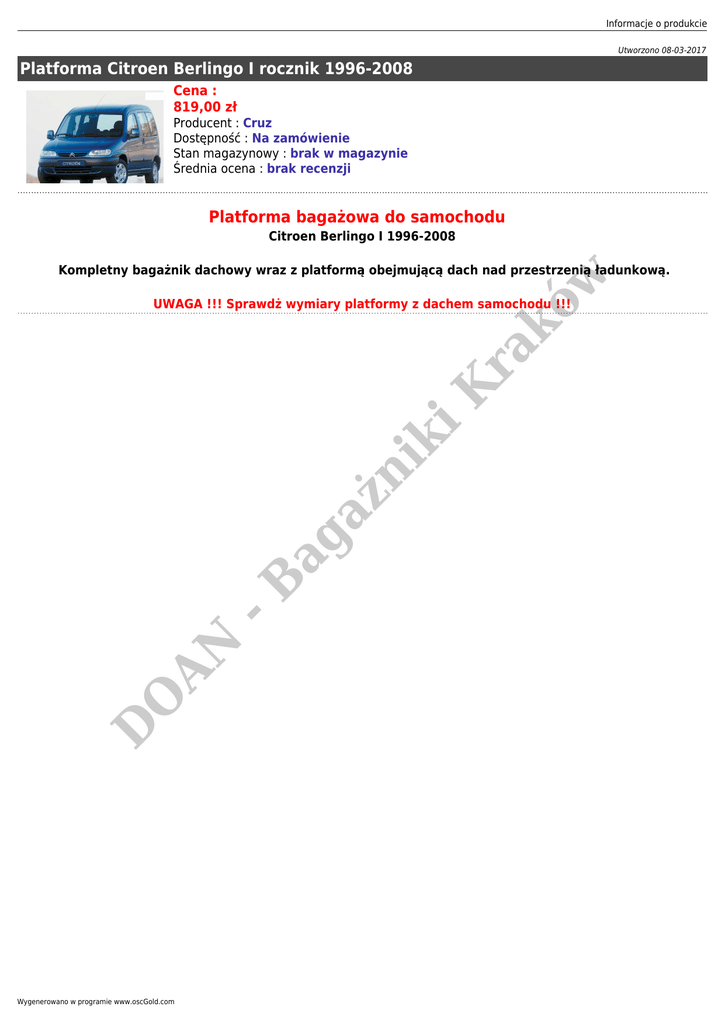 Informacje o produkcie Utworzono 08-03-2017 Platforma Citroen Berlingo I rocznik 1996-2008 Cena : 819,00 zł Producent : Cruz Dostępność : Na zamówienie Stan magazynowy : brak w magazynie Średnia ocena : brak recenzji Platforma bagażowa do samochodu Citroen Berlingo I 1996-2008 ra kó w Kompletny bagażnik dachowy wraz z platformą obejmującą dach nad przestrzenią ładunkową. D O AN -B ag aż n ik i K UWAGA !!! Sprawdż wymiary platformy z dachem samochodu !!! Wygenerowano w programie www.oscGold.com