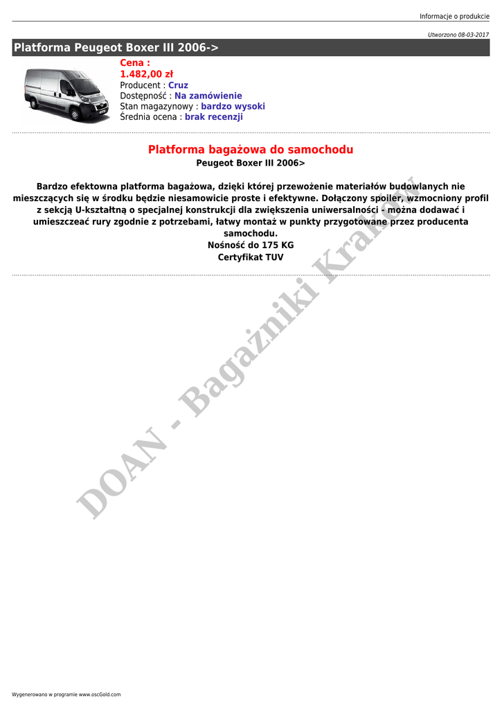 Informacje o produkcie Utworzono 08-03-2017 Platforma Peugeot Boxer III 2006-> Cena : 1.482,00 zł Producent : Cruz Dostępność : Na zamówienie Stan magazynowy : bardzo wysoki Średnia ocena : brak recenzji Platforma bagażowa do samochodu Peugeot Boxer III 2006> D O AN -B ag aż n ik i K ra kó w Bardzo efektowna platforma bagażowa, dzięki której przewożenie materiałów budowlanych nie mieszczących się w środku będzie niesamowicie proste i efektywne. Dołączony spoiler, wzmocniony profil z sekcją U-kształtną o specjalnej konstrukcji dla zwiększenia uniwersalności - można dodawać i umieszczeać rury zgodnie z potrzebami, łatwy montaż w punkty przygotowane przez producenta samochodu. Nośność do 175 KG Certyfikat TUV Wygenerowano w programie www.oscGold.com