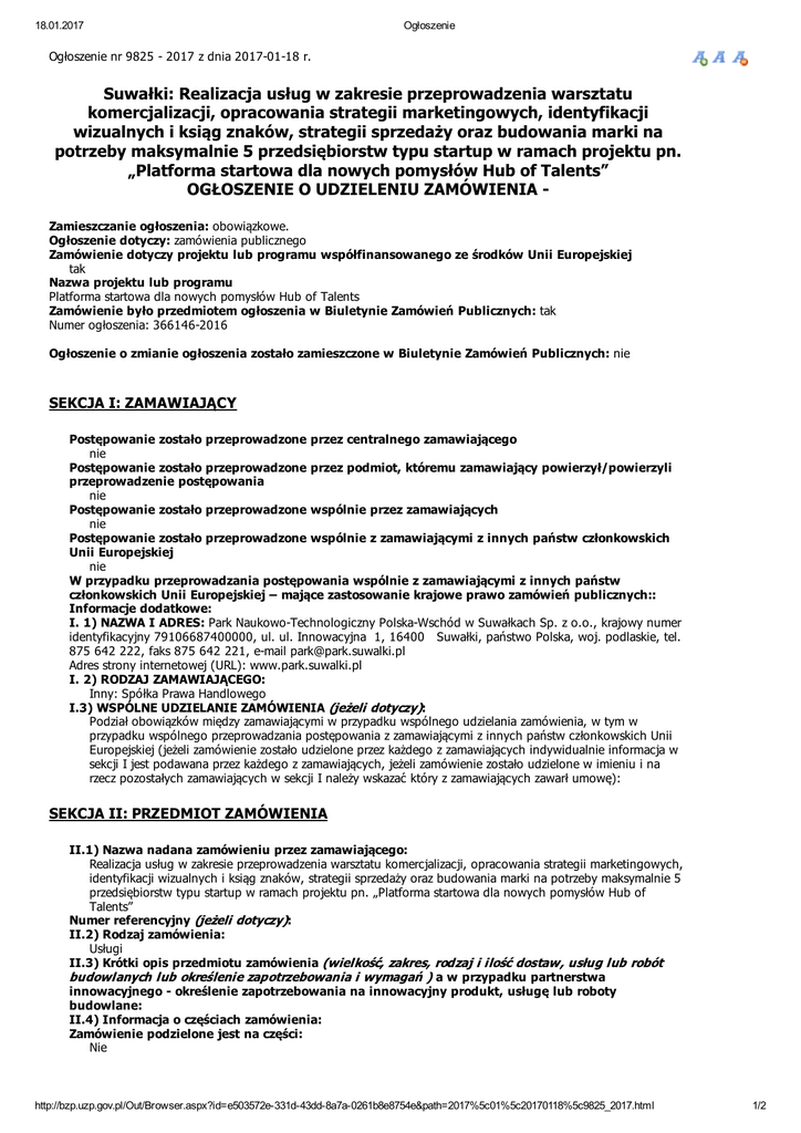 18.01.2017 Ogłoszenie Ogłoszenie nr 9825 2017 z dnia 20170118 r. Suwałki: Realizacja usług w zakresie przeprowadzenia warsztatu komercjalizacji, opracowania strategii marketingowych, identyfikacji wizualnych i ksiąg znaków, strategii sprzedaży oraz budowania marki na potrzeby maksymalnie 5 przedsiębiorstw typu startup w ramach projektu pn. „Platforma startowa dla nowych pomysłów Hub of Talents” OGŁOSZENIE O UDZIELENIU ZAMÓWIENIA Zamieszczanie ogłoszenia: obowiązkowe. Ogłoszenie dotyczy: zamówienia publicznego Zamówienie dotyczy projektu lub programu współfinansowanego ze środków Unii Europejskiej tak Nazwa projektu lub programu Platforma startowa dla nowych pomysłów Hub of Talents Zamówienie było przedmiotem ogłoszenia w Biuletynie Zamówień Publicznych: tak Numer ogłoszenia: 3661462016 Ogłoszenie o zmianie ogłoszenia zostało zamieszczone w Biuletynie Zamówień Publicznych: nie SEKCJA I: ZAMAWIAJĄCY Postępowanie zostało przeprowadzone przez centralnego zamawiającego nie Postępowanie zostało przeprowadzone przez podmiot, któremu zamawiający powierzył/powierzyli przeprowadzenie postępowania nie Postępowanie zostało przeprowadzone wspólnie przez zamawiających nie Postępowanie zostało przeprowadzone wspólnie z zamawiającymi z innych państw członkowskich Unii Europejskiej nie W przypadku przeprowadzania postępowania wspólnie z zamawiającymi z innych państw członkowskich Unii Europejskiej – mające zastosowanie krajowe prawo zamówień publicznych:: Informacje dodatkowe: I. 1) NAZWA I ADRES: Park NaukowoTechnologiczny PolskaWschód w Suwałkach Sp. z o.o., krajowy numer identyfikacyjny 79106687400000, ul. ul. Innowacyjna 1, 16400 Suwałki, państwo Polska, woj. podlaskie, tel. 875 642 222, faks 875 642 221, email [email protected] Adres strony internetowej (URL): www.park.suwalki.pl I. 2) RODZAJ ZAMAWIAJĄCEGO: Inny: Spółka Prawa Handlowego I.3) WSPÓLNE UDZIELANIE ZAMÓWIENIA : Podział obowiązków między zamawiającymi w przypadku wspólnego udzielania zamówienia, w tym w przypadku wspólnego przeprowadzania postępowania z zamawiającymi z innych państw członkowskich Unii Europejskiej (jeżeli zamówienie zostało udzielone przez każdego z zamawiających indywidualnie informacja w sekcji I jest podawana przez każdego z zamawiających, jeżeli zamówienie zostało udzielone w imieniu i na rzecz pozostałych zamawiających w sekcji I należy wskazać który z zamawiających zawarł umowę): (jeżeli dotyczy) SEKCJA II: PRZEDMIOT ZAMÓWIENIA II.1) Nazwa nadana zamówieniu przez zamawiającego: Realizacja usług w zakresie przeprowadzenia warsztatu komercjalizacji, opracowania strategii marketingowych, identyfikacji wizualnych i ksiąg znaków, strategii sprzedaży oraz budowania marki na potrzeby maksymalnie 5 przedsiębiorstw typu startup w ramach projektu pn. „Platforma startowa dla nowych pomysłów Hub of Talents” Numer referencyjny : II.2) Rodzaj zamówienia: Usługi II.3) Krótki opis przedmiotu zamówienia a w przypadku partnerstwa innowacyjnego określenie zapotrzebowania na innowacyjny produkt, usługę lub roboty budowlane: II.4) Informacja o częściach zamówienia: Zamówienie podzielone jest na części: Nie (jeżeli dotyczy) (wielkość, zakres, rodzaj i ilość dostaw, usług lub robót budowlanych lub określenie zapotrzebowania i wymagań ) http://bzp.uzp.gov.pl/Out/Browser.aspx?id=e503572e331d43dd8a7a0261b8e8754e&path=2017%5c01%5c20170118%5c9825_2017.html 1/2 18.01.2017 Ogłoszenie II.5) Główny Kod CPV: 794100001 Dodatkowe kody CPV: 799600002, 793000007, 793420003, 805000009 SEKCJA III: PROCEDURA III.1) TRYB UDZIELENIA ZAMÓWIENIA Przetarg nieograniczony III.2) Ogłoszenie dotyczy zakończenia dynamicznego systemu zakupów III.3) Informacje dodatkowe: SEKCJA IV: UDZIELENIE ZAMÓWIENIA Postępowanie/część zostało unieważnione nie Należy podać podstawę i przyczynę unieważnienia postępowania: IV.1) DATA UDZIELENIA ZAMÓWIENIA: 14/01/2017 IV.2 Całkowita wartość zamówienia Wartość bez VAT60993.24 WalutaPLN IV.3) INFORMACJE O OFERTACH Liczba otrzymanych ofert1 w tym Liczba otrzymanych ofert od małych i średnich przedsiębiorstw: 1 Liczba otrzymanych ofert od wykonawców z innych państw członkowskich Unii Europejskiej: Liczba otrzymanych ofert od wykonawców z państw niebędących członkami Unii Europejskiej: liczba ofert otrzymanych drogą elektroniczną: IV.4) LICZBA ODRZUCONYCH OFERT: IV.5) NAZWA I ADRES WYKONAWCY, KTÓREMU UDZIELONO ZAMÓWIENIA Zamówienie zostało udzielone wykonawcom wspólnie ubiegającym się o udzielenie: nie PoorNoMore Sp. z o.o, , ul. Lipowa 13, 62002, Złotkowo , kraj/woj. wielkopolskie Wykonawca jest małym/średnim przedsiębiorcą: tak Wykonawca pochodzi z innego państwa członkowskiego Unii Europejskiej: nie Skrót literowy nazwy państwa: Wykonawca pochodzi z innego państwa nie będącego członkiem Unii Europejskiej: nie Skrót literowy nazwy państwa: IV.6) INFORMACJA O CENIE WYBRANEJ OFERTY/ WARTOŚCI ZAWARTEJ UMOWY ORAZ O OFERTACH Z NAJNIŻSZĄ I NAJWYŻSZĄ CENĄ/KOSZTEM Cena wybranej oferty/wartość umowy 60993,24 Oferta z najniższą ceną/kosztem > Oferta z najwyższą ceną/kosztem Waluta: netto PLN IV.7) Informacje na temat podwykonawstwa Wykonawca przewiduje powierzenie wykonania części zamówienia podwykonawcy/podwykonawcom Wartość lub procentowa część zamówienia, jaka zostanie powierzona podwykonawcy lub podwykonawcom: IV.8) Informacje dodatkowe: IV.9) UZASADNIENIE UDZIELENIA ZAMÓWIENIA W TRYBIE NEGOCJACJI BEZ OGŁOSZENIA, ZAMÓWIENIA Z WOLNEJ RĘKI ALBO ZAPYTANIA O CENĘ IV.9.1) Podstawa prawna Postępowanie prowadzone jest w trybie na podstawie art. ustawy Pzp. IV.9.2) Uzasadnienia wyboru trybu Należy podać uzasadnienie faktyczne i prawne wyboru trybu oraz wyjaśnić, dlaczego udzielenie zamówienia jest zgodne z przepisami. http://bzp.uzp.gov.pl/Out/Browser.aspx?id=e503572e331d43dd8a7a0261b8e8754e&path=2017%5c01%5c201701