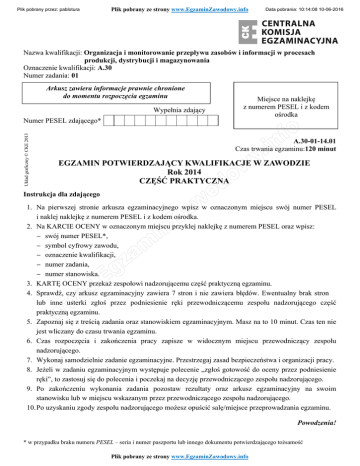 Plik pobrany przez: pablotura Plik pobrany ze strony www.EgzaminZawodowy.info Data pobrania: 10:14:08 10-06-2016 Nazwa kwalifikacji: Organizacja i monitorowanie przepływu zasobów i informacji w procesach produkcji, dystrybucji i magazynowania Oznaczenie kwalifikacji: A.30 Numer zadania: 01 Arkusz zawiera informacje prawnie chronione do momentu rozpoczęcia egzaminu Wypełnia zdający Miejsce na naklejkę z numerem PESEL i z kodem ośrodka Układ graficzny © CKE 2013 Numer PESEL zdającego* A.30-01-1. Czas trwania egzaminu:120 minut EGZAMIN POTWIERDZAJĄCY KWALIFIKACJE W ZAWODZIE Rok 201 CZĘŚĆ PRAKTYCZNA Instrukcja dla zdającego 1. Na pierwszej stronie arkusza egzaminacyjnego wpisz w oznaczonym miejscu swój numer PESEL i naklej naklejkę z numerem PESEL i z kodem ośrodka. 2. Na KARCIE OCENY w oznaczonym miejscu przyklej naklejkę z numerem PESEL oraz wpisz: – swój numer PESEL*, – symbol cyfrowy zawodu, – oznaczenie kwalifikacji, – numer zadania, – numer stanowiska. 3. KARTĘ OCENY przekaż zespołowi nadzorującemu część praktyczną egzaminu. 4. Sprawdź, czy arkusz egzaminacyjny zawiera 7 stron i nie zawiera błędów. Ewentualny brak stron lub inne usterki zgłoś przez podniesienie ręki przewodniczącemu zespołu nadzorującego część praktyczną egzaminu. 5. Zapoznaj się z treścią zadania oraz stanowiskiem egzaminacyjnym. Masz na to 10 minut. Czas ten nie jest wliczany do czasu trwania egzaminu. 6. Czas rozpoczęcia i zakończenia pracy zapisze w widocznym miejscu przewodniczący zespołu nadzorującego. 7. Wykonaj samodzielnie zadanie egzaminacyjne. Przestrzegaj zasad bezpieczeństwa i organizacji pracy. 8. Jeżeli w zadaniu egzaminacyjnym występuje polecenie „zgłoś gotowość do oceny przez podniesienie ręki”, to zastosuj się do polecenia i poczekaj na decyzję przewodniczącego zespołu nadzorującego. 9. Po zakończeniu wykonania zadania pozostaw rezultaty oraz arkusz egzaminacyjny na swoim stanowisku lub w miejscu wskazanym przez przewodniczącego zespołu nadzorującego. 10. Po uzyskaniu zgody zespołu nadzorującego możesz opuścić salę/miejsce przeprowadzania egzaminu. Powodzenia! * w przypadku braku numeru PESEL – seria i numer paszportu lub innego dokumentu potwierdzającego tożsamość Plik pobrany ze strony www.EgzaminZawodowy.info Plik pobrany przez: pablotura Plik pobrany ze strony www.EgzaminZawodowy.info Data pobrania: 10:14:08 10-06-2016 Zadanie egzaminacyjne Przedsiębiorstwo Produkcyjne „Ziarno” Sp. z o.o. jest producentem kaszy jęczmiennej wiejskiej. Dnia 27 grudnia 2013 r. spółka podpisała umowę z siecią dystrybucyjną „Chomik” na dostawę 100 000 opakowań kaszy jęczmiennej wiejskiej o wadze jednostkowej 400 gramów. Opakowanie kartonowe zawiera 4 woreczki kaszy po 100 gramów każda. Zamówienie ma zostać wydane z magazynu i dostarczone odbiorcy w dniu 13 stycznia 2014 r. wraz z fakturą sprzedaży. Wszystkie informacje dotyczące firmy, struktury wyrobów i dostaw, oraz niezbędne druki do wypełnienia znajdziesz w arkuszu egzaminacyjnym. Informacje dotyczące Przedsiębiorstwa Produkcyjnego „Ziarno”, sieci dystrybucji „Chomik” oraz dostawców opakowań Przedsiębiorstwo Produkcyjne „Ziarno” Sp. z o.o. ul. Gen. Sikorskiego 22 62-300 Września NIP 789-472-26-44 PKO BP IV/O Września 31 1020 3040 2222 0000 0123 9874 „Chomik” Sieć Dystrybucji Sp. z o.o. ul. Żniwna 5 62-025 Kostrzyn Wlkp. NIP 779-101-13-27 Numery ostatnio wystawionych dokumentów: - Wz 12/14 - Fa 15/14 - Rw 3/14 - Pw 5/14 Numer zamówienia: 86/13 Organizacja dostaw W celu realizacji zamówienia należy opracować zestawienie potrzebnych surowców i materiałów, uwzględniając strukturę wyrobu gotowego oraz bieżący stan zapasów w magazynie. Materiały z magazynu wydawane są w cenach zakupu. Pozostała część materiałów, niezbędnych do realizacji zamówienia, do działu produkcji wydana jest jednorazowo 3 stycznia 2014 r. Jednostkowe ceny zakupu materiałów i surowców wynoszą: opakowanie kartonowe 0,15 zł/op. opakowanie – woreczek celofanowy 0,10 zł/op. kasza jęczmienna 0,60 zł/kg Wyroby gotowe ewidencjonowane są w magazynie wyrobów gotowych w koszcie wytworzenia i przyjęte w dniu zakończenia produkcji 10 stycznia 2014 r. Koszt wytworzenia 1 opakowania kaszy jęczmiennej wiejskiej (400 gramów) wynosi 1,60 zł. Nr indeksu materiałowego (kod towarowo-materiałowy) kaszy jęczmiennej wiejskiej jest następujący: W–001–kJ4x100. Przedsiębiorstwo „Ziarno” na wyprodukowane wyroby stosuje narzut 25% kosztu wytworzenia. Wyroby spożywcze spółki objęte są 8% stawką podatku VAT. Strona 2 z 7 Plik pobrany ze strony www.EgzaminZawodowy.info Plik pobrany ze strony www.EgzaminZawodowy.info Plik pobrany przez: pablotura Data pobrania: 10:14:08 10-06-2016 Struktura wyrobu gotowego Opakowanie kaszy jęczmiennej wiejskiej Woreczek kaszy jęczmiennej wiejskiej (4 szt.) (100 gramów) Kasza jęczmienna wiejska (100 gramów) Opakowanie kartonowe (1 szt.) Woreczek z celofanu (1 szt.) * potrzeby netto wyższego poziomu w strukturze wyrobu stanowią potrzeby brutto dla niższego poziomu w strukturze wyrobu Stan zapasów na dzień 02 stycznia 2014 r. L.p. Nazwa zapasu 1. wyroby gotowe – kasza jęczmienna wiejska (400 gramów) 2. produkcja w toku – kasza jęczmienna wiejska (400 gramów) wszystkie surowce i materiały do produkcji w toku wydano 3. materiały – woreczki celofanowe Ilość 10 000 op. 40 000 op. 200 000 szt. 4. kasza jęczmienna w kg 20 000 kg 5. materiały – opakowanie kartonowe 60 000 szt. Czas przeznaczony na wykonanie zadania wynosi 120 minut. Ocenie podlegać będą 4 rezultaty: sporządzony dokument Rw, sporządzony dokument Pw, sporządzony dokument magazynowy Wz, sporządzona Faktura sprzedaży. Strona 3 z 7 Plik pobrany ze strony www.EgzaminZawodowy.info Plik pobrany przez: pablotura Plik pobrany ze strony www.EgzaminZawodowy.info Miejsce na obliczenia Strona 4 z 7 Plik pobrany z