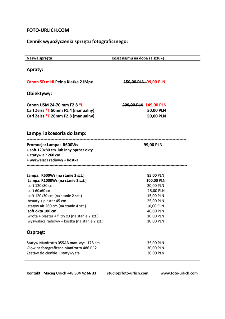 FOTO-URLICH.COM Cennik wypożyczenia sprzętu fotograficznego: Nazwa sprzętu Koszt najmu na dobę za sztukę: Apraty: Canon 5D mkII Pełna Klatka 21Mpx 150,00 PLN 99,00 PLN Obiektywy: Canon USM 24-70 mm F2.8 *L Carl Zeiss *T 50mm F1.4 (manualny) Carl Zeiss *T 28mm F2.8 (manualny) 200,00 PLN 149,00 PLN 50,00 PLN 50,00 PLN Lampy i akcesoria do lamp: ------------------------------------------------------------------------------------------------------------------Promocja: Lampa: R600Ws 99,00 PLN + soft 120x80 cm lub inny oprócz okty + statyw air 260 cm + wyzwalacz radiowy + kostka -----------------------------------------------------------------------------------------------------------------------------Lampa: R600Ws (na stanie 2 szt.) Lampa: R1000Ws (na stanie 2 szt.) soft 120x80 cm soft 60x60 cm soft 120x30 cm (na stanie 2 szt.) beauty + plaster 45 cm statyw air 260 cm (na stanie 4 szt.) soft okta 180 cm wrota + plaster + filtry x3 (na stanie 2 szt.) wyzwalacz radiowy + kostka (na stanie 2 szt.) 85,00 PLN 100,00 PLN 20,00 PLN 15,00 PLN 15,00 PLN 25,00 PLN 10,00 PLN 40,00 PLN 10,00 PLN 10,00 PLN Osprzęt: Statyw Manfrotto 055AB max. wys. 178 cm Głowica fotograficzna Manfrotto 486 RC2 Zestaw tło cienkie + statywy tła Kontakt: Maciej Urlich +48 504 42 66 33 35,00 PLN 30,00 PLN 30,00 PLN [email protected] www.foto-urlich.com