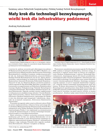 NBI N BII B Świat Światowy sukces Politechniki Świętokrzyskiej i Polskiej Fundacji Technik Bezwykopowych Mały krok dla technologii bezwykopowych, wielki krok dla infrastruktury podziemnej Andrzej Kuliczkowski1 Kierownik Studium Podyplomowego prof. dr hab. inż. A. Kuliczkowski z matrioszką na moskiewskim Arbacie, udający się na posiedzenie Zarządu Międzynarodowego Stowarzyszenia Technik Bezwykopowych Prezentacja Studium Podyplomowego przez dr inż. A. Zwierzchowską (na ekranie zdjęcie Dziekana Wydziału Budownictwa i Inżynierii Środowiska Politechniki Świętokrzyskiej prof. Z. Rusina) 4 czerwca br. podczas uroczystej gali odbywającej się podczas 26 Międzynarodowej Konferencji No-Dig 2008 w Moskwie, zorganizowanej przez Międzynarodowe Stowarzyszenie Technologii Bezwykopowych z siedzibą w Londynie, została wręczona prof. dr. hab. inż. Andrzejowi Kuliczkowskiemu, prezesowi Polskiej Fundacji Technik Bezwykopowych oraz dr inż. Agacie Zwierzchowskiej, reprezentującej na konferencji dziekana Wydziału Budownictwa i Inżynierii Środowiska Politechniki Świętokrzyskiej prof. dr. hab. inż. Zbigniewa Rusina, prestiżowa międzynarodowa nagroda No-Dig Award 2008. Statuetka i certyfikat zostały przyznane za zorganizowanie na Politechnice Świętokrzyskiej rocznego Studium Podyplomowego Techniki Bezwykopowe w Inżynierii Środowiska. Kierownikiem Studium był prof. Andrzej Kuliczkowski. Nagrodę uzyskali również najaktywniejsi w realizacji procesu dydaktycznego adiunkci: Urszula Kubicka, Agata Zwierzchowska i Dariusz Zwierzchowski. Szczegółowe informacje o Studium Podyplomowym, zapraszające do udziału w nim oraz dotyczące jego inauguracji i zakończenia, ukazywały się na łamach czasopisma „Nowoczesne Budownictwo Inżynieryjne”. Przyznanie tej nagrody należy uznać za olbrzymi sukces Polski na arenie międzynarodowej, zwłaszcza biorąc pod uwagę fakt, iż członkami Międzynarodowego Stowarzyszenia Technik Bezwykopowych poza Polską Fundacją Technik Bezwykopowych (reprezentującą Polskę w tej organizacji) są stowarzyszenia z ponad 40 zaawansowanych w rozwoju technologii bezwykopowych krajów ze wszystkich kontynentów. Dzień wcześniej, w trakcie uroczystej ceremonii otwarcia konferencji, prof. dr hab. inż. Andrzej Kuliczkowski i dr inż. Agata Zwierzchowska w czasie 20-minutowego wspólnego wystąpienia zaprezentowali program Studium i doświadczenia związane z jego realizacją. Pozostałe dwie nagrody uzyskały: firma Herrenknecht z Niemiec i Longbore ze Szkocji. W pisemnym uzasadnieniu przyznania nagrody No-Dig Award 2008, nadanej w kategorii akademickiej, zwrócono uwagę, że dotychczas w żadnym innym kraju na świecie nie zorganizowano Studium Podyplomowego z zakresu Technologii Bezwykopowych, obejmującego łącznie 28 różnych przedmiotów, zawierających także ćwiczenia projektowe i laboratoryjne oraz prezentacje technologii. Za szczególnie cenne uznano kompleksowość i interdyscyplinarność Studium. Gratulując uzyskania nagrody napisano, że jest to wspaniałe akademickie osiągnięcie, z którego branża technologii bezwykopowych może być dumna. W piśmie skierowanym do Polskiej Fundacji Technik Bezwykopowych sparafrazowano słowa Neila Armstronga, aby podkreślić znaczenie zrealizowanego Studium, pisząc o nim: One small step for trenchless, one giant step for utilities, co można przetłumaczyć: „Studium, będąc małym krokiem dla technologii 1 Prof. dr hab. inŚ., prezes Zarzçdu PFTT. Lipiec – Sierpień 2008 Nowoczesne Budownictwo Inżynieryjne Laureaci trzech statuetek No-Dig Award 2008, wśród nich (czwarta od lewej) dr inż. A. Zwierzchowska, obok niej prof. dr hab. inż. A. Kuliczkowski 47 Zaproszenie zagranicznych uczestników do udziału w międzynarodowym Studium Podyplomowym, które odbędzie się we wrześniu 2009 roku w Kielcach bezwykopowych, stanowiło olbrzymi krok dla infrastruktury podziemnej”. Polska Fundacja Technik Bezwykopowych wraz z Politechniką Świętokrzyską chcąc uczynić kolejny, równie duży krok ku nowemu, podjęły decyzję o zorganizowaniu w dniach 2–22 września 2009 r. Międzynarodowego Studium Podyplomowego Postgraduade Study on Trenchless Technology (Podyplomowe Studium z zakresu Technologii Bezwykopowych). Będzie ono prowadzone w języku angielskim i adresowane głównie do słuchaczy zagranicznych. Studium będzie realizowane w opcji intensywnej, średnio ok. 9 godzin dziennie, łącznie w liczbie 135 godzin, z czego ok. 30% realizowanego programu przeznaczono na projektowanie. W programie Studium przewidziano, oprócz wykładów i ćwiczeń projektowych, również terenowe pokazy technologii. Z uwagi na członkostwo Polskiej Fundacji Technik Bezwykopowych (PFTT, skrót od Polish Foundation for Trenchless Technology) w Międzynarodowym Stowarzyszeniu Technik Bezwykopowych (ISTT) istnieje możliwość występowania za pośrednictwem PFTT z wnioskami do ISTT o uzyskiwanie nagród dla polskich firm działających w sektorze technologii bezwykopowych za wybitne osiągnięcia w tej branży (innowacyjne technologie, urządzenia, materiały). Polskie firmy działające w branży technologii bezwykopowych są zapraszane przez PFTT do członkostwa w Fundacji, umożliwiającego wieloraką aktywną współprace z firmami zagranicznymi oraz dostęp do międzynarodowych serwisów, w tym np. informacji o międzynarodowych przetargach. PFTT prowadzi także bardzo aktywną działalność krajową. Informacje o PFTT można znaleźć na stronie internetowej www.pftt.pl. Statuetka No-Dig Award 2008 przyznana Polskiej Fundacji Technik Bezwykopowych i Politechnice Świętokrzyskiej