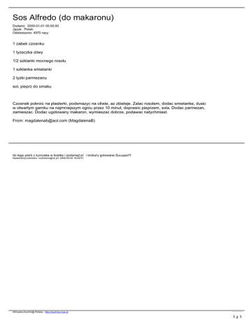 Sos Alfredo (do makaronu) Dodano: 2000-01-01 00:00:00 Język: Polski Odwiedzono: 4970 razy. 1 zabek czosnku 1 lyzeczka oliwy 1/2 szklanki mocnego rosolu 1 szklanka smietanki 2 lyzki parmezanu sol, pieprz do smaku Czosnek pokroic na plasterki, podsmazyc na oliwie, az zbieleje. Zalac rosolem, dodac smietanke, dusic w otwartym garnku na najmniejszym ogniu przez 10 minut, doprawic pieprzem, sola. Dodac parmezan, zamieszac. Dodac ugotowany makaron, wymieszac dobrze, podawac natychmiast. From: [email protected] (MagdalenaB) do tego pierś z kurczaka w kostke i podsmażyć i brokuły gotowane.Suuuper!!! Nadesłał(a):soboliero <[email protected]> 2006-09-05 18:09:51 Wirtualna Kuchni@ Polska - http://kuchnia.now.pl przepis nr 4342, plik wygenerowano 2017.03.08 19:16 1z1