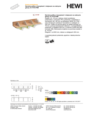 Karta produktowa Narożna półka z haczykami i miejscem na nakrycia głowy 33.7410.P9M H1Y3P Narożna półka z haczykami i miejscem na nakrycia głowy 33.7410.P9M drążek o śr. 33 mm, stalowy rdzeń powlekany poliamidem i uchwytem P8 z poliamidu z okienkiem o wymiarach 36 x 36 mm na piktogram HEWI 33.1700.... oraz obrotowym potrójnym haczykiem w odstępie co 200 mm. Półka na okrycia głowy ze sklejki bukowej, gr. 18 mm, pokryty bezbarwnym lakierem, z przegródkami z poliamidu w odstępie 200 mm, w kolorze czysta biel (99) lub biały (98). Mocowanie drążków za pomocą rozetek o śr. 70 mm. Długość L od 800 mm, dalsze w odstępach 200 mm. z wysokiej jakości poliamidu zgodnie z tabelą kolorów HEWI Wymiary w mm Kolory 98 99 97 95 92 90 33 50 Kolory 13 30 80 73 53 Kolory 13, 30, 53, 73 i 80 będą wycofane z produkcji do 31.03.2017 Zastrzega się możliwość wprowadzania zmian technicznych, 21.10.2016 HEWI Heinrich Wilke GmbH Postfach 1260 D-34442 Bad Arolsen Telefon: +49 5691 82-366 Telefax: +49 5691 82-99366 [email protected] www.hewi.com HEWI Heinrich Wilke GmbH Sp. z o.o. Oddział w Polsce Ul. Lelka 26 02-812 Warszawa tel. +48 22 330 00 51 fax +48 22 330 00 50 [email protected] www.hewi.com