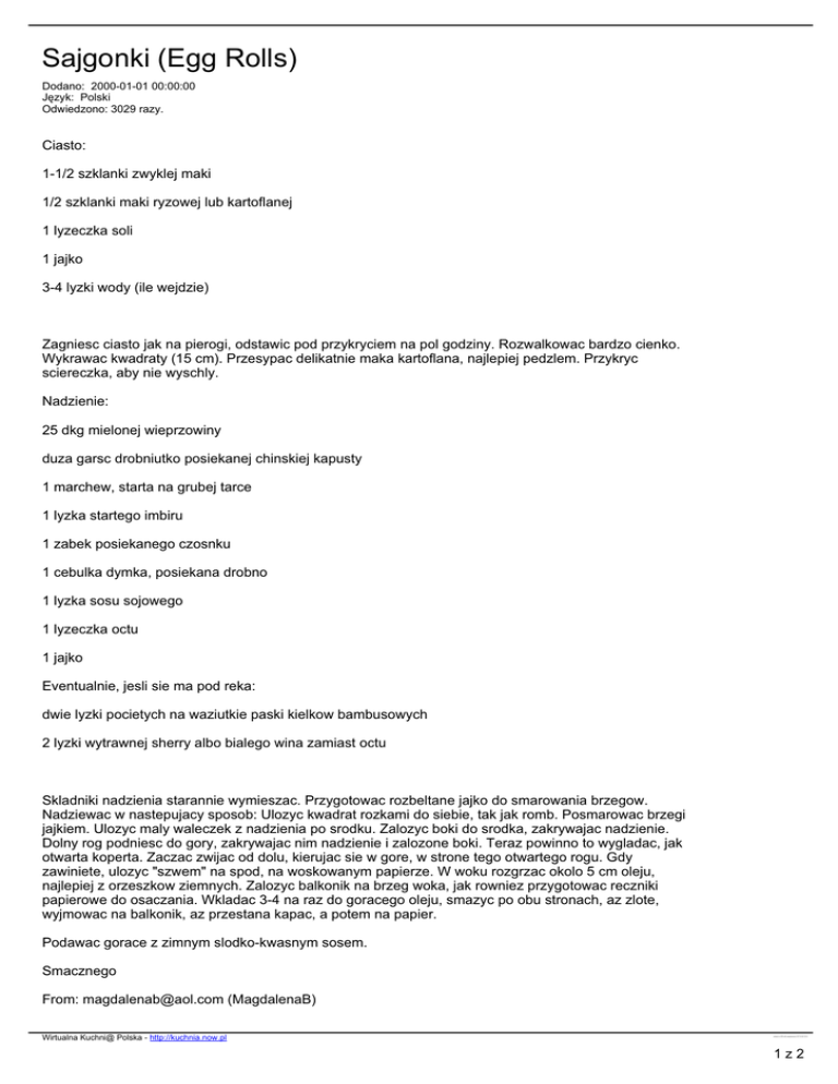 Sajgonki (Egg Rolls) Dodano: 2000-01-01 00:00:00 Język: Polski Odwiedzono: 3029 razy. Ciasto: 1-1/2 szklanki zwyklej maki 1/2 szklanki maki ryzowej lub kartoflanej 1 lyzeczka soli 1 jajko 3-4 lyzki wody (ile wejdzie) Zagniesc ciasto jak na pierogi, odstawic pod przykryciem na pol godziny. Rozwalkowac bardzo cienko. Wykrawac kwadraty (15 cm). Przesypac delikatnie maka kartoflana, najlepiej pedzlem. Przykryc sciereczka, aby nie wyschly. Nadzienie: 25 dkg mielonej wieprzowiny duza garsc drobniutko posiekanej chinskiej kapusty 1 marchew, starta na grubej tarce 1 lyzka startego imbiru 1 zabek posiekanego czosnku 1 cebulka dymka, posiekana drobno 1 lyzka sosu sojowego 1 lyzeczka octu 1 jajko Eventualnie, jesli sie ma pod reka: dwie lyzki pocietych na waziutkie paski kielkow bambusowych 2 lyzki wytrawnej sherry albo bialego wina zamiast octu Skladniki nadzienia starannie wymieszac. Przygotowac rozbeltane jajko do smarowania brzegow. Nadziewac w nastepujacy sposob: Ulozyc kwadrat rozkami do siebie, tak jak romb. Posmarowac brzegi jajkiem. Ulozyc maly waleczek z nadzienia po srodku. Zalozyc boki do srodka, zakrywajac nadzienie. Dolny rog podniesc do gory, zakrywajac nim nadzienie i zalozone boki. Teraz powinno to wygladac, jak otwarta koperta. Zaczac zwijac od dolu, kierujac sie w gore, w strone tego otwartego rogu. Gdy zawiniete, ulozyc "szwem" na spod, na woskowanym papierze. W woku rozgrzac okolo 5 cm oleju, najlepiej z orzeszkow ziemnych. Zalozyc balkonik na brzeg woka, jak rowniez przygotowac reczniki papierowe do osaczania. Wkladac 3-4 na raz do goracego oleju, smazyc po obu stronach, az zlote, wyjmowac na balkonik, az przestana kapac, a potem na papier. Podawac gorace z zimnym slodko-kwasnym sosem. Smacznego From: [email protected] (MagdalenaB) Wirtualna Kuchni@ Polska - http://kuchnia.now.pl przepis nr 4323, plik wygenerowano 2017.03.08 19:16 1z2 Wirtualna Kuchni@ Polska - http://kuchnia.now.pl przepis nr 4323, plik wygenerowano 2017.03.08 19:16 2z2