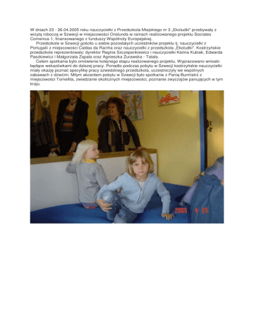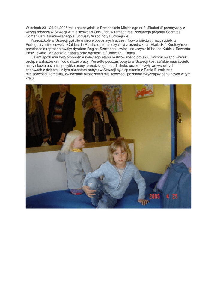 W dniach 23 - 26.04.2005 roku nauczycielki z Przedszkola Miejskiego nr 3 „Ekoludki" przebywały z wizytą roboczą w Szwecji w miejscowości Onslunda w ramach realizowanego projektu Socrates Comenius 1, finansowanego z funduszy Wspólnoty Europejskiej. Przedszkole w Szwecji gościło u siebie pozostałych uczestników projektu tj. nauczycielki z Portugalii z miejscowości Caldas da Rainha oraz nauczycielki z przedszkola „Ekoludki". Kostrzyńskie przedszkole reprezentowały: dyrektor Regina Szczepankiewicz i nauczycielki Karina Kubiak, Edwarda Paszkiewicz i Małgorzata Zapała oraz Agnieszka Żurawska - Tatała. Celem spotkania było omówienie kolejnego etapu realizowanego projektu. Wypracowano wnioski będące wskazówkami do dalszej pracy. Ponadto podczas pobytu w Szwecji kostrzyńskie nauczycielki miały okazję poznać specyfikę pracy szwedzkiego przedszkola, uczestniczyły we wspólnych zabawach z dziećmi. Miłym akcentem pobytu w Szwecji było spotkanie z Panią Burmistrz z miejscowości Tomellila, zwiedzanie okolicznych miejscowości, poznanie zwyczajów panujących w tym kraju.