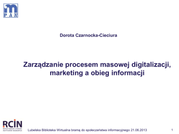 Dorota Czarnocka-Cieciura Zarządzanie procesem masowej digitalizacji, marketing a obieg informacji Lubelska Biblioteka Wirtualna bramą do społeczeństwa informacyjnego 21.06.2013 1 Plan wystąpienia Wprowadzenie i definicje Biblioteka tradycyjna a biblioteka dziś Dlaczego warto wspólnie planować tworzenie zasobów cyfrowych Jakie wyzwanie stawia przed nami działanie w ramach konsorcjum Projekt, planowanie, wykonanie, zakończenie Wpływ obiegu informacji na marketing Co niesie przyszłość bibliotekom, muzeom, archiwom 2 Wprowadzenie - definicje Zarządzanie zestaw działań (obejmujący planowanie i podejmowanie decyzji, organizowanie, przewodzenie, tj. kierowanie ludźmi, i kontrolowanie) skierowanych na zasoby organizacji (ludzkie, finansowe, rzeczowe i informacyjne) i wykonywanych z zamiarem osiągnięcia celów organizacji w sposób sprawny i skuteczny (Griffin R.W.). Proces zespół następujących po sobie działań pozostających w związku przyczynowo-skutkowym, wykonanych dla uzyskania zamierzonego rezultatu, realizowanych przez zespół wykonawców, na wielu stanowiskach pracy w wielu komórkach organizacyjnych (Trocki M.) 3 Definicje c.d. Masowa digitalizacja: jeżeli mamy do czynienia z procesem digitalizacji różnorodnych materiałów począwszy od publikacji papierowych, poprzez mapy, plakaty, foldery, zdjęcia i inne dokumenty życia społecznego, filmy, obiekty muzealne, nagrania muzyczne, bądź jeżeli mamy miliony stron papierowych, tysiące obiektów, setki godzin nagrań to nazywamy to procesem masowej digitalizacji. Marketing wg Kotlera oznacza: „proces społeczny i zarządczy, dzięki któremu konkretne osoby i grupy otrzymują to, czego potrzebują i pragną osiągnąć poprzez tworzenie, oferowanie i wymianę posiadanych towarów” (Philip Kotler: Marketing, Rebis 2005) 4 Definicje c.d. Można zaryzykować stwierdzenie, że proces masowej digitalizacji cennych zbiorów w bibliotekach europejskich rozpoczął się wraz z drugim etapem projektu VD16-2 realizowanego w Bawarskiej Bibliotece Państwowej w latach 2007-2009. Monachijskie Centrum Digitalizacji wyposażono w trzy skanery automatyczne umożliwiające bezpieczne skanowanie unikatowych XVI w. dzieł. Przykładem takiego projektu jest realizowany w ze środków PO Innowacyjna Gospodarka UE, w latach 2010-2014, projekt pn. „Repozytorium Cyfrowe Instytutów Naukowych – RCIN”. 5 Definicje c.d. Zarządzanie procesem masowej digitalizacji stanowi wyzwanie na co najmniej dwóch płaszczyznach: jedną jest zarządzanie projektem, w ramach którego realizowany jest proces masowej digitalizacji drugą jest zarządzanie organizacją technicznej strony procesu 6 Biblioteka tradycyjna a biblioteka dziś biblioteka, muzeum, archiwum tradycyjne to bezpośrednie relacje obiekt materialny (publikacja, dokument papierowy, obiekt materialny), a odbiorca udostępnianych treści i form w danym miejscu i czasie. biblioteka, muzeum, archiwum dziś opierają się również na relacji obiekt – odbiorca lecz nie żądamy obecnie powiązań odnoszących się do miejsca i czasu. Możemy oglądać obiekty odległe od nas tysiące kilometrów, słuchać wykładów czy koncertów, które się już odbyły, oglądać szczegóły obiektów niemożliwe do zobaczenia przy bezpośredniej relacji. Pozwala nam na to digitalizacja i publikowanie w Internecie 7 Dlaczego wspólnie….. Warto wspólnie digitalizować gdyż: wspólnie mamy większe doświadczenie wypracować możemy wspólne metody skanowania, opisu metadanych, zasad publikowania tworzenie pracowni ze specjalistycznym, często bardzo drogim sprzętem jest efektywniejsze dla wielu konsorcjantów wspólne szkolenia automatyzacja pewnych procesów digitalizacyjnych 8 Konsorcjum Budowanie konsorcjum: cel założenia konsorcjum lista członków konsorcjum wybór grupy zarządzającej ustalenie zasad działania konsorcjum: (umowa), bądź nieformalne (uzgodnienia) formalne termin rozpoczęcia i zakończenia działań zasady pracy w konsorcjum 9 Działania w ramach konsorcjum Zarządzanie konsorcjum wybór zarządu ustalenie zasad pracy uczestników konsorcjum wybranie osób odpowiedzialnych za poszczególne cele stawiane przed konsorcjum wybranie sposobu kontroli pracy w konsorcjum np. w RCIN wybraliśmy oprogramowanie dLab ustalenie zasad rozliczania pracy zarządu i pracy członków konsorcjum 10 Działania w ramach konsorcjum powstanie grupy inicjatywnej wstępne rozeznanie potrzeb skonstruowanie i podpisanie umowy konsorcyjnej decyzja za co? oraz jaki przyjmujemy model masowej digitalizacji ? dokładne rozeznanie potrzeb: kto co?, ile?, jak umiejscowione? rozeznanie potrzeb co do kadry merytorycznej, obsługi informatycznej, administracyjnej i księgowej oraz ilości i rodzaju niezbędnych szkoleń rozeznanie potrzeb w zakresie infrastruktury technicznej i informatycznej członków konsorcjum środki na: ekspertyzy, materiały, audyty zewnętrzne itp. 11 12 Obieg informacji a marketing Zaistnienie biblioteki, muzeum, archiwum w Internecie uwalnia lawinę reklamową. Nie dość, że czytelnicy samodzielnie dowiadują się o poszukiwanych obiektach to przy okazji informują nas o swoich potrzebach (zapytania nie znajdujące obiektu). Otrzymujemy też informację o rodzajach klientów oraz preferencjach dotyczących sposobu prezentacji i udostępnienia obiektu 13 Przyszłość W przyszłości świat będzie ewoluował w kierunku udostępniania kultury, sztuki, nauki w jak najbardziej przystępny sposób. Obiekty muzealne, biblioteczne, archiwalne, widowiska, koncerty, itp. będą coraz częściej dostępne w Internecie, a sposób ich odbioru będzie zależał od potrzeb odbiorcy. Albo będzie on preferował samotną kontemplacje, albo integrację grup odbiorców nie koniecznie skupionych w jednym miejscu. 14 Dziękuję za uwagę. DOROTA CZARNOCKA-CIECIURA [email protected] 15
