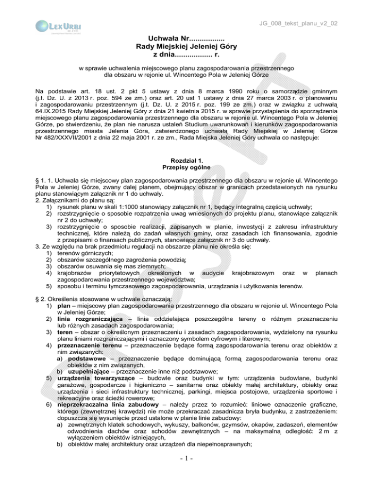 JG_008_tekst_planu_v2_02 Uchwała Nr................. Rady Miejskiej Jeleniej Góry z dnia.................. r. w sprawie uchwalenia miejscowego planu zagospodarowania przestrzennego dla obszaru w rejonie ul. Wincentego Pola w Jeleniej Górze Na podstawie art. 18 ust. 2 pkt 5 ustawy z dnia 8 marca 1990 roku o samorządzie gminnym (j.t. Dz. U. z 2013 r. poz. 594 ze zm.) oraz art. 20 ust 1 ustawy z dnia 27 marca 2003 r. o planowaniu i zagospodarowaniu przestrzennym (j.t. Dz. U. z 2015 r. poz. 199 ze zm.) oraz w związku z uchwałą 64.IX.2015 Rady Miejskiej Jeleniej Góry z dnia 21 kwietnia 2015 r. w sprawie przystąpienia do sporządzenia miejscowego planu zagospodarowania przestrzennego dla obszaru w rejonie ul. Wincentego Pola w Jeleniej Górze, po stwierdzeniu, że plan nie narusza ustaleń Studium uwarunkowań i kierunków zagospodarowania przestrzennego miasta Jelenia Góra, zatwierdzonego uchwałą Rady Miejskiej w Jeleniej Górze Nr 482/XXXVII/2001 z dnia 22 maja 2001 r. ze zm., Rada Miejska Jeleniej Góry uchwala co następuje: Rozdział 1. Przepisy ogólne § 1. 1. Uchwala się miejscowy plan zagospodarowania przestrzennego dla obszaru w rejonie ul. Wincentego Pola w Jeleniej Górze, zwany dalej planem, obejmujący obszar w granicach przedstawionych na rysunku planu stanowiącym załącznik nr 1 do uchwały. 2. Załącznikami do planu są: 1) rysunek planu w skali 1:1000 stanowiący załącznik nr 1, będący integralną częścią uchwały; 2) rozstrzygnięcie o sposobie rozpatrzenia uwag wniesionych do projektu planu, stanowiące załącznik nr 2 do uchwały; 3) rozstrzygnięcie o sposobie realizacji, zapisanych w planie, inwestycji z zakresu infrastruktury technicznej, które należą do zadań własnych gminy, oraz zasadach ich finansowania, zgodnie z przepisami o finansach publicznych, stanowiące załącznik nr 3 do uchwały. 3. Ze względu na brak przedmiotu regulacji na obszarze planu nie określa się: 1) terenów górniczych; 2) obszarów szczególnego zagrożenia powodzią; 3) obszarów osuwania się mas ziemnych; 4) krajobrazów priorytetowych określonych w audycie krajobrazowym oraz w planach zagospodarowania przestrzennego województwa; 5) sposobu i terminu tymczasowego zagospodarowania, urządzania i użytkowania terenów. § 2. Określenia stosowane w uchwale oznaczają: 1) plan – miejscowy plan zagospodarowania przestrzennego dla obszaru w rejonie ul. Wincentego Pola w Jeleniej Górze; 2) linia rozgraniczająca – linia oddzielająca poszczególne tereny o różnym przeznaczeniu lub różnych zasadach zagospodarowania; 3) teren – obszar o określonym przeznaczeniu i zasadach zagospodarowania, wydzielony na rysunku planu liniami rozgraniczającymi i oznaczony symbolem cyfrowym i literowym; 4) przeznaczenie terenu – przeznaczenie będące formą zagospodarowania terenu oraz obiektów z nim związanych: a) podstawowe – przeznaczenie będące dominującą formą zagospodarowania terenu oraz obiektów z nim związanych, b) uzupełniające – przeznaczenie inne niż podstawowe; 5) urządzenia towarzyszące – budowle oraz budynki w tym: urządzenia budowlane, budynki garażowe, gospodarcze i higieniczno – sanitarne oraz obiekty małej architektury, obiekty oraz urządzenia i sieci infrastruktury technicznej, parkingi, miejsca postojowe, urządzenia sportowe i rekreacyjne oraz ścieżki rowerowe; 6) nieprzekraczalna linia zabudowy – należy przez to rozumieć: liniowe oznaczenie graficzne, którego (zewnętrznej krawędzi) nie może przekraczać zasadnicza bryła budynku, z zastrzeżeniem: dopuszcza się wysunięcie przed ustalone w planie linie zabudowy: a) zewnętrznych klatek schodowych, wykuszy, balkonów, gzymsów, okapów, zadaszeń, elementów odwodnienia dachów oraz schodów zewnętrznych – na maksymalną odległość: 2 m z wyłączeniem obiektów istniejących, b) obiektów małej architektury oraz urządzeń dla niepełnosprawnych; -1- JG_008_tekst_planu_v2_02 7) wysokość zabudowy – należy przez to rozumieć wysokość: a) budynku mierzoną od rzędnej terenu przy głównym wejściu do budynku do najwyższego punktu górnej powierzchni najwyżej położonego stropodachu, attyki, gzymsu lub kalenicy głównej bryły budynku, b) budowli przekrytej dachem mierzoną od średniej rzędnej terenu posadowienia budowli do najwyższego punktu górnej powierzchni najwyżej położonego stropodachu lub do najwyżej położonej krawędzi kalenicy dachu, z wyłączeniem dominant; 8) ulica jednoprzestrzenna – droga o nawierzchni kształtowanej jako jedna płaszczyzna z zachowaniem spadków niezbędnych dla odprowadzania ścieków deszczowych; 9) dach płaski – należy przez to rozumieć dach o kącie nachylenia połaci nie większym niż 12°; 10) uchwała – niniejsza uchwała. § 3. 1. Następujące oznaczenia graficzne na rysunku planu są obowiązującymi ustaleniami planu: 1) granica obszaru objętego planem tożsama ze strefą ochrony obszarowej układu urbanistycznego Miasta Jeleniej Góry oraz strefą ochrony konserwatorskiej "OW"; 2) linie rozgraniczające tereny o różnym przeznaczeniu lub różnych zasadach zagospodarowania; 3) nieprzekraczalne linie zabudowy; 4) przeznaczenia terenów oznaczone symbolami literowymi i cyfrowymi; 5) obiekty wpisane do ewidencji zabytków; 6) wymiarowanie. Rozdział 2. Przepisy dotyczące całego obszaru planu § 4. 1. Ustala się przeznaczenia terenów: 1) tereny zabudowy mieszkaniowej wielorodzinnej i/lub usługowej rozumiane jako tereny, na których ustala się lokalizację budynku wielorodzinnego (w rozumieniu przepisów odrębnych) lub zespołu takich budynków, i/lub budynku usługowego lub zespołu takich budynków, oznaczone na rysunku planu symbolem MW,U; 2) tereny dróg publicznych rozumiane zgodnie z przepisami odrębnymi, oznaczone na rysunku planu symbolem KD-Z dla drogi klasy zbiorczej; 3) tereny dróg wewnętrznych rozumiane jako tereny dróg niezaliczanych do żadnej kategorii dróg pu