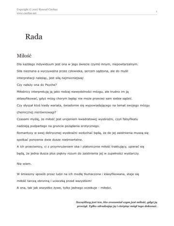Copyright © 2007 Konrad Czerkas www.czerkas.net 1 Rada Mi³oœæ Dla ka¿dego indywiduum jest ona w jego œwiecie czymœ innym, niepowtarzalnym. Si³a nieznana a wyczuwalna przez cz³owieka, sercem s¹dzona, ale do myœli interpretacji nale¿¹c, jest si³¹ najmocniejsz¹! Czy nale¿y ona do Psyche? Mi³oœnicy interpretuj¹ j¹ jako rodzaj niewydolnoœci mózgu, ale trudno im j¹ sklasyfikowaæ, gdy¿ mózg chorym bêd¹c nie mo¿e przecie¿ sam siebie s¹dziæ. Czy s³ysza³ ktoœ kiedy wariata, œwiadomie siê wypowiadaj¹cego na temat swojego mózgu chemicznej nierównowagi? Czasami myœlê, ¿e mi³oœæ jest urojeniem kwadratowej wyobraŸni, czyli falsyfikatu nadziej¹ podpartego na gruncie po¿¹dania erotycznego. Romantycy w swej delirycznej wyobraŸni wzdychaæ bêd¹, ¿e do jej zaistnienia musz¹ siê spotkaæ ponownie dwie dusze nieœmiertelne. A ich przeciwnicy, ci z przymru¿eniem oka i platonicznie mi³oœæ traktuj¹cy, upieraæ siê bêd¹, ¿e jedna dusza plus piêkny rozum do zaistnienia jej w zupe³noœci wystarczy. Nie wiem. W œmieszny sposób przez ludzi na ich mod³ê t³umaczona i klasyfikowana, staje siê mi³oœæ tarcz¹ obronn¹ i ucieczk¹ przed wszystkim! A ona, tak jak wszystko ¿ywe, tylko jednego oczekuje - mi³oœci. Szczêœliwy jest ten, kto zrozumia³ czym jest mi³oœæ, gdy¿ j¹ prze¿y³. Tylko zdradzaj¹c j¹ i cierpi¹c móg³ tego dokonaæ. Copyright © 2007 Konrad Czerkas www.czerkas.net 2 Popularnoœæ frazesu mi³oœci doprowadza samoœæ mi³oœci do sytuacji patowej. Któ¿ chce sytuacji patowych? PstrokaciŸnie tak wielu cz³owieczych wymys³ów jedno s³owo podo³aæ nie mo¿e. Twarz mi siê wykrzywia, gdy o cz³owieczej interpretacji mi³oœci rozmyœlam. B³agam, rezerwujcie to s³owo tylko do tego, do czego ono nale¿y. Patowoœæ i pstrokacizna prowadzi do powolnej utraty najlojalniejszej i najdoskonalszej z cz³owieczych zalet, przezwanej to¿samoœci¹. To¿samoœæ to królowa bycia sob¹! Bêd¹c sob¹, o mi³oœæ nie musisz dbaæ czy têskniæ za ni¹. Jest ona zawsze w tobie. Nie masz mocy, ¿ebyœ by³ sob¹? Durny. Sam siê do krzy¿a przybiæ nie umiesz?!