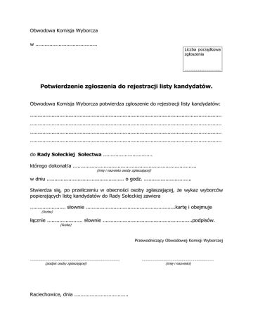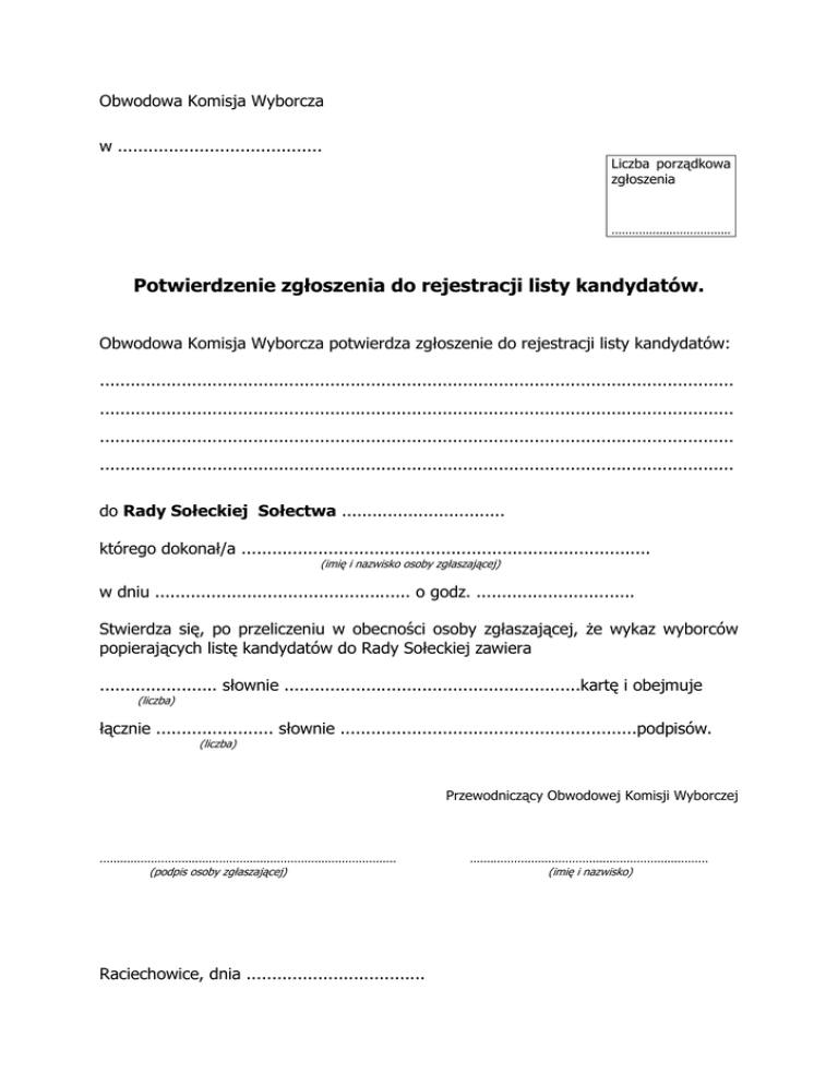 Obwodowa Komisja Wyborcza w ........................................ Liczba porządkowa zgłoszenia ................................... Potwierdzenie zgłoszenia do rejestracji listy kandydatów. Obwodowa Komisja Wyborcza potwierdza zgłoszenie do rejestracji listy kandydatów: ............................................................................................................................ ............................................................................................................................ ............................................................................................................................ ............................................................................................................................ do Rady Sołeckiej Sołectwa ................................ którego dokonał/a ................................................................................ (imię i nazwisko osoby zgłaszającej) w dniu .................................................. o godz. ............................... Stwierdza się, po przeliczeniu w obecności osoby zgłaszającej, że wykaz wyborców popierających listę kandydatów do Rady Sołeckiej zawiera ....................... słownie ..........................................................kartę i obejmuje (liczba) łącznie ....................... słownie ..........................................................podpisów. (liczba) Przewodniczący Obwodowej Komisji Wyborczej ....................................................................................... (podpis osoby zgłaszającej) Raciechowice, dnia ................................... ...................................................................... (imię i nazwisko)