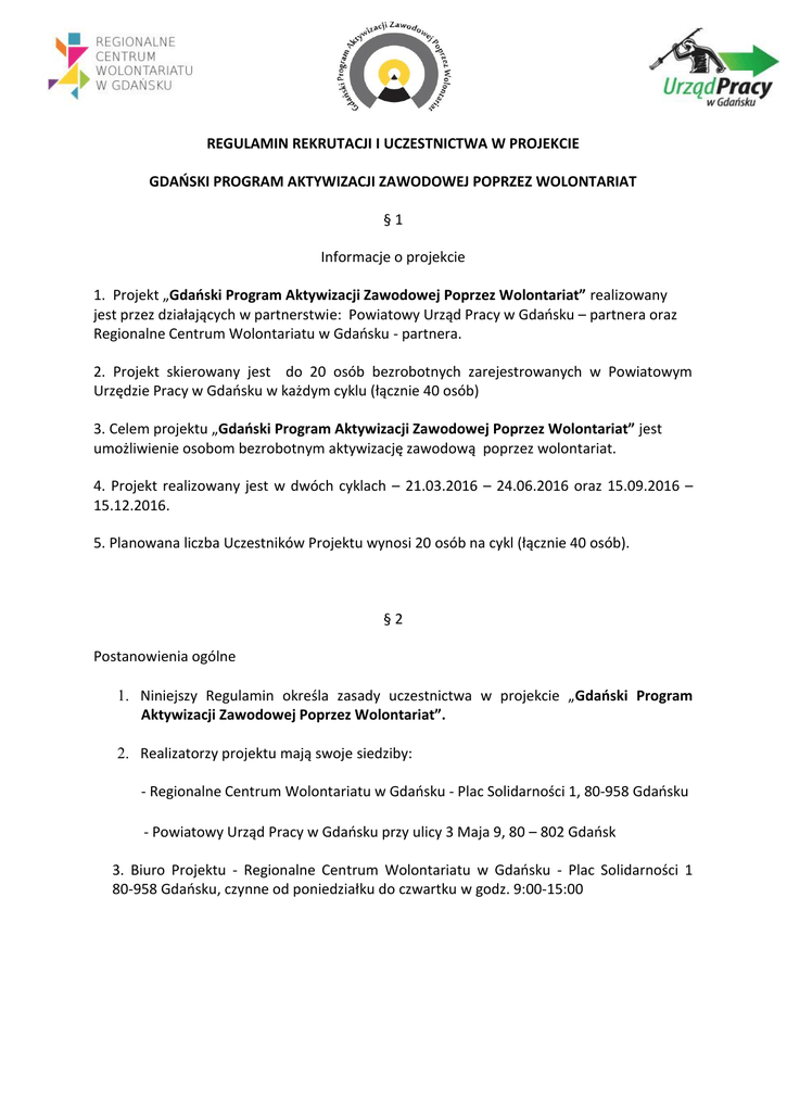 REGULAMIN REKRUTACJI I UCZESTNICTWA W PROJEKCIE GDAŃSKI PROGRAM AKTYWIZACJI ZAWODOWEJ POPRZEZ WOLONTARIAT §1 Informacje o projekcie 1. Projekt „Gdański Program Aktywizacji Zawodowej Poprzez Wolontariat” realizowany jest przez działających w partnerstwie: Powiatowy Urząd Pracy w Gdańsku – partnera oraz Regionalne Centrum Wolontariatu w Gdańsku - partnera. 2. Projekt skierowany jest do 20 osób bezrobotnych zarejestrowanych w Powiatowym Urzędzie Pracy w Gdańsku w każdym cyklu (łącznie 40 osób) 3. Celem projektu „Gdański Program Aktywizacji Zawodowej Poprzez Wolontariat” jest umożliwienie osobom bezrobotnym aktywizację zawodową poprzez wolontariat. 4. Projekt realizowany jest w dwóch cyklach – 21.03.2016 – 24.06.2016 oraz 15.09.2016 – 15.12.2016. 5. Planowana liczba Uczestników Projektu wynosi 20 osób na cykl (łącznie 40 osób). §2 Postanowienia ogólne Niniejszy Regulamin określa zasady uczestnictwa w projekcie „Gdański Program Aktywizacji Zawodowej Poprzez Wolontariat”. Realizatorzy projektu mają swoje siedziby: - Regionalne Centrum Wolontariatu w Gdańsku - Plac Solidarności 1, 80-958 Gdańsku - Powiatowy Urząd Pracy w Gdańsku przy ulicy 3 Maja 9, 80 – 802 Gdańsk 3. Biuro Projektu - Regionalne Centrum Wolontariatu w Gdańsku - Plac Solidarności 1 80-958 Gdańsku, czynne od poniedziałku do czwartku w godz. 9:00-15:00 §3 Warunki uczestnictwa w projekcie 1. W Projekcie może brać udział osoba, która jest osobą bezrobotną zarejestrowaną w Powiatowym Urzędzie Pracy w Gdańsku. 2. Uczestnik Projektu jest zobowiązany do wypełnienia w Biurze Projektu formularza rekrutacyjnego oraz dostarczenie CV. 3. Po przyjęciu na wolontariat Uczestnik zobowiązuje się do podpisania kontraktu przed rozpoczęciem pierwszego dnia odbywania wolontariatu. 4. Każda osoba ma prawo do uczestnictwa w niniejszym Projekcie tylko raz. 5. Realizator Projektu nie ponosi dodatkowych kosztów związanych z organizacją wolontariatu. 6. Wolontariat to dobrowolna, bezpłatna, świadoma praca na rzecz Instytucji Przyjmującej w wymiarze 45 godzin (max. w przeciągu 1,5 miesiąca) §4 Zasady rekrutacji do Projektu 1. Rekrutacja Uczestników Projektu prowadzona będzie w sposób ciągły w terminie: - CYKL I - 21.03.2016 – 24.06.2016 - CYKL II - 15.09.2016 – 15.12.2016 , gdzie zrekrutowanych przez Powiatowy Urząd Pracy w Gdańsku zostanie łącznie 20 uczestników w każdym cyklu (łącznie 40 osób) 2. Warunkiem objęcia Kandydata procesem rekrutacyjnym jest prawidłowe wypełnienie i podpisanie Formularza Rekrutacyjnego w Biurze Projektu oraz dostarczenie Curriculum Vitae. 3. Brak zgody na przetwarzanie danych osobowych uniemożliwia włączenie kandydata do Projektu. 4. Złożenie Formularza Rekrutacyjnego i oświadczenia nie jest równoznaczne z zakwalifikowaniem do Projektu, o zakwalifikowaniu do Projektu Kandydata informuje realizator Projektu (Regionalne Centrum Wolontariatu w Gdańsku) w terminie 7 dni od dostarczenia dokumentów. 5. O zakwalifikowaniu do Projektu uczestnik zostanie poinformowany telefonicznie lub mailowo. §5 Prawa i obowiązki Realizatora Projektu 1. Realizator Projektu zobowiązuje się do: a) organizacji i przeprowadzenia wolontariatu w organizacjach pozarządowych lub instytucjach publicznych 2. Realizator Projektu ma prawo do: a) kontaktów telefonicznych z Uczestnikiem Projektu związanych z organizacją wolontariatu. b) rozwiązania Kontraktu w przypadku, gdy Uczestnik Projektu w sposób uporczywy nie uczestniczy w wolontariacie lub w inny sposób narusza postanowienia Regulaminu lub w przypadku wystąpienia innych przyczyn zewnętrznych, niezależnych od Realizatora Projektu. c) wzajemnego przepływu informacji o przebiegu wolontariatu pomiędzy organizacją Przyjmującą na wolontariat, a Partnerami §6 Prawa i obowiązki Uczestnika Projektu 1. Uczestnik Projektu ma prawo do zgłaszania swoich uwag dotyczących realizacji Projektu. 2. Uczestnik Projektu zobowiązuje się do aktywnego i regularnego uczestnictwa w wolontariacie zorganizowanym przez Realizatora Projektu, który wybrał uczestnik Projektu. 3. Uczestnik Projektu zobowiązany jest do: a) udzielania informacji w ramach monitoringu i ewaluacji Projektu (w formie ankiet, wywiadów, itd.), b) wyrażenia zgody na wykorzystanie do celów związanych z realizacją i upowszechnianiem rezultatów Projektu wszelkich informacji zawartych w Formularzu Rekrutacyjnym i Kontrakcie, c) wyrażenia zgody na wykorzystywanie swojego wizerunku na potrzeby promocji i upowszechniania rezultatów Projektu (m.in. zdjęcia). 4. Uczestnik projektu ma prawo do rezygnacji z dalszego udziału w projekcie, ale jest on zobowiązany do poinformowania Biura Projektu o zaistniałej sytuacji. 5. Każdemu Uczestnikowi Programu przysługują darmowe przejazdy komunikacją miejską (autobusy i tramwaje) na terenie Miasta Gdańska na podstawie uchwały Rady Miasta Gdańska nr XVI/444/2015 Rady Miasta Gdańska dnia 26.11.2015 r. w sprawie uchwalenia miejskiego programu „Wsparcie dla aktywnie poszukujących pracy na lata 2016 – 2017” na podstawie „Karty Osoby Aktywnie Poszukującej Pracy” wydanej przez Powiatowy Urząd Pracy oraz w soboty i niedziele na podstawie identyfikatorów wolontariuszy wydanych przez Regionalne Centrum Wolontariatu wydanych na wspólną, pisemną prośbę Instytucji Przyjmującej oraz Uczestnika Projektu. §7 Zasady uczestnictwa w Wolontariacie 1. Wolontariat: a) Wolontariat będzie realizowany w Instytucji przyjmującej zgodnie z Kontraktem (porozumieniem wolontariackim). b) Okres Wolontariatu wynosi 1,5 miesiąca. W tym czasie Uczestnik Projektu musi być wolontariuszem minimum 45h. c) Za okres odbywania Wolontariatu Uczestnikowi Projektu nie przysługuje stypendium. d) Podczas Wolontariatu nad Uczestnikami Projektu opiekę sprawować będzie koordynator wolontariusza w organizacji. Nad przebiegiem wolontariatu w organizacjach i instytucjach czuwać będzie pracownik 
