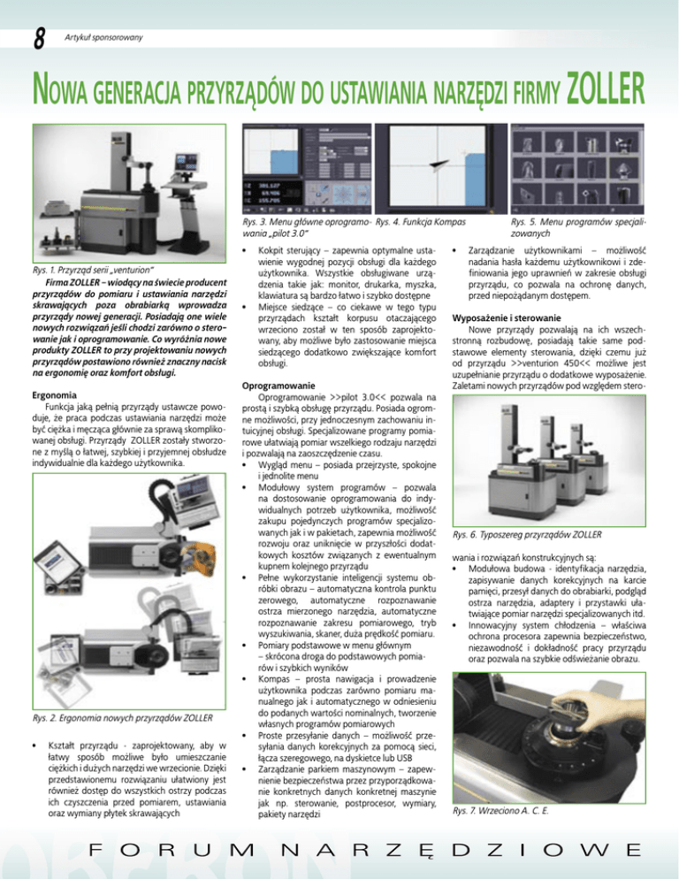 8 Artykuł sponsorowany NOWA GENERACJA PRZYRZĄDÓW DO USTAWIANIA NARZĘDZI FIRMY ZOLLER Rys. 3. Menu główne oprogramo- Rys. 4. Funkcja Kompas wania „pilot 3.0” • Rys. 1. Przyrząd serii „venturion” Firma ZOLLER – wiodący na świecie producent przyrządów do pomiaru i ustawiania narzędzi skrawających poza obrabiarką wprowadza przyrządy nowej generacji. Posiadają one wiele nowych rozwiązań jeśli chodzi zarówno o sterowanie jak i oprogramowanie. Co wyró¿nia nowe produkty ZOLLER to przy projektowaniu nowych przyrządów postawiono równie¿ znaczny nacisk na ergonomię oraz komfort obsługi. Ergonomia Funkcja jaką pełnią przyrządy ustawcze powoduje, ¿e praca podczas ustawiania narzędzi mo¿e być cię¿ka i męcząca głównie za sprawą skomplikowanej obsługi. Przyrządy ZOLLER zostały stworzone z myślą o łatwej, szybkiej i przyjemnej obsłudze indywidualnie dla ka¿dego u¿ytkownika. Rys. 2. Ergonomia nowych przyrządów ZOLLER • Kształt przyrządu - zaprojektowany, aby w łatwy sposób mo¿liwe było umieszczanie cię¿kich i du¿ych narzędzi we wrzecionie. Dzięki przedstawionemu rozwiązaniu ułatwiony jest równie¿ dostęp do wszystkich ostrzy podczas ich czyszczenia przed pomiarem, ustawiania oraz wymiany płytek skrawających • Kokpit sterujący – zapewnia optymalne ustawienie wygodnej pozycji obsługi dla ka¿dego u¿ytkownika. Wszystkie obsługiwane urządzenia takie jak: monitor, drukarka, myszka, klawiatura są bardzo łatwo i szybko dostępne Miejsce siedzące – co ciekawe w tego typu przyrządach kształt korpusu otaczającego wrzeciono został w ten sposób zaprojektowany, aby mo¿liwe było zastosowanie miejsca siedzącego dodatkowo zwiększające komfort obsługi. Oprogramowanie Oprogramowanie >>pilot 3.0<< pozwala na prostą i szybką obsługę przyrządu. Posiada ogromne mo¿liwości, przy jednoczesnym zachowaniu intuicyjnej obsługi. Specjalizowane programy pomiarowe ułatwiają pomiar wszelkiego rodzaju narzędzi i pozwalają na zaoszczędzenie czasu. • Wygląd menu – posiada przejrzyste, spokojne i jednolite menu • Modułowy system programów – pozwala na dostosowanie oprogramowania do indywidualnych potrzeb u¿ytkownika, mo¿liwość zakupu pojedynczych programów specjalizowanych jak i w pakietach, zapewnia mo¿liwość rozwoju oraz uniknięcie w przyszłości dodatkowych kosztów związanych z ewentualnym kupnem kolejnego przyrządu • Pełne wykorzystanie inteligencji systemu obróbki obrazu – automatyczna kontrola punktu zerowego, automatyczne rozpoznawanie ostrza mierzonego narzędzia, automatyczne rozpoznawanie zakresu pomiarowego, tryb wyszukiwania, skaner, du¿a prędkość pomiaru. • Pomiary podstawowe w menu głównym – skrócona droga do podstawowych pomiarów i szybkich wyników • Kompas – prosta nawigacja i prowadzenie u¿ytkownika podczas zarówno pomiaru manualnego jak i automatycznego w odniesieniu do podanych wartości nominalnych, tworzenie własnych programów pomiarowych • Proste przesyłanie danych – mo¿liwość przesyłania danych korekcyjnych za pomocą sieci, łącza szeregowego, na dyskietce lub USB • Zarządzanie parkiem maszynowym – zapewnienie bezpieczeństwa przez przyporządkowanie konkretnych danych konkretnej maszynie jak np. sterowanie, postprocesor, wymiary, pakiety narzędzi • Rys. 5. Menu programów specjalizowanych Zarządzanie u¿ytkownikami – mo¿liwość nadania hasła ka¿demu u¿ytkownikowi i zdefiniowania jego uprawnień w zakresie obsługi przyrządu, co pozwala na ochronę danych, przed niepo¿ądanym dostępem. Wyposa¿enie i sterowanie Nowe przyrządy pozwalają na ich wszechstronną rozbudowę, posiadają takie same podstawowe elementy sterowania, dzięki czemu ju¿ od przyrządu >>venturion 450<< mo¿liwe jest uzupełnianie przyrządu o dodatkowe wyposa¿enie. Zaletami nowych przyrządów pod względem stero- Rys. 6. Typoszereg przyrządów ZOLLER wania i rozwiązań konstrukcyjnych są: • Modułowa budowa - identyfikacja narzędzia, zapisywanie danych korekcyjnych na karcie pamięci, przesył danych do obrabiarki, podgląd ostrza narzędzia, adaptery i przystawki ułatwiające pomiar narzędzi specjalizowanych itd. • Innowacyjny system chłodzenia – właściwa ochrona procesora zapewnia bezpieczeństwo, niezawodność i dokładność pracy przyrządu oraz pozwala na szybkie odświe¿anie obrazu. Rys. 7. Wrzeciono A. C. E. 9 Artykuł sponsorowany • • Wrzeciono A.C.E – uniwersalne wrzeciono z systemem zaciskowego mocowania narzędzi dla oprawek SK, HSK, CAPTO i KM zapewnia niezmienną siłę zacisku, oraz szybką i dokładną zmianę narzędzi. Zastosowanie markowych produktów – zapewnia długą ¿ywotność wysoką dokładność przy niskich kosztach konserwacji i utrzymania. Koszty Wykorzystanie przyrządów ustawiania narzędzi ma głębokie uzasadnienie ekonomiczne. Ogólnie wiadomo, ¿e systemy ustawiania narzędzi na obrabiarkach co prawda spełniają swoją rolę, jeśli chodzi o samo ustawienie narzędzi, ale jednocześnie generują koszty związane z przestojem maszyny obróbczej. Dlatego te¿ coraz większe zastosowanie mają przyrządy do pomiaru i ustawiania narzędzi poza obrabiarką. Inwestując w przyrząd do ustawiania narzędzi firmy ZOLLER mo¿na zyskać nawet 30.000 PLN rocznie. Wynika to z prostych obliczeń przy następujących zało¿eniach: • • • 8-godzinny tryb pracy, zmiana 20 narzędzi dziennie, na pomiar i ustawienie jednego narzędzia potrzebne są 3 minuty, • 200 dni roboczych na rok, • koszt jednej godziny pracy obrabiarki wynosi 150 PLN. Otrzymujemy, ¿e dziennie (8 godz. roboczych) maszyna podczas przestoju, traci godzinę (3 min. x 20 narzędzi) na ustawianie narzędzi tj. 150 PLN. Przemna¿ając to przez ilość dni roboczych (200 dni) otrzymujemy 30.000 PLN. Tak więc przy prostej kalkulacji mo¿na stwierdzić, ¿e inwestując ju¿ w najprostszy przyrząd do ustawiania narzędzi zys