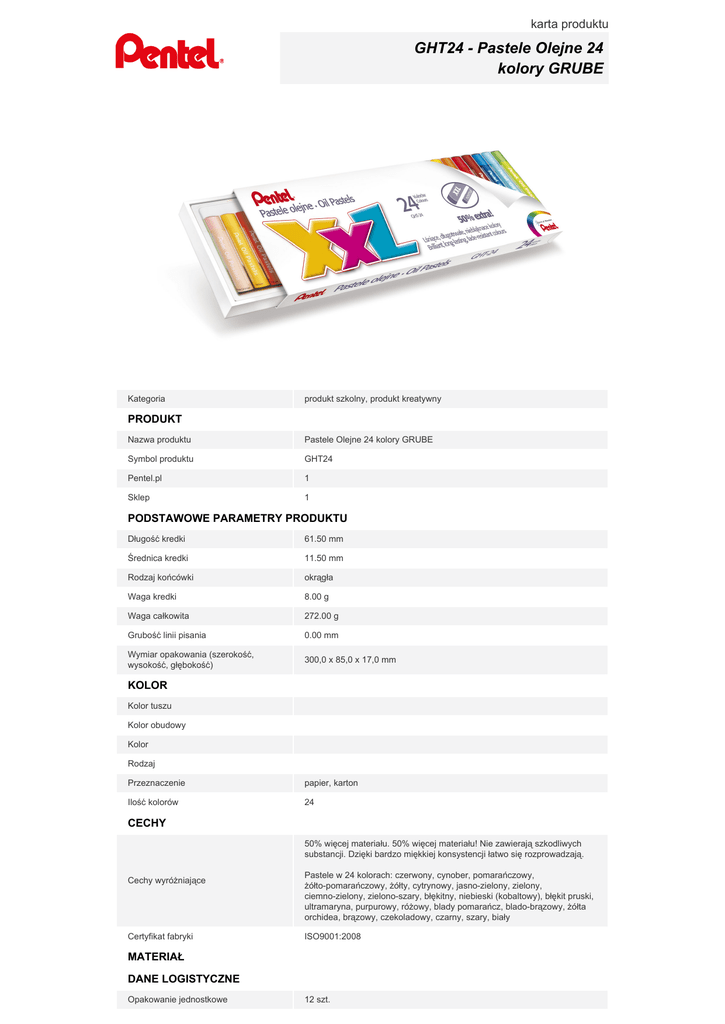 karta produktu GHT24 - Pastele Olejne 24 kolory GRUBE Kategoria produkt szkolny, produkt kreatywny PRODUKT Nazwa produktu Pastele Olejne 24 kolory GRUBE Symbol produktu GHT24 Pentel.pl 1 Sklep 1 PODSTAWOWE PARAMETRY PRODUKTU Długość kredki 61.50 mm Średnica kredki 11.50 mm Rodzaj końcówki okrągła Waga kredki 8.00 g Waga całkowita 272.00 g Grubość linii pisania 0.00 mm Wymiar opakowania (szerokość, wysokość, głębokość) 300,0 x 85,0 x 17,0 mm KOLOR Kolor tuszu Kolor obudowy Kolor Rodzaj Przeznaczenie papier, karton Ilość kolorów 24 CECHY 50% więcej materiału. 50% więcej materiału! Nie zawierają szkodliwych substancji. Dzięki bardzo miękkiej konsystencji łatwo się rozprowadzają. Cechy wyróżniające Certyfikat fabryki Pastele w 24 kolorach: czerwony, cynober, pomarańczowy, żółto-pomarańczowy, żółty, cytrynowy, jasno-zielony, zielony, ciemno-zielony, zielono-szary, błękitny, niebieski (kobaltowy), błękit pruski, ultramaryna, purpurowy, różowy, blady pomarańcz, blado-brązowy, żółta orchidea, brązowy, czekoladowy, czarny, szary, biały ISO9001:2008 MATERIAŁ DANE LOGISTYCZNE Opakowanie jednostkowe 12 szt. Opakowanie zbiorcze Kod kreskowy data wygenerowania karty: 08.03.2017 48 szt. GHT 24 4711577032085 24 kolory