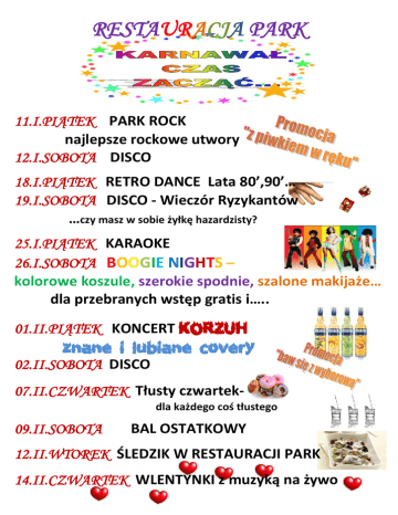 RESTAURACJA PARK 11.I.PIĄTEK PARK ROCK najlepsze rockowe utwory 12.I.SOBOTA DISCO 18.I.PIĄTEK RETRO DANCE Lata 80’,90’… 19.I.SOBOTA DISCO - Wieczór Ryzykantów …czy masz w sobie żyłkę hazardzisty? 25.I.PIĄTEK KARAOKE 26.I.SOBOTA BOOGIE NIGHTS – kolorowe koszule, szerokie spodnie, szalone makijaże… dla przebranych wstęp gratis i….. 01.II.PIĄTEK KONCERT KORZUH znane i lubiane covery 02.II.SOBOTA DISCO 07.II.CZWARTEK Tłusty czwartekdla każdego coś tłustego 09.II.SOBOTA BAL OSTATKOWY 12.II.WTOREK ŚLEDZIK W RESTAURACJI PARK 14.II.CZWARTEK WLENTYNKI z muzyką na żywo