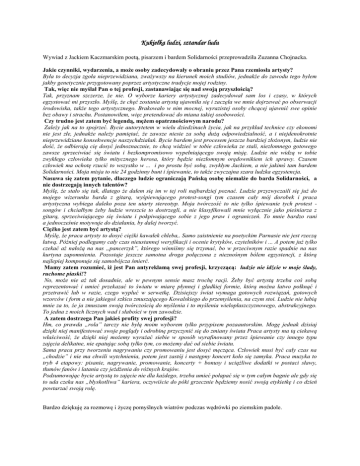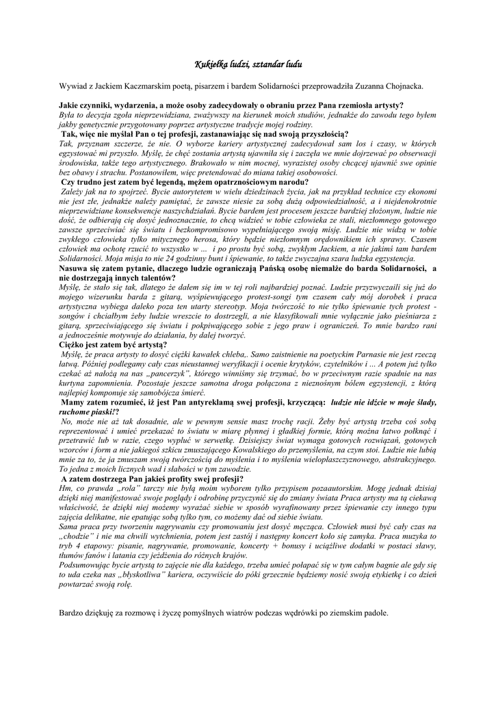 Kukiełka ludzi, sztandar ludu Wywiad z Jackiem Kaczmarskim poetą, pisarzem i bardem Solidarności przeprowadziła Zuzanna Chojnacka. Jakie czynniki, wydarzenia, a może osoby zadecydowały o obraniu przez Pana rzemiosła artysty? Była to decyzja zgoła nieprzewidziana, zważywszy na kierunek moich studiów, jednakże do zawodu tego byłem jakby genetycznie przygotowany poprzez artystyczne tradycje mojej rodziny. Tak, więc nie myślał Pan o tej profesji, zastanawiając się nad swoją przyszłością? Tak, przyznam szczerze, że nie. O wyborze kariery artystycznej zadecydował sam los i czasy, w których egzystować mi przyszło. Myślę, że chęć zostania artystą ujawniła się i zaczęła we mnie dojrzewać po obserwacji środowiska, także tego artystycznego. Brakowało w nim mocnej, wyrazistej osoby chcącej ujawnić swe opinie bez obawy i strachu. Postanowiłem, więc pretendować do miana takiej osobowości. Czy trudno jest zatem być legendą, mężem opatrznościowym narodu? Zależy jak na to spojrzeć. Bycie autorytetem w wielu dziedzinach życia, jak na przykład technice czy ekonomi nie jest złe, jednakże należy pamiętać, że zawsze niesie za sobą dużą odpowiedzialność, a i niejdenokrotnie nieprzewidziane konsekwencje naszychdziałań. Bycie bardem jest procesem jeszcze bardziej złożonym, ludzie nie dość, że odbierają cię dosyć jednoznacznie, to chcą widzieć w tobie człowieka ze stali, niezłomnego gotowego zawsze sprzeciwiać się światu i bezkompromisowo wypełniającego swoją misję. Ludzie nie widzą w tobie zwykłego człowieka tylko mitycznego herosa, który będzie niezłomnym orędownikiem ich sprawy. Czasem człowiek ma ochotę rzucić to wszystko w ... i po prostu być sobą, zwykłym Jackiem, a nie jakimś tam bardem Solidarności. Moja misja to nie 24 godzinny bunt i śpiewanie, to także zwyczajna szara ludzka egzystencja. Nasuwa się zatem pytanie, dlaczego ludzie ograniczają Pańską osobę niemalże do barda Solidarności, a nie dostrzegają innych talentów? Myślę, że stało się tak, dlatego że dałem się im w tej roli najbardziej poznać. Ludzie przyzwyczaili się już do mojego wizerunku barda z gitarą, wyśpiewującego protest-songi tym czasem cały mój dorobek i praca artystyczna wybiega daleko poza ten utarty stereotyp. Moja twórczość to nie tylko śpiewanie tych protest songów i chciałbym żeby ludzie wreszcie to dostrzegli, a nie klasyfikowali mnie wyłącznie jako pieśniarza z gitarą, sprzeciwiającego się światu i pokpiwającego sobie z jego praw i ograniczeń. To mnie bardzo rani a jednocześnie motywuje do działania, by dalej tworzyć. Ciężko jest zatem być artystą? Myślę, że praca artysty to dosyć ciężki kawałek chleba,. Samo zaistnienie na poetyckim Parnasie nie jest rzeczą łatwą. Później podlegamy cały czas nieustannej weryfikacji i ocenie krytyków, czytelników i ... A potem już tylko czekać aż nałożą na nas „pancerzyk”, którego winniśmy się trzymać, bo w przeciwnym razie spadnie na nas kurtyna zapomnienia. Pozostaje jeszcze samotna droga połączona z nieznośnym bólem egzystencji, z którą najlepiej komponuje się samobójcza śmierć. Mamy zatem rozumieć, iż jest Pan antyreklamą swej profesji, krzyczącą: ludzie nie idźcie w moje ślady, ruchome piaski!? No, może nie aż tak dosadnie, ale w pewnym sensie masz trochę racji. Żeby być artystą trzeba coś sobą reprezentować i umieć przekazać to światu w miarę płynnej i gładkiej formie, którą można łatwo połknąć i przetrawić lub w razie, czego wypluć w serwetkę. Dzisiejszy świat wymaga gotowych rozwiązań, gotowych wzorców i form a nie jakiegoś szkicu zmuszającego Kowalskiego do przemyślenia, na czym stoi. Ludzie nie lubią mnie za to, że ja zmuszam swoją twórczością do myślenia i to myślenia wielopłaszczyznowego, abstrakcyjnego. To jedna z moich licznych wad i słabości w tym zawodzie. A zatem dostrzega Pan jakieś profity swej profesji? Hm, co prawda „rola” tarczy nie byłą moim wyborem tylko przypisem pozaautorskim. Mogę jednak dzisiaj dzięki niej manifestować swoje poglądy i odrobinę przyczynić się do zmiany świata Praca artysty ma tą ciekawą właściwość, że dzięki niej możemy wyrażać siebie w sposób wyrafinowany przez śpiewanie czy innego typu zajęcia delikatne, nie epatując sobą tylko tym, co możemy dać od siebie światu. Sama praca przy tworzeniu nagrywaniu czy promowaniu jest dosyć męcząca. Człowiek musi być cały czas na „chodzie” i nie ma chwili wytchnienia, potem jest zastój i następny koncert koło się zamyka. Praca muzyka to tryb 4 etapowy: pisanie, nagrywanie, promowanie, koncerty + bonusy i uciążliwe dodatki w postaci sławy, tłumów fanów i latania czy jeżdżenia do różnych krajów. Podsumowując bycie artystą to zajęcie nie dla każdego, trzeba umieć połapać się w tym całym bagnie ale gdy się to uda czeka nas „błyskotliwa” kariera, oczywiście do póki grzecznie będziemy nosić swoją etykietkę i co dzień powtarzać swoją rolę. Bardzo dziękuję za rozmowę i życzę pomyślnych wiatrów podczas wędrówki po ziemskim padole.