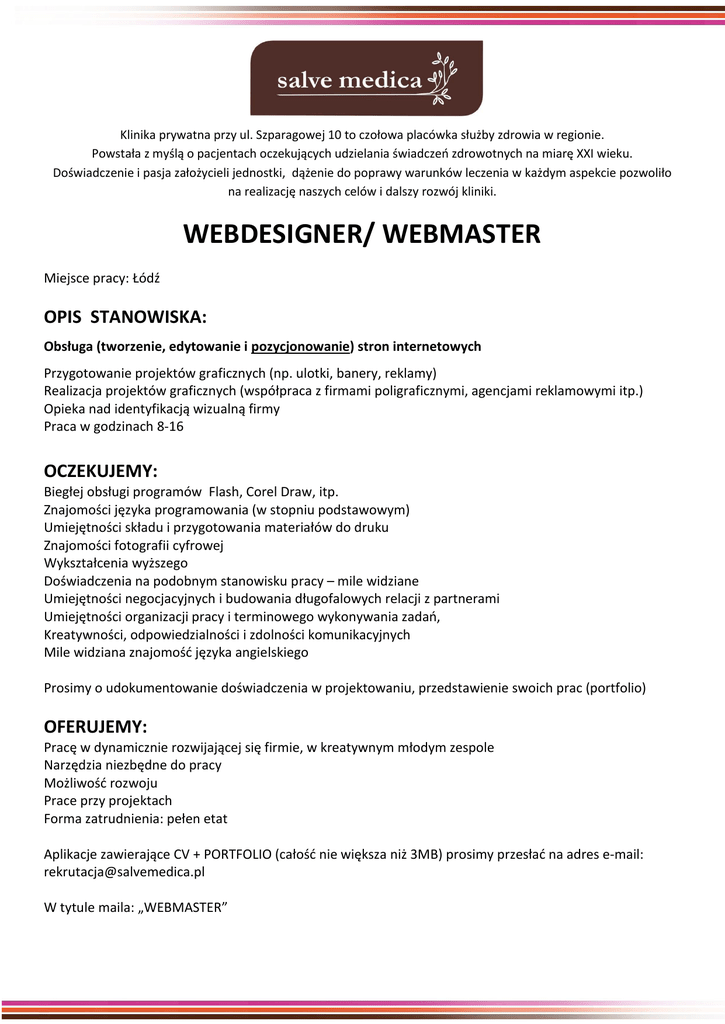 Klinika prywatna przy ul. Szparagowej 10 to czołowa placówka służby zdrowia w regionie. Powstała z myślą o pacjentach oczekujących udzielania świadczeń zdrowotnych na miarę XXI wieku. Doświadczenie i pasja założycieli jednostki, dążenie do poprawy warunków leczenia w każdym aspekcie pozwoliło na realizację naszych celów i dalszy rozwój kliniki. WEBDESIGNER/ WEBMASTER Miejsce pracy: Łódź OPIS STANOWISKA: Obsługa (tworzenie, edytowanie i pozycjonowanie) stron internetowych Przygotowanie projektów graficznych (np. ulotki, banery, reklamy) Realizacja projektów graficznych (współpraca z firmami poligraficznymi, agencjami reklamowymi itp.) Opieka nad identyfikacją wizualną firmy Praca w godzinach 8-16 OCZEKUJEMY: Biegłej obsługi programów Flash, Corel Draw, itp. Znajomości języka programowania (w stopniu podstawowym) Umiejętności składu i przygotowania materiałów do druku Znajomości fotografii cyfrowej Wykształcenia wyższego Doświadczenia na podobnym stanowisku pracy – mile widziane Umiejętności negocjacyjnych i budowania długofalowych relacji z partnerami Umiejętności organizacji pracy i terminowego wykonywania zadań, Kreatywności, odpowiedzialności i zdolności komunikacyjnych Mile widziana znajomość języka angielskiego Prosimy o udokumentowanie doświadczenia w projektowaniu, przedstawienie swoich prac (portfolio) OFERUJEMY: Pracę w dynamicznie rozwijającej się firmie, w kreatywnym młodym zespole Narzędzia niezbędne do pracy Możliwość rozwoju Prace przy projektach Forma zatrudnienia: pełen etat Aplikacje zawierające CV + PORTFOLIO (całość nie większa niż 3MB) prosimy przesłać na adres e-mail: [email protected] W tytule maila: „WEBMASTER”