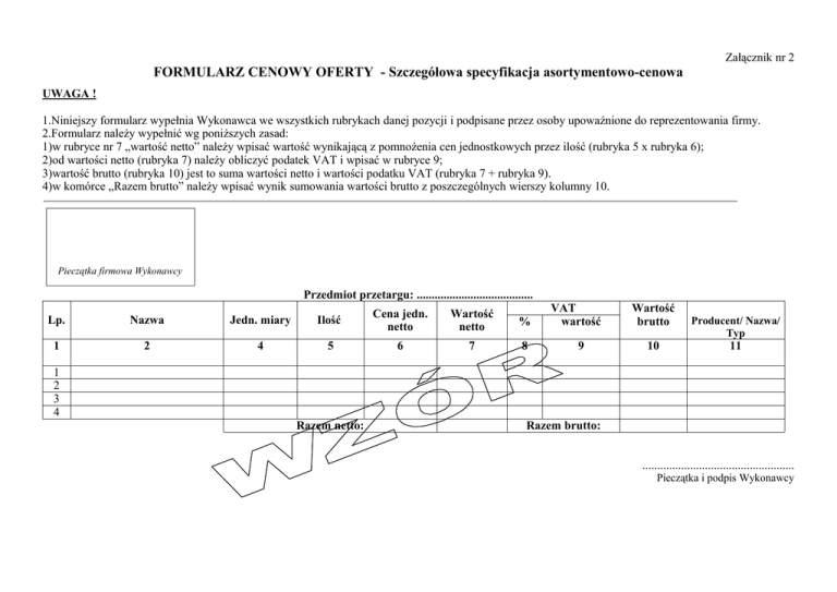 FORMULARZ CENOWY OFERTY - Szczegółowa specyfikacja