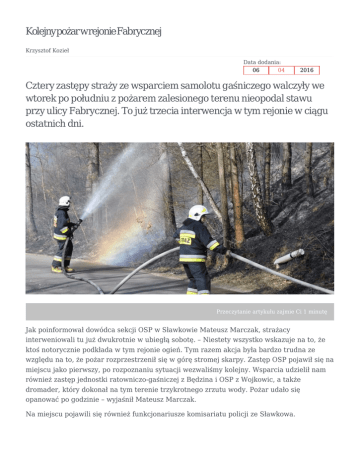 KolejnypożarwrejonieFabrycznej Krzysztof Kozieł Data dodania: 06 04 2016 Cztery zastępy straży ze wsparciem samolotu gaśniczego walczyły we wtorek po południu z pożarem zalesionego terenu nieopodal stawu przy ulicy Fabrycznej. To już trzecia interwencja w tym rejonie w ciągu ostatnich dni. Przeczytanie artykułu zajmie Ci 1 minutę Jak poinformował dowódca sekcji OSP w Sławkowie Mateusz Marczak, strażacy interweniowali tu już dwukrotnie w ubiegłą sobotę. – Niestety wszystko wskazuje na to, że ktoś notorycznie podkłada w tym rejonie ogień. Tym razem akcja była bardzo trudna ze względu na to, że pożar rozprzestrzenił się w górę stromej skarpy. Zastęp OSP pojawił się na miejscu jako pierwszy, po rozpoznaniu sytuacji wezwaliśmy kolejny. Wsparcia udzielił nam również zastęp jednostki ratowniczo-gaśniczej z Będzina i OSP z Wojkowic, a także dromader, który dokonał na tym terenie trzykrotnego zrzutu wody. Pożar udało się opanować po godzinie – wyjaśnił Mateusz Marczak. Na miejscu pojawili się również funkcjonariusze komisariatu policji ze Sławkowa. D R U KUJ D RUKUJ DO PDF http://www.slawkow.pl--www.slawkow.pl/print.php?pdf=true&unique=kolejny-pozar-w-rejonie-fabrycznej
