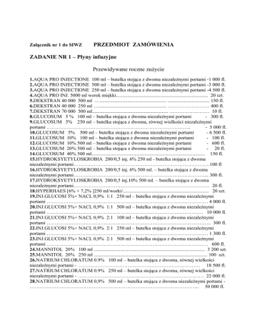 Załącznik nr 1 do SIWZ PRZEDMIOT ZAMÓWIENIA ZADANIE NR 1 – Płyny infuzyjne Przewidywane roczne zużycie 1.AQUA PRO INJECTIONE 100 ml – butelka stojąca z dwoma niezależnymi portami -1 000 fl. 2.AQUA PRO INJECTIONE 500 ml – butelka stojąca z dwoma niezależnymi portami -3 000 fl. 3.AQUA PRO INJECTIONE 250 ml – butelka stojąca z dwoma niezależnymi portami -4 500 fl. 4.AQUA PRO INJ. 5000 ml worek miękki......................................................................... 20 szt. 5.DEKSTRAN 40 000 500 ml …..................................................... ................................. 150 fl. 6.DEKSTRAN 40 000 250 ml …...................................................... ……………………. 400 fl. 7.DEKSTRAN 70 000 500 ml............................................................ …………………… 10 fl. 8.GLUCOSUM 5 % 100 ml – butelka stojąca z dwoma niezależnymi portami - 300 fl. 9.GLUCOSUM 5% 250 ml – butelka stojąca z dwoma, równej wielkości niezależnymi portami ………………………………………………………………………….. - 5 000 fl. 10.GLUCOSUM 5% 500 ml – butelka stojąca z dwoma niezależnymi portami - 6 500 fl. 11.GLUCOSUM 10% 100 ml – butelka stojąca z dwoma niezależnymi portami - 100 fl. 12.GLUCOSUM 10% 500 ml – butelka stojąca z dwoma niezależnymi portami - 600 fl. 13.GLUCOSUM 20% 500 ml – butelka stojąca z dwoma niezależnymi portami - 20 fl. 14.GLUCOSUM 40% 500 ml.......................................................................................... 150 fl. 15.HYDROKSYETYLOSKROBIA 200/0,5 inj. 6% 250 ml - butelka stojąca z dwoma niezależnymi portami………………………………………………………………………100 fl 16.HYDROKSYETYLOSKROBIA 200/0,5 inj. 6% 500 ml. – butelka stojąca z dwoma niezależnymi portami……………………………………………………………………... 300 fl. 17.HYDROKSYETYLOSKROBIA 200/0,5 inj.10% 500 ml. – butelka stojąca z dwoma niezależnymi portami……………………………………………………………………… 20 fl. 18.HYPERHAES [6% + 7,2% ]250 ml/worki/.................................................................... 20 szt. 19.INJ.GLUCOSI 5%+ NACL 0,9% 1:1 250 ml – butelka stojąca z dwoma niezależnymi portami …………………………………………………………………………………… 4 000 fl. 20.INJ.GLUCOSI 5%+ NACL 0,9% 1:1 500 ml – butelka stojąca z dwoma niezależnymi portami ………………………………………………………………………………… 10 000 fl. 21.INJ.GLUCOSI 5%+ NACL 0,9% 2:1 100 ml – butelka stojąca z dwoma niezależnymi portami …………………………………………………………………………………….. 300 fl. 22.INJ.GLUCOSI 5%+ NACL 0,9% 2:1 250 ml – butelka stojąca z dwoma niezależnymi portami …………………………………………………………………………………… 1 300 fl. 23.INJ.GLUCOSI 5%+ NACL 0,9% 2:1 500 ml – butelka stojąca z dwoma niezależnymi portami …………………………………………………………………………………… 600 fl. 24.MANNITOL 20% 100 ml ........................................................................................ 3 200 szt. 25.MANNITOL 20% 250 ml .......................................................................................... 100 szt. 26.NATRIUM CHLORATUM 0.9% 100 ml – butelka stojąca z dwoma, równej wielkości niezależnymi portami - ……………………………………………………………… 18 500 fl. 27.NATRIUM CHLORATUM 0.9% 250 ml – butelka stojąca z dwoma, równej wielkości niezależnymi portami - ………………………………………………………………… 22 000 fl. 28.NATRIUM CHLORATUM 0,9% 500 ml – butelka stojąca z dwoma niezależnymi portami ……………………………………………………………………………………….. 50 000 fl. 29.NATRIUM CHLORATUM 0.9% - butelki z odkręcanym korkiem - 500 ml............................................................................................500 fl. - 1000 ml..........................................................................................400 fl. 30.NATRIUM CHLORATUM 0,9% 500 ml – butelka stojąca z ukręcanym „motylkiem” zabezpieczona w dodatkowym opakowaniu typu ecolav estericlen ....200 fl. 31.NATRIUM CHLORATUM 0.9% 3000 ml worek miękki............. 400 szt. 32.PŁYN FIZJOLOGICZNY WIELOELEKTROLITOWY 250 ml – butelka stojąca z dwoma niezależnymi portami ……………………………………………….. 1 000 fl. 33.PŁYN FIZJOLOGICZNY WIELOELEKTROLITOWY 500 ml – butelka stojąca z dwoma niezależnymi portami ........................................................................ 22 000 fl. 34.VOLUVEN 130/04 6%- 250ml. – butelka stojąca z dwoma niezależnymi portami - 30 szt. ZADANIE NR 2 – Heparyny,leki działające na układ oddechowy Przewidywane roczne zużycie 1.CISATRACURIUM / NIMBEX / inj.0,01 g/5 ml x 5 amp......................................35 op. 2.CEFUROXIMUM granulat do sporządzania zaw.doust.250 mg/5 ml 50 ml...........5 op. 3.FLUTICASONE PROPIONATE 0,05 mg/dawkę fl.120 dawek aerozol..................10 op. 4.FLUTICASONE PROPIONATE 0,125 mg/dawkę fl.120 dawek aerozol................10 op. 5.FLUTICASONE 250 mcg + 50 mcg SALMETEROLU/ SERETIDE DYSK /........60 op. 6.FLUTICASONE 500 mcg + 50 mcg SALMETEROLU/ SERETIDE DYSK /........60 op. 7.NADROPARINE CALCIUM 2850 j.m./0,3 ml x 1 amp.-strzyk.......................2 300 szt. 8.NADROPARINE CALCIUM 5700 j.m./0,6 ml x 1 amp.-strzyk......................... 800 szt. 9.SURFACTANT /CUROSURF / zawiesina do stos.do tch. i do oskrzel. / 120 mg/ 1,5 ml / x 2 fiol. a 1,5 ml........................................................6 op. ZADANIE NR 3 – Leki nasercowe,heparyny drobnocząste