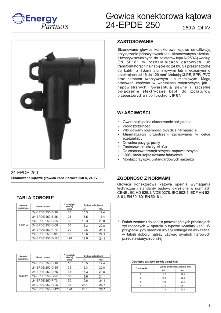 G³owica konektorowa k¹towa 24-EPDE 250 250 A, 24 kV Energy Partners ZASTOSOWANIE Ekranowane g³owice konektorowe k¹towe umo¿liwiaj¹ przy³¹czanie jedno¿y³owych kabli ekranowanych o izolacji z tworzyw sztucznychi do izolatorów typu A (250 A) wed³ug EN 50181 w rozdzielnicach gazowych lub transformatorach na napiêcie do 24 kV. S¹ przeznaczone do kabli z ¿y³ami aluminiowymi lub miedzianymi o przekrojach od 16 do 120 mm2, izolacj¹ XLPE, EPR, PVC oraz ekranem tworzywowym lub metalowym. Mog¹ pracowaæ zarówno w warunkach wnêtrzowych jak i napowietrznych. Gwarantuj¹ pewne i szczelne po³¹czenie elektryczne kabli do izolatorów przepustowych o stopniu ochrony IP 67. W£AŒCIWOŒCI ? Gwarantuje pe³ne ekranowanie po³¹czenia ? Wodoszczelnoœæ ? Wbudowany pojemnoœciowy dzielnik napiêcia ? Minimalizacja przestrzeni zajmowanej w celce rozdzielnicy ? Dowolna pozycja pracy ? Zastosowanie dla ¿y³ Al i Cu ? Do zastosowañ wnêtrzowych i napowietrznych ? 100% produkcji testowana fabrycznie ? Monta¿ przy u¿yciu standardowych narzêdzi 24-EPDE 250 ZGODNOŒÆ Z NORMAMI Ekranowana k¹towa g³owica konektorowa 250 A, 24 kV G³owica konektorowa k¹towa spe³nia wymagania techniczne i standardy budowy okreœlone w normiach CENELEC HD 629.1, VDE 0278, IEC 502-4, EDF HN 52S-61, EN 50180 i EN 50181. TABLA DOBORU* Napiêcie znamionowe 8,7/15 kV Napiêcie znamionowe 12/20 kV Numer zestawu 24-EPDE 250-B-16 24-EPDE 250-B-25 24-EPDE 250-D-35 24-EPDE 250-D-50 24-EPDE 250-F-70 24-EPDE 250-F-95 24-EPDE 250-F-120 Numer zestawu 24-EPDE 250-B-16 24-EPDE 250-D-25 24-EPDE 250-D-35 24-EPDE 250-F-50 24-EPDE 250-F-70 24-EPDE 250-H-95 24-EPDE 250-H-120 Przekrój ¿y³y roboczej 2 (mm ) 16 25 35 50 70 95 120 Przekrój ¿y³y roboczej 2 (mm ) 16 25 35 50 70 95 120 Œrednica izolacji (mm) Min. Max. 13.5 13.5 16.3 17.4 17.4 20.8 16.3 19.6 19.6 19.6 20.8 24.1 24.1 24.1 * Dobór zestawu do kabli o poszczególnych przekrojach ¿y³ roboczych w oparciu o typowe wymiary kabli. W przypadku gdy œrednica izolacji odbiega od wskazanej w tabeli doboru nale¿y u¿ywaæ symboli literowych przedstawionych poni¿ej Œrednica izolacji (mm) Min. Max. 13.5 16.3 16.3 17.4 20.8 20.8 19.6 19.6 23.1 23.1 24.1 24.1 28.7 28.7 Oznaczenia zakresów œrednic izolacji kabli Oznaczenie Zakres œrednic izolacji kabla (mm) Min. Max. B 13.5 17.4 D 16.3 20.8 F 19.6 24.1 H 23.1 28.7 J 27.9 33.5 1 Budowa g³owicy 1. Bolec pr¹dowy 3 4 2 Ocynowany, miedziany trzpieñ wkrêcany w otwór koñcówki przy pomocy za³¹czonego klucza imbusowego. 1 2. Ekran wewnêtrzny Zintegrowana warstwa z przewodz¹cej gumy EPDM ekranuje tor pr¹dowy. 3. Izolacja 1l 1 10 ´ 5 Warstwa izolacyjna z EPDM o specjalnie dobranej formule gwarantuj¹cej wysok¹ jakoœæ izolacji. 9 6 4. Wspornik klamry mocuj¹cej Wtopione w korpus oczko ze stali nierdzewnej z zaczepem do klamry mocuj¹cej. 8 5. Pojemnoœciowy dzielnik napiêcia Pojemnoœciowy dzielnik napiêcia umo¿liwia sprawdzenie obecnoœci napiêcia. Kapturek z gumy EPDM zapewnia uszczelnienie przeciwko wilgoci. 7 6. Sterowanie pola elektrycznego 192 66 Sto¿kowy kszta³t dolnej czêœci korpusu z zewnêtrzn¹ warstw¹ pó³przewodz¹c¹ umo¿liwia sterowanie geometryczne pola elektrycznego. 160* 145* 19. MM .7 7 950 F IN 4.1 6-2 0 -. 170 90 MAX DE250 250A 24 kV 62 32 100 Wymiary w mm *Aby umo¿liwiæ od³¹czenie g³owicy nale¿y zwiêkszyæ wymiar o 55 mm 24-EPDE 250 Ekranowana k¹towa g³owica konektorowa 250 A, 24 kV Korpus g³owicy wykonany jest z gumy EPDM. Posiada on zintegrowane sterowanie geometryczne. Od zewn¹trz pokryty jest warstw¹ pó³przewodz¹cej gumy EPDM, która dziêki po³¹czeniu realizowanym poprzez przewód uziemienia uzyskuje potencja³ ¿y³y powrotnej. Gwarantuje to, przy prawid³owym monta¿u g³owicy, ca³kowite bezpieczeñstwo w przypadku niezamierzonego dotkniêcia jej powierzchni. Tor pr¹dowy stanowi bimetalowa, zaprasowywana koñcówka kablowa i wkrêcany bolec ³¹cz¹cy j¹ z gniazdem izolatora. G³owica posiada zintegrowany pojemnoœciowy dzielnik napiêcia zabezpieczony uziemionym kapturkiem z gumy pó³przewodz¹cej. 2 7. Uszczelnienie wejœcia kabla 2.5 85 Starannie dobrany rozmiar gwarantuje dopasowanie niezbêdne dla zapewnienia uszczelnienie przeciwko wilgoci. 8. Ekran zewnêtrzny Warstwa pó³przewodz¹cej gumy EPDM ³¹czy siê ekranem fabrycznym kabla zapewniaj¹c ci¹g³oœæ ekranowania i umo¿liwia wyprowadzenie potencja³u ¿y³y powrotnej na powierzchniê g³owicy 9. Oczko do przewodu uziemienia Zespolone z ekranem zewnêtrznym, umo¿liwia zamocowanie przewodu uziemiaj¹cego. 10. Koñcówka Bimetalowa zaprasowywana koñcówka kablowa z gwintem do ¿y³ aluminiowych i miedzianych. 11. Rowek na pierœcieñ mocuj¹cy Miejsce dla opcjonalnego trójfazowego pierœcienia mocuj¹cego. 12. Klamra mocuj¹ca ze stali nierdzewnej Zabezpiecza w³aœciwe mocowanie g³owicy do izolatora