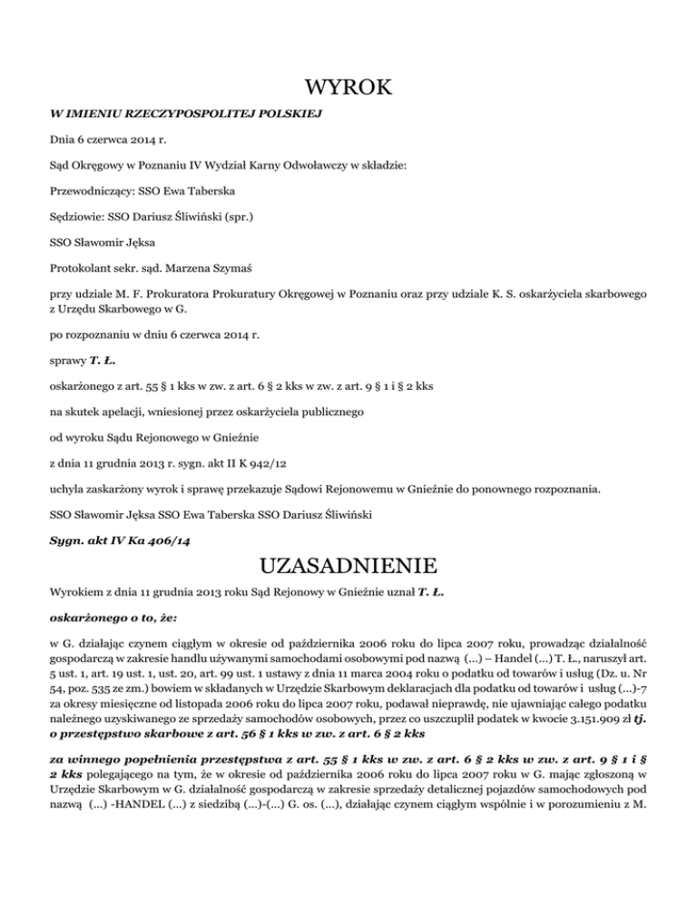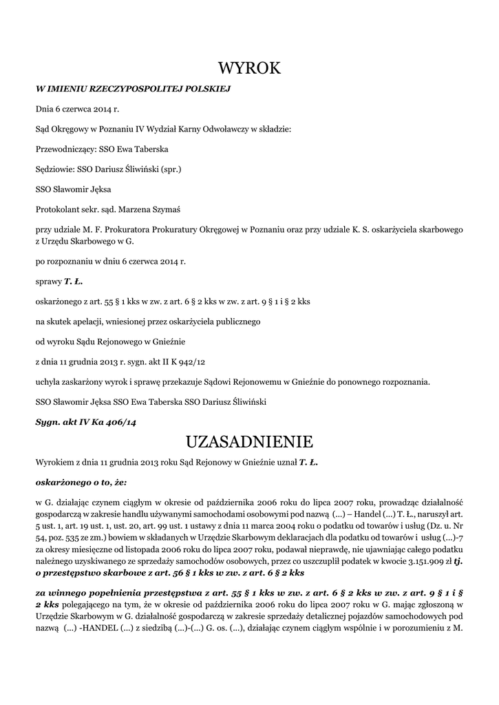 WYROK W IMIENIU RZECZYPOSPOLITEJ POLSKIEJ Dnia 6 czerwca 2014 r. Sąd Okręgowy w Poznaniu IV Wydział Karny Odwoławczy w składzie: Przewodniczący: SSO Ewa Taberska Sędziowie: SSO Dariusz Śliwiński (spr.) SSO Sławomir Jęksa Protokolant sekr. sąd. Marzena Szymaś przy udziale M. F. Prokuratora Prokuratury Okręgowej w Poznaniu oraz przy udziale K. S. oskarżyciela skarbowego z Urzędu Skarbowego w G. po rozpoznaniu w dniu 6 czerwca 2014 r. sprawy T. Ł. oskarżonego z art. 55 § 1 kks w zw. z art. 6 § 2 kks w zw. z art. 9 § 1 i § 2 kks na skutek apelacji, wniesionej przez oskarżyciela publicznego od wyroku Sądu Rejonowego w Gnieźnie z dnia 11 grudnia 2013 r. sygn. akt II K 942/12 uchyla zaskarżony wyrok i sprawę przekazuje Sądowi Rejonowemu w Gnieźnie do ponownego rozpoznania. SSO Sławomir Jęksa SSO Ewa Taberska SSO Dariusz Śliwiński Sygn. akt IV Ka 406/14 UZASADNIENIE Wyrokiem z dnia 11 grudnia 2013 roku Sąd Rejonowy w Gnieźnie uznał T. Ł. oskarżonego o to, że: w G. działając czynem ciągłym w okresie od października 2006 roku do lipca 2007 roku, prowadząc działalność gospodarczą w zakresie handlu używanymi samochodami osobowymi pod nazwą (...) – Handel (...) T. Ł., naruszył art. 5 ust. 1, art. 19 ust. 1, ust. 20, art. 99 ust. 1 ustawy z dnia 11 marca 2004 roku o podatku od towarów i usług (Dz. u. Nr 54, poz. 535 ze zm.) bowiem w składanych w Urzędzie Skarbowym deklaracjach dla podatku od towarów i usług (...)-7 za okresy miesięczne od listopada 2006 roku do lipca 2007 roku, podawał nieprawdę, nie ujawniając całego podatku należnego uzyskiwanego ze sprzedaży samochodów osobowych, przez co uszczuplił podatek w kwocie 3.151.909 zł tj. o przestępstwo skarbowe z art. 56 § 1 kks w zw. z art. 6 § 2 kks za winnego popełnienia przestępstwa z art. 55 § 1 kks w zw. z art. 6 § 2 kks w zw. z art. 9 § 1 i § 2 kks polegającego na tym, że w okresie od października 2006 roku do lipca 2007 roku w G. mając zgłoszoną w Urzędzie Skarbowym w G. działalność gospodarczą w zakresie sprzedaży detalicznej pojazdów samochodowych pod nazwą (...) -HANDEL (...) z siedzibą (...)-(...) G. os. (...), działając czynem ciągłym wspólnie i w porozumieniu z M. A. zam. (...)-(...) G., M. 5E umożliwił się posługiwaniem swoim iminiem i nazwiskiem oraz firmą w celu dokonywania sprzedaży samochodów osobowych w sposób zorganizowany, ciągły, mający niewątpliwie charakter pozarolniczej działalności gospodarczej w zakresie sprzedaży samochodów osobowych w celu zatajenia rzeczywistych rozmiarów tej działalności, której to działalności gospodarczej na własny rachunek M. A. nie zgłosił w Urzędzie Skarbowym w G., przez co doprowadził do uszczuplenia podatku od towarów i usług w kwocie nie mniejszej niż 3.151.909 zł i za to na podstawie powołanych przepisów wymierza mu karę 1 (jednego) roku pozbawienia wolności i karę grzywny w wysokości 100 (stu) stawek dziennych po 60 (sześćdziesiąt) złotych. Na podstawie art. 20 § 2 kks w zw. z art. 69 § 1 k.k. i art. 70 § 1 pkt 1 k.k. wykonanie kary pozbawienia wolności warunkowo zawiesza na okres 5 (pięciu) lat i w tym czasie oddaje go na podstawie art. 73 § 1 k.k. pod dozór kuratora sądowego. Na podstawie art. 41 § 2 i § 4 pkt 1 kks orzekł obowiązek uiszczenia należności publicznoprawnej w kwocie 3.151.909 zł w terminie 5 lat od uprawomocnienia się wyroku oraz orzekł o kosztach postępowania. zwalniając oskarżonego od obowiązku zwrotu Skarbowi Państwa kosztów postępowania sądowego w całości i nie wymierzył mu opłaty. Apelację od powyższego wyroku złożył oskarżyciel publiczny Urząd Skarbowy w G. zarzucając mu błąd w ustaleniach faktycznych polegający na błędnym stwierdzeniu, że działanie oskarżonego wypełniło znamiona czynu z art. z art. 55 § 1 kks w zw. z art. 6 § 2 kks podczas gdy prawidłowa ocena prowadzić może tylko do przypisania mu czynu z art. 56 § 1 kks w zw. z art. 6 § 2 kks. W konkluzji wniósł o uchylenie zaskarżonego wyroku i przekazanie sprawy do ponownego rozpoznania ewentualnie o wydanie decyzji reformatoryjnej i przyjcie popełnienia przez oskarżonego czynu z z art. 56 § 1 kks w zw. z art. 6 § 2 kks. Sąd Okręgowy stwierdza, co następuje: Apelacja okazała się potrzebna albowiem spowodowała konieczność uchylenia zaskarżonej decyzji i przekazania sprawy do ponownego rozpoznania. Należy stwierdzić, że w ocenie Sądu Okręgowego, iż uzasadnienie wyroku Sądu I instancji nie odpowiada wymogom przewidzianym w art. 424 § 1 i 2 kpk i tym samym nie poddaje się kontroli instancyjnej. Wskazać należy, iż uchybieniem przemawiającym za koniecznością uchylenia orzeczenia był brak wyjaśnienia podstawy prawnej wyroku. Sąd Rejonowy w części zważającej uzasadnienia ograniczył się jedynie do rozważań dotyczących przyjętej kwalifikacji prawnej z art.55 §1 kks. Jednocześnie jednak w żaden sposób, nawet jednym słowem, nie odniósł się, do dokonanej przez siebie zmiany kwalifikacji prawnej. Całkowicie bowiem pominął wyjaśnienie dlaczego dokonał w/w zmiany a zwłaszcza dlaczego nie uznał, że proponowana przez oskarżyciela publicznego kwalifikacja prawna z art.56 §1 kks jest prawidłowa. Taka konstrukcja uzasadnienia jest oczywiście błędna albowiem całkowicie pozbawia Sąd Okręgowy możliwości skontrolowania toku rozumowania Sądu Rejonowego w kwestii dokonanej zmiany kwalifikacji prawnej przypisanego oskarżonemu czynu a zwłaszcza wyjaśnienia dlaczego uznał, że kwalifikacja z art. 56 §1 kks jest nieprawidłowa. Podkreślić też należy, że w niniejszej sprawie jest to o tyle istotne, że właśnie zmiana kwalifikacji prawnej został zakwestionowana w apelacji oskarżyciela publicznego, który domaga się powrotu do kwalifikacji z art.56 §1 kks. Brak więc rozważań Sądu Rejonowego w zakresie wyjaśnienia jakie okoliczności przemawiały w jego ocenie za nie prz