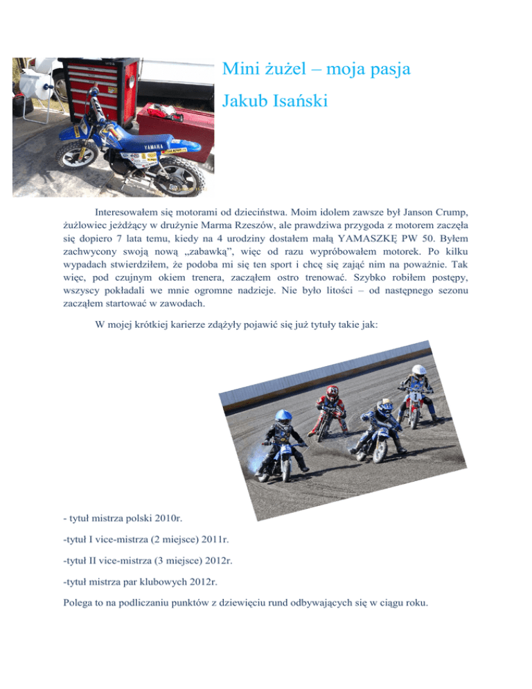Mini żużel – moja pasja Jakub Isański Interesowałem się motorami od dzieciństwa. Moim idolem zawsze był Janson Crump, żużlowiec jeżdżący w drużynie Marma Rzeszów, ale prawdziwa przygoda z motorem zaczęła się dopiero 7 lata temu, kiedy na 4 urodziny dostałem małą YAMASZKĘ PW 50. Byłem zachwycony swoją nową „zabawką”, więc od razu wypróbowałem motorek. Po kilku wypadach stwierdziłem, że podoba mi się ten sport i chcę się zająć nim na poważnie. Tak więc, pod czujnym okiem trenera, zacząłem ostro trenować. Szybko robiłem postępy, wszyscy pokładali we mnie ogromne nadzieje. Nie było litości – od następnego sezonu zacząłem startować w zawodach. W mojej krótkiej karierze zdążyły pojawić się już tytuły takie jak: - tytuł mistrza polski 2010r. -tytuł I vice-mistrza (2 miejsce) 2011r. -tytuł II vice-mistrza (3 miejsce) 2012r. -tytuł mistrza par klubowych 2012r. Polega to na podliczaniu punktów z dziewięciu rund odbywających się w ciągu roku.