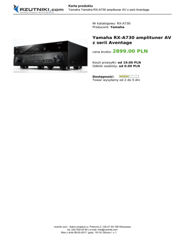 Karta produktu Yamaha Yamaha RX-A730 amplituner AV z serii Aventage Nr katalogowy: RX-A730 Producent: Yamaha Yamaha RX-A730 amplituner AV z serii Aventage cena brutto: 2899.00 PLN Koszt przesyłki: od 19.00 PLN Odbiór osobisty: od 0.00 PLN Dostępność: Towar wysyłamy od 2 do 5 dni rzutniki.com - Salon projekcji ul. Pokorna 2 / U6,U7 00-199 Warszawa tel. (22) 530 63 50 | e-mail: [email protected] Stan z dnia 08-03-2017, godz. 19:19 | Strona 1 z 1