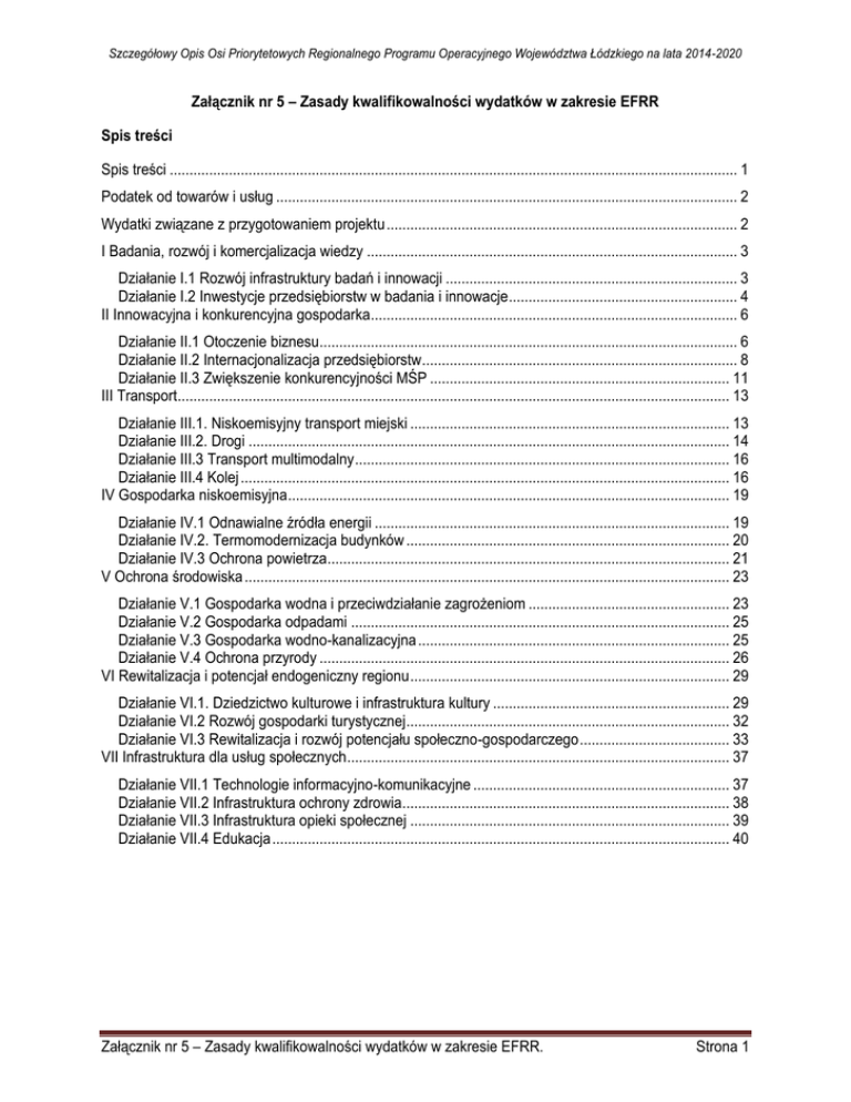 Szczegółowy Opis Osi Priorytetowych Regionalnego Programu Operacyjnego Województwa Łódzkiego na lata 2014-2020 Załącznik nr 5 – Zasady kwalifikowalności wydatków w zakresie EFRR Spis treści Spis treści ................................................................................................................................................ 1 Podatek od towarów i usług ..................................................................................................................... 2 Wydatki związane z przygotowaniem projektu ......................................................................................... 2 I Badania, rozwój i komercjalizacja wiedzy .............................................................................................. 3 Działanie I.1 Rozwój infrastruktury badań i innowacji .......................................................................... 3 Działanie I.2 Inwestycje przedsiębiorstw w badania i innowacje .......................................................... 4 II Innowacyjna i konkurencyjna gospodarka............................................................................................. 6 Działanie II.1 Otoczenie biznesu.......................................................................................................... 6 Działanie II.2 Internacjonalizacja przedsiębiorstw................................................................................ 8 Działanie II.3 Zwiększenie konkurencyjności MŚP ............................................................................ 11 III Transport............................................................................................................................................ 13 Działanie III.1. Niskoemisyjny transport miejski ................................................................................. 13 Działanie III.2. Drogi .......................................................................................................................... 14 Działanie III.3 Transport multimodalny ............................................................................................... 16 Działanie III.4 Kolej ............................................................................................................................ 16 IV Gospodarka niskoemisyjna ................................................................................................................ 19 Działanie IV.1 Odnawialne źródła energii .......................................................................................... 19 Działanie IV.2. Termomodernizacja budynków .................................................................................. 20 Działanie IV.3 Ochrona powietrza...................................................................................................... 21 V Ochrona środowiska ........................................................................................................................... 23 Działanie V.1 Gospodarka wodna i przeciwdziałanie zagrożeniom ................................................... 23 Działanie V.2 Gospodarka odpadami ................................................................................................ 25 Działanie V.3 Gospodarka wodno-kanalizacyjna ............................................................................... 25 Działanie V.4 Ochrona przyrody ........................................................................................................ 26 VI Rewitalizacja i potencjał endogeniczny regionu ................................................................................. 29 Działanie VI.1. Dziedzictwo kulturowe i infrastruktura kultury ............................................................ 29 Działanie VI.2 Rozwój gospodarki turystycznej.................................................................................. 32 Działanie VI.3 Rewitalizacja i rozwój potencjału społeczno-gospodarczego ...................................... 33 VII Infrastruktura dla usług społecznych................................................................................................. 37 Działanie VII.1 Technologie informacyjno-komunikacyjne ................................................................. 37 Działanie VII.2 Infrastruktura ochrony zdrowia................................................................................... 38 Działanie VII.3 Infrastruktura opieki społecznej ................................................................................. 39 Działanie VII.4 Edukacja .................................................................................................................... 40 Załącznik nr 5 – Zasady kwalifikowalności wydatków w zakresie EFRR. Strona 1 Szczegółowy Opis Osi Priorytetowych Regionalnego Programu Operacyjnego Województwa Łódzkiego na lata 2014-2020 Podatek od towarów i usług Podatek od towarów i usług może zostać uznany za wydatek kwalifikowalny w projektach współfinansowanych z EFRR realizowanych w ramach następujących działań RPO WŁ na lata 20142020: Oś priorytetowa III Transport, Działanie III.2. Drogi; Oś priorytetowa VII Infrastruktura dla usług społecznych, Działanie VII.2 Infrastruktura ochrony zdrowia W zakresie pozostałych działań RPO WŁ na lata 2014-2020 współfinansowanych z EFRR podatek od towarów i usług stanowi wydatek niekwalifikowalny. Wydatki związane z przygotowaniem projektu Wydatki dotyczące opracowania dokumentacji związanej z przygotowaniem projektu mogą zostać uznane za kwalifikowalne, jeśli dokumentacja taka jest wymagana przez prawo krajowe bądź wspólnotowe albo przez Instytucję Zarządzającą RPO WŁ lub Instytucję Pośredniczącą oraz konieczność jej opracowania wynika bezpośrednio ze specyfiki projektu. Dotyczy to w szczególności: − wydatków na analizy; − wydatków na opracowanie biznes planu; − wyda