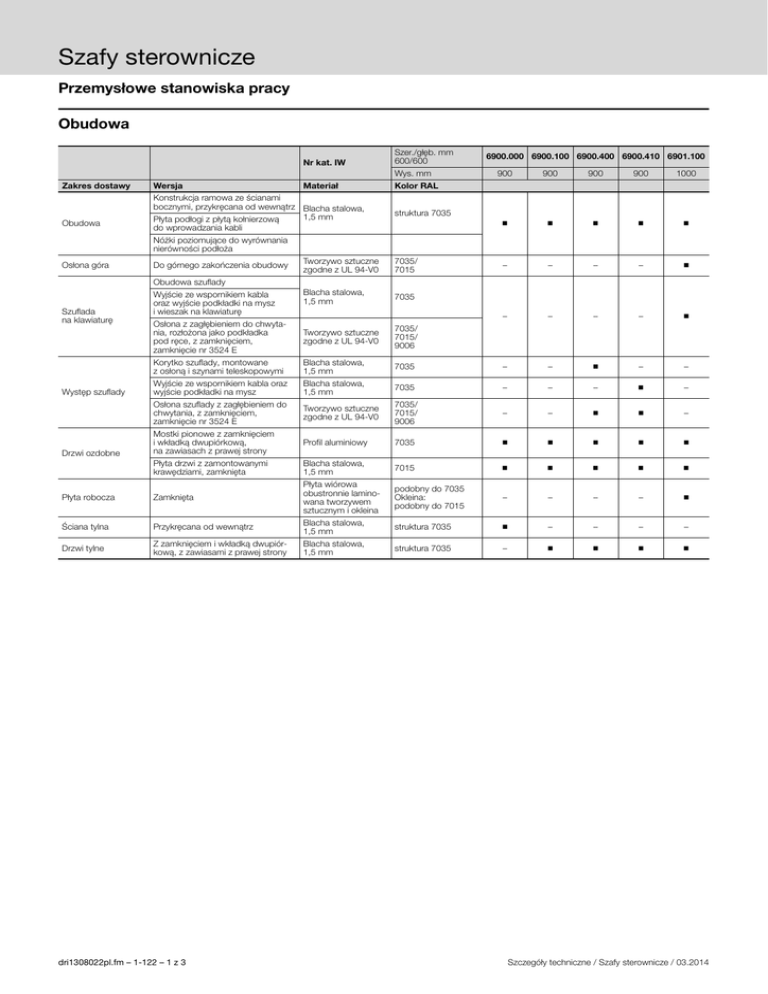 Szafy sterownicze Przemysłowe stanowiska pracy Obudowa Nr kat. IW Szer./głęb. mm 600/600 Wys. mm Zakres dostawy Obudowa Wersja Materiał Konstrukcja ramowa ze ścianami bocznymi, przykręcana od wewnątrz Blacha stalowa, 1,5 mm Płyta podłogi z płytą kołnierzową do wprowadzania kabli 6900.000 6900.100 6900.400 6900.410 6901.100 900 900 900 900 1000 ◾ ◾ ◾ ◾ ◾ – – – – ◾ – – – – ◾ Kolor RAL struktura 7035 Nóżki poziomujące do wyrównania nierówności podłoża Tworzywo sztuczne zgodne z UL 94-V0 7035/ 7015 Blacha stalowa, 1,5 mm 7035 Osłona z zagłębieniem do chwytania, rozłożona jako podkładka pod ręce, z zamknięciem, zamknięcie nr 3524 E Tworzywo sztuczne zgodne z UL 94-V0 7035/ 7015/ 9006 Korytko szuflady, montowane z osłoną i szynami teleskopowymi Blacha stalowa, 1,5 mm 7035 – – ◾ – – Wyjście ze wspornikiem kabla oraz wyjście podkładki na mysz Blacha stalowa, 1,5 mm 7035 – – – ◾ – Osłona szuflady z zagłębieniem do chwytania, z zamknięciem, zamknięcie nr 3524 E Tworzywo sztuczne zgodne z UL 94-V0 7035/ 7015/ 9006 – – ◾ ◾ – Mostki pionowe z zamknięciem i wkładką dwupiórkową, na zawiasach z prawej strony Profil aluminiowy 7035 ◾ ◾ ◾ ◾ ◾ Płyta drzwi z zamontowanymi krawędziami, zamknięta Blacha stalowa, 1,5 mm 7015 ◾ ◾ ◾ ◾ ◾ Płyta robocza Zamknięta Płyta wiórowa obustronnie laminowana tworzywem sztucznym i okleina podobny do 7035 Okleina: podobny do 7015 – – – – ◾ Ściana tylna Przykręcana od wewnątrz Blacha stalowa, 1,5 mm struktura 7035 ◾ – – – – Drzwi tylne Z zamknięciem i wkładką dwupiórkową, z zawiasami z prawej strony Blacha stalowa, 1,5 mm struktura 7035 – ◾ ◾ ◾ ◾ Osłona góra Do górnego zakończenia obudowy Obudowa szuflady Szuflada na klawiaturę Występ szuflady Drzwi ozdobne Wyjście ze wspornikiem kabla oraz wyjście podkładki na mysz i wieszak na klawiaturę dri1308022pl.fm – 1-122 – 1 z 3 Szczegóły techniczne / Szafy sterownicze / 03.2014 Szafy sterownicze Przemysłowe stanowiska pracy Obudowa Obudowa IW 6900.000, IW 6900.100 3 1 812 900 869 512 512 362 2 (636) 652 Drzwi tylne do IW 6900.100 Ściana tylna do 6900.000, wymiary w nawiasach Drzwi ozdobne do IW 6900.000, IW 6900.100 Obudowa IW 6901.100 Obudowa IW 6900.400, IW 6900.410 512 512 669 237 608 512 118 465 (533) 145 309 (240) 75 60 145 86.5 512 912 1043 902 812 526 362 362 636 604 889 Wymiary w nawiasach tylko dla IW 6900.410 636 604 Obudowa monitora IW 6902.500 510 597 458 460 502 385 600 Szczegóły techniczne / Szafy sterownicze / 03.2014 636 dri1308022pl.fm – 1-122 – 2 z 3 Szafy sterownicze Przemysłowe stanowiska pracy Płyty robocze Płyta robocza, mała IW 6902.300 Płyta robocza IW 6902.100 Płyta robocza, przygotowana do podpory stojącej IW 6902.310 950 1000 490 895 761 645 618 t = 38 600 260 610 t = 38 t = 38 dri1308022pl.fm – 1-122 – 3 z 3 R100 0 590 400 Szczegóły techniczne / Szafy sterownicze / 03.2014