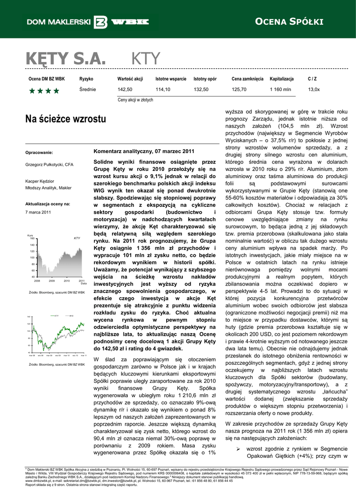 OCENA SPÓŁKI KĘTY S.A. Ocena DM BZ WBK KTY Ryzyko Wartość akcji Istotne wsparcie Istotny opór Cena zamknięcia Kapitalizacja C/Z Średnie 142,50 114,10 132,50 125,70 1 160 mln 13,0x Ceny akcji w złotych Na ścieŜce wzrostu Komentarz analityczny, 07 marzec 2011 Opracowanie: Grzegorz Pułkotycki, CFA Kacper Kędzior Młodszy Analityk, Makler Aktualizacja oceny na: 7 marca 2011 Kurs 160 KTY 140 120 100 80 60 40 2008 2009 2010 2011 Data Źródło: Bloomberg, szacunki DM BZ WBK KTY 140 W IG 120 100 80 60 Solidne wyniki finansowe osiągnięte przez Grupę Kęty w roku 2010 przełoŜyły się na wzrost kursu akcji o 9,1% jednak w relacji do szerokiego benchmarku polskich akcji indeksu WIG wynik ten okazał się ponad dwukrotnie słabszy. Spodziewając się stopniowej poprawy w segmentach z ekspozycją na cykliczne sektory gospodarki (budownictwo i motoryzacja) w nadchodzących kwartałach wierzymy, Ŝe akcję Kęt charakteryzować się będą relatywną siłą względem szerokiego rynku. Na 2011 rok prognozujemy, Ŝe Grupa Kęty osiągnie 1 356 mln zł przychodów i wypracuje 101 mln zł zysku netto, co będzie rekordowym wynikiem w historii spółki. UwaŜamy, Ŝe potencjał wynikający z szybszego wejścia na ścieŜkę wzrostu nakładów inwestycyjnych jest wyŜszy od ryzyka znacznego spowolnienia gospodarczego, w efekcie czego inwestycja w akcje Kęt prezentuje się atrakcyjnie z punktu widzenia rozkładu zysku do ryzyka. Choć aktualna wycena rynkowa w pewnym stopniu odzwierciedla optymistyczne perspektywy na najbliŜsze lata, to aktualizując naszą Ocenę podnosimy cenę docelową 1 akcji Grupy Kęty do 142,50 zł i rating do 4 gwiazdek. 40 mar 08 wrz 08 mar 09 wrz 09 mar 10 wrz 10 mar 11 Źródło: Bloomberg, szacunki DM BZ WBK W ślad za poprawiającym się otoczeniem gospodarczym zarówno w Polsce jak i w krajach będących kluczowymi kierunkami eksportowymi Spółki poprawie uległy zaraportowane za rok 2010 wyniki finansowe Grupy Kęty. Spółka wygenerowała w ubiegłym roku 1 210,6 mln zł przychodów ze sprzedaŜy, co oznaczało 9%-ową dynamikę r/r i okazało się wynikiem o ponad 8% lepszym od naszych załoŜeń zaprezentowanych w poprzednim raporcie. Jeszcze większą dynamiką charakteryzował się zysk netto, którego wzrost do 90,4 mln zł oznacza niemal 30%-ową poprawę w porównaniu z 2009 rokiem. Masa zysku wygenerowana przez Spółkę okazała się o 1% wyŜsza od skorygowanej w górę w trakcie roku prognozy Zarządu, jednak istotnie niŜsza od naszych załoŜeń (104,5 mln zł). Wzrost przychodów (największy w Segmencie Wyrobów Wyciskanych – o 37,5% r/r) to pokłosie z jednej strony wzrostów wolumenów sprzedaŜy, a z drugiej strony silnego wzrostu cen aluminium, którego średnia cena wyraŜona w dolarach wzrosła w 2010 roku o 29% r/r. Aluminium, złom aluminiowy oraz taśma aluminiowa do produkcji folii są podstawowymi surowcami wykorzystywanymi w Grupie Kęty (stanowią one 55-60% kosztów materiałów i odpowiadają za 30% całkowitych kosztów). ChociaŜ w relacjach z odbiorcami Grupa Kęty stosuje tzw. formuły cenowe uwzględniające zmiany na rynku surowcowym, to będąca jedną z jej składowych tzw. premia przerobowa (skalkulowana jako stała nominalnie wartość) w obliczu tak duŜego wzrostu ceny aluminium wpływa na spadek marŜy. Po istotnych inwestycjach, jakie miały miejsce na w Polsce w ostatnich latach na rynku istnieje nierównowaga pomiędzy wolnymi mocami produkcyjnymi a realnym popytem, których zbilansowania moŜna oczekiwać dopiero w perspektywie 4-5 lat. Prowadzi to do sytuacji w której pozycja konkurencyjna przetwórców aluminium wobec swoich odbiorców jest słabsza (ograniczone moŜliwości negocjacji premii) niŜ ma to miejsce w przypadku dostawców, którymi są huty (gdzie premia przerobowa kształtuje się w okolicach 200 USD, co jest poziomem rekordowym i prawie 4-krotnie wyŜszym od notowanego jeszcze dwa lata temu). Obecnie nie odnajdujemy jednak przesłanek do istotnego obniŜenia rentowności w poszczególnych segmentach, gdyŜ z jednej strony oczekujemy w najbliŜszych latach wzrostu kluczowych dla Spółki sektorów (budowlany, spoŜywczy, motoryzacyjny/transportowy), a z drugiej systematycznego wzrostu „łańcucha” wartości dodanej (zwiększanie sprzedaŜy produktów o większym stopniu przetworzenia) i rozszerzania oferty o nowe produkty. W zakresie przychodów ze sprzedaŜy Grupy Kęty nasza prognoza na 2011 rok (1 356 mln zł) opiera się na następujących załoŜeniach: wzrost zgodnie z rynkiem w Segmencie Opakowań Giętkich (+4%); przy czym w " Dom Maklerski BZ WBK Spółka Akcyjna z siedzibą w Poznaniu, Pl. Wolności 15, 60-697 Poznań, wpisany do rejestru przedsiębiorców Krajowego Rejestru Sądowego prowadzonego przez Sąd Rejonowy Poznań - Nowe Miasto i Wilda, VIII Wydział Gospodarczy Krajowego Rejestru Sądowego, pod numerem KRS 0000006408, o kapitale zakładowym w wysokości 45 073 400 zł w pełni wpłaconym, NIP 778-13-59-968, będącym spółką zaleŜną Banku Zachodniego WBK S.A., działającym pod nadzorem Komisji Nadzoru Finansowego." Niniejszy dokument stanowi publikację handlową. www.dmbzwbk.pl, e-mail: [email protected], [email protected], pl. Wolności 15, 60-967 Poznań, tel.: 61 856 48 80, 61 856 44 45 Raport składa się z 9 stron. Ostatnia strona stanowi integralną część raportu. KĘTY S.A. Ocena DM BZ WBK KTY Ryzyko Wartość akcji Istotne wsparcie Istotny opór Cena zamknięcia Kapitalizacja C/Z Średnie 142,50 114,10 132,50 125,70 1 160 mln 13,0x Ceny akcji w złotych kolejnych latach spodziewamy się, tempa wzrostu przewyŜszającego dynamikę PKB, a źródłami szybszego wzrostu będzie m.in. wzrost udziału produktów eco-friendly (według raportu firmy Pike Research z 2010 roku wartość rynku tego typu opakowań w 2014 roku podwoi się w porównaniu z 2009) oraz zwiększenie eksportu na rynki Europy Zachodniej dzięki współpracy z globalnymi koncernami (n
