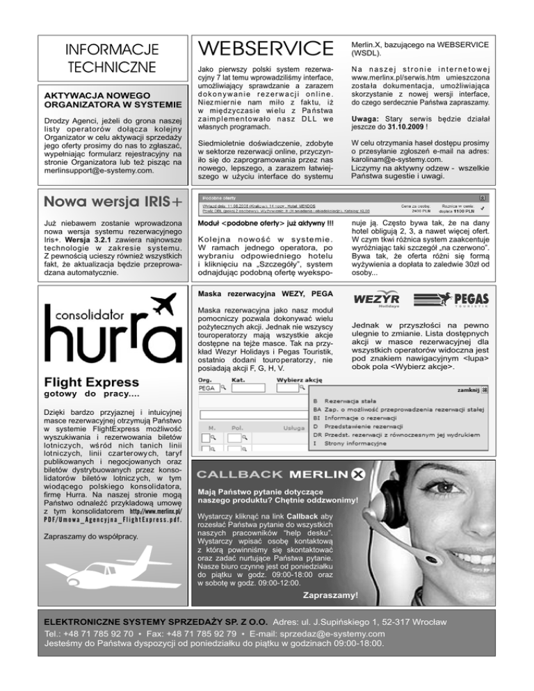 AKTYWACJA NOWEGO ORGANIZATORA W SYSTEMIE Drodzy Agenci, je¿eli do grona naszej listy operatorów do³¹cza kolejny Organizator w celu aktywacji sprzeda¿y jego oferty prosimy do nas to zg³aszaæ, wype³niaj¹c formularz rejestracyjny na stronie Organizatora lub te¿ pisz¹c na [email protected]. WEBSERVICE Merlin.X, bazujàcego na WEBSERVICE (WSDL). Jako pierwszy polski system rezerwacyjny 7 lat temu wprowadziliúmy interface, umoýliwiajàcy sprawdzanie a zarazem dokonywanie rezerwacji online. Niez mier ni e nam miùo z fak tu, iý w miædzyczasie wi elu z Pa ñstwa zaimplementowaùo nasz DLL we wùasnych programach. Na naszej stronie internetowej www.merlinx.pl/serwis.htm umieszczona zosta ùa dokumentacja, umoýliwiajàca skorzystanie z nowej wersji interface, do czego serdecznie Pañstwa zapraszamy. Uwaga: Stary serwis bædzie dziaùaù jeszcze do 31.10.2009 ! Siedmioletnie doúwiadczenie, zdobyte w sektorze rezerwacji online, przyczyniùo siæ do zaprogramowania przez nas nowego, lepszego, a zarazem ùatwiejszego w uýyciu interface do systemu W celu otrzymania haseù dostæpu prosimy o przesyùanie zgùoszeñ e-mail na adres: [email protected]. Liczymy na aktywny odzew - wszelkie Pañstwa sugestie i uwagi. Kolejna nowoœæ w systemie. W ramach jednego operatora, po wybraniu odpowiedniego hotelu i klikniêciu na „Szczegó³y”, system odnajduj¹c podobn¹ ofertê wyekspo- nuje j¹. Czêsto bywa tak, ¿e na dany hotel obliguj¹ 2, 3, a nawet wiêcej ofert. W czym tkwi ró¿nica system zaakcentuje wyró¿niaj¹c taki szczegó³ „na czerwono”. Bywa tak, ¿e oferta ró¿ni siê form¹ wy¿ywienia a dop³ata to zaledwie 30z³ od osoby... Nowa wersja IRIS+ Ju¿ niebawem zostanie wprowadzona nowa wersja systemu rezerwacyjnego Iris+. Wersja 3.2.1 zawiera najnowsze technologie w zakresie systemu. Z pewnoœci¹ ucieszy równie¿ wszystkich fakt, ¿e aktualizacja bêdzie przeprowadzana automatycznie. Maska rezerwacyjna WEZY, PEGA Maska rezerwacyjna jako nasz modu³ pomocniczy pozwala dokonywaæ wielu po¿ytecznych akcji. Jednak nie wszyscy touroperatorzy maj¹ wszystkie akcje dostêpne na tej¿e masce. Tak na przyk³ad Wezyr Holidays i Pegas Touristik, ostatnio dodani touro peratorzy, nie posiadaj¹ akcji F, G, H, V. Jednak w przysz³oœci na pewno ulegnie to zmianie. Lista dostêpnych akcji w masce rezerwacyjnej dla wszystkich operatorów widoczna jest pod znakiem nawigacyjnym <lupa> obok pola <Wybierz akcje>. Flight Express gotowy do pracy.... Dziêki bardzo przyjaznej i intuicyjnej masce rezerwacyjnej otrzymuj¹ Pañstwo w systemie FlightExpress mo¿liwoœæ wyszukiwania i rezerwowania biletów lotniczych, wœród nich tanich linii lotniczych, linii czarterowy ch, taryf publikowanych i negocjowanych oraz biletów dystrybuowanych przez konsolidatorów biletó w lotnicz ych, w tym wiod¹cego polskiego konsolidatora, firmê Hurra. Na naszej stronie mog¹ Pañstwo odnaleŸæ przykladow¹ umowê z tym konsolidatorem http://www.merlinx.pl/ PDF/Umowa_Agencyjna_FlightExpress.pdf. Zapraszamy do wspó³pracy. Maj¹ Pañstwo pytanie dotycz¹ce naszego produktu? Chêtnie oddzwonimy! Wystarczy klikn¹æ na link Callback aby rozes³aæ Pañstwa pytanie do wszystkich naszych pracowników “help desku”. Wystarczy wpisaæ osobê kontaktow¹ z któr¹ powinniœmy siê skontaktowaæ oraz zadaæ nurtuj¹ce Pañstwa pytanie. Nasze biuro czynne jest od poniedzia³ku do pi¹tku w godz. 09:00-18:00 oraz w sobotê w godz. 09:00-12:00. Zapraszamy! ELEKTRONICZNE SYSTEMY SPRZEDA¯Y SP. Z O.O. Adres: ul. J.Supiñskiego 1, 52-317 Wroc³aw Tel.: +48 71 785 92 70 • Fax: +48 71 785 92 79 • E-mail: [email protected] Jesteœmy do Pañstwa dyspozycji od poniedzia³ku do pi¹tku w godzinach 09:00-18:00.