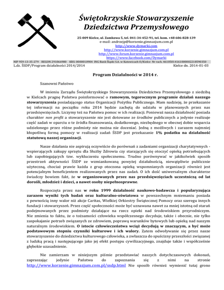 Świętokrzyskie Stowarzyszenie Dziedzictwa Przemysłowego 25-009 Kielce, ul. Zamkowa 5, tel. 041-34-452-91, tel. kom. +48 606-828-139 e-mail: [email protected] http://www.dymarki.com http://www.korzenie.gimnazjum.com.pl http://www.forum.korzenie.gimnazjum.com.pl https://www.facebook.com/Dymarki NIP 959-13-35-279 REGON 291066980 KRS: 0000010904 ING Bank Śląski S.A. w Katowicach O/Kielce Nr rach. 46105014161000002218590350 L.dz. ŚSDP/Program działalności 2014/2014 Kielce dn. 2014-01-03 Program Działalności w 2014 r. Szanowni Państwo W imieniu Zarządu Świętokrzyskiego Stowarzyszenia Dziedzictwa Przemysłowego z siedzibą w Kielcach pragnę Państwa poinformować o ramowym, tegorocznym programie działań naszego stowarzyszenia posiadającego status Organizacji Pożytku Publicznego. Mam nadzieję, że przekazanie tej informacji na początku roku 2014 będzie zachętą do udziału w planowanych przez nas przedsięwzięciach. Liczymy też na Państwa pomoc w ich realizacji. Ponieważ nasza działalność posiada charakter non profit a stowarzyszenie nie jest dotowane ze środków publicznych a jedynie realizuje część zadań w oparciu o te źródła finansowania, dodatkowego, niezbędnego w obecnej dobie wsparcia udzielonego przez różne podmioty nie można nie doceniać. Jedną z możliwych i zarazem najmniej kłopotliwą formą pomocy w realizacji zadań ŚSDP jest przekazanie 1% podatku na działalność statutową naszej organizacji. Nasze działania nie aspirują oczywiście do porównań z zadaniami organizacji charytatywnych wspierających zakupy sprzętu dla Służby Zdrowia czy starających się otoczyć opieką potrzebujących lub zapobiegających tzw. wykluczeniu społecznemu. Trudno porównywać w jakikolwiek sposób przestrzeń aktywności ŚSDP ze wzmiankowaną powyżej działalnością, niewątpliwie publicznie użyteczną, chociaż prawie każda z grup otoczona opieką wspomnianych organizacji również jest potencjalnym beneficjentem realizowanych przez nas zadań. O ich dość uniwersalnym charakterze świadczy bowiem fakt, że w organizowanych przez nas przedsięwzięciach uczestniczą od lat dorośli, młodzież i dzieci, a nawet osoby niepełnosprawne. Rozpoczęta przez nas w roku 1999 działalność naukowo-badawcza i popularyzująca zarazem wyniki tych badań oraz kulturalno-oświatowa w powszechnym mniemaniu posiada z pewnością inny walor niż akcje Caritas, Wielkiej Orkiestry Świątecznej Pomocy oraz szeregu innych fundacji i stowarzyszeń. Przez część społeczności może być uznawana nawet za mniej istotną od starań podejmowanych przez podmioty działające na rzecz opieki nad środowiskiem przyrodniczym. Nie zmienia to faktu, że o tożsamości człowieka współczesnego decyduje, także i obecnie, nie tylko zaspokajanie potrzeb związanych ze zdrowiem, poprawą warunków bytowych lub opieką nad naszym naturalnym środowiskiem. O istocie człowieczeństwa wciąż decydują w znaczącym, a być może podstawowym stopniu czynniki kulturowe i ich walory. Zatem odwoływanie się przez nasze stowarzyszenie do dziedzictwa kulturowego człowieka, a zwłaszcza do spuścizny przeszłości związanej z ludzką pracą i następującego jako jej efekt postępu cywilizacyjnego, znajduje także i współcześnie głębokie uzasadnienie. Nie zamierzam w niniejszym piśmie przedstawiać naszych dotychczasowych dokonań, zapraszając jedynie Państwa do zapoznania się z nimi na stronie http://www.korzenie.gimnazjum.com.pl/ssdp.html Nie sposób również wymienić tutaj grono naszych współpracowników – osób i instytucji, którym zawdzięczamy w znacznej mierze te osiągnięcia. Można wyłącznie dodać, że stale współpracują z nami ośrodki naukowo-badawcze, instytucje kultury, stowarzyszenia i fundacje z całego kraju, a także spoza jego granic. Planowany program działalności ŚSDP w roku 2014 obejmuje głównie kontynuację i rozwój projektu „Człowiek i Żelazo w pierwszych wiekach naszej ery”. Jest on wciąż związany z popularyzacją wyników badań nad starożytnym hutnictwem świętokrzyskim w rożnych formach. W roku bieżącym będą to przede wszystkim seminaria dymarskie - prace eksperymentalne służące pełnej rekonstrukcji procesu dymarskiego (prowadzone kilkukrotnie w ciągu roku w różnych miejscach), Warsztaty Archeologiczne „Żelazne Korzenie” (22-23 maja) - akcja edukacyjna przeznaczona głównie dla dzieci i młodzieży szkolnej na terenie Muzeum Przyrody i Techniki w Starachowicach, wycieczki edukacyjne realizowane na rzecz dzieci i młodzieży spędzającej wakacje letnie w mieście Kielce (lipiec i sierpień) oraz „Dymarki Świętokrzyskie” (14-17 sierpnia) – międzynarodowy festyn archeologiczny poświęcony antycznemu hutnictwu żelaza na ziemiach polskich i okresowi rzymskiemu w Europie organizowany od nieomal 50 lat w Nowej Słupi, w powiecie kieleckim. W związku z trwającymi od września ub. roku uzgodnieniami z gminą Nowa Słupia, nasze stowarzyszenie przypuszczalnie obejmie swą działalnością również teren Centrum KulturowoArcheologicznego w Nowej Słupi w ciągu sezonu turystycznego - od maja do października. Po dokonaniu ostatecznych ustaleń będziemy mogli Państwa powiadomić o szczegółowym harmonogramie tych działań. Możliwa będzie także organizacja warsztatów i prezentacji przygotowywanych na indywidualne zamówienie. W roku bieżącym – w sezonie letnim i jesiennym - planujemy też przeprowadzenie badań archeologicznych na cmentarzyskach kultury przeworskiej w Korytnicy i Wólce Kawęckiej, gm. Sobków, powiat jędrzejowski oraz na dostarczającym wyjątkowo cennych danych o hutnictwie starożytnym stanowisku dymarskim na uroczysku „Wykus” (między Wąchockiem a Bodzentynem). Planowana jest także kontynuacja współpracy z Biurem Innowacji Urzędu Marszałkowskiego celem produkcji kolejnych filmów poświęconych spuściźnie przemysłowej regionu świętokrzyskieg