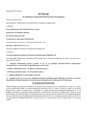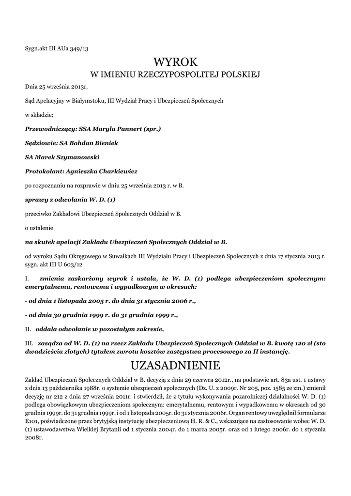 Sygn.akt III AUa 349/13 WYROK W IMIENIU RZECZYPOSPOLITEJ POLSKIEJ Dnia 25 września 2013r. Sąd Apelacyjny w Białymstoku, III Wydział Pracy i Ubezpieczeń Społecznych w składzie: Przewodniczący: SSA Maryla Pannert (spr.) Sędziowie: SA Bohdan Bieniek SA Marek Szymanowski Protokolant: Agnieszka Charkiewicz po rozpoznaniu na rozprawie w dniu 25 września 2013 r. w B. sprawy z odwołania W. D. (1) przeciwko Zakładowi Ubezpieczeń Społecznych Oddział w B. o ustalenie na skutek apelacji Zakładu Ubezpieczeń Społecznych Oddział w B. od wyroku Sądu Okręgowego w Suwałkach III Wydziału Pracy i Ubezpieczeń Społecznych z dnia 17 stycznia 2013 r. sygn. akt III U 603/12 I. zmienia zaskarżony wyrok i ustala, że W. D. (1) podlega ubezpieczeniom społecznym: emerytalnemu, rentowemu i wypadkowym w okresach: - od dnia 1 listopada 2005 r. do dnia 31 stycznia 2006 r., - od dnia 30 grudnia 1999 r. do 31 grudnia 1999 r., II. oddala odwołanie w pozostałym zakresie, III. zasądza od W. D. (1) na rzecz Zakładu Ubezpieczeń Społecznych Oddział w B. kwotę 120 zł (sto dwadzieścia złotych) tytułem zwrotu kosztów zastępstwa procesowego za II instancję. UZASADNIENIE Zakład Ubezpieczeń Społecznych Oddział w B. decyzją z dnia 29 czerwca 2012r., na podstawie art. 83a ust. 1 ustawy z dnia 13 października 1988r. o systemie ubezpieczeń społecznych (Dz. U. z 2009r. Nr 205, poz. 1585 ze zm.) zmienił decyzję nr 212 z dnia 27 września 2011r. i stwierdził, że z tytułu wykonywania pozarolniczej działalności W. D. (1) podlega obowiązkowym ubezpieczeniom społecznym: emerytalnemu, rentowym i wypadkowemu w okresach od 30 grudnia 1999r. do 31 grudnia 1999r. i od 1 listopada 2005r. do 31 stycznia 2006r. Organ rentowy uwzględnił formularze E101, poświadczone przez brytyjską instytucję ubezpieczeniową H. R. & C., wskazujące na zastosowanie wobec W. D. (1) ustawodawstwa Wielkiej Brytanii od 1 stycznia 2004r. do 1 marca 2005r. oraz od 1 lutego 2006r. do 1 stycznia 2008r. W odwołaniu od tej decyzji W. D. (1) wniósł o jej zmianę poprzez pominięcie okresu podlegania obowiązkowemu ubezpieczeniu społecznemu od 1 listopada 2005r. do 31 stycznia 2006r. Podkreślił, że od 1 stycznia 2004r. do chwili obecnej przebywa na stałe w Wielkiej Brytanii, gdzie prowadzi działalność gospodarczą i ma swoje centrum życiowe. Sąd Okręgowy w Suwałkach III Wydział Pracy i Ubezpieczeń Społecznych wyrokiem z dnia 17 stycznia 2013r. zmienił zaskarżoną decyzję i ustalił, że W. D. (1) podlega ubezpieczeniom społecznym: emerytalnemu, rentowym i wypadkowemu w okresie od 30 grudnia 1999r. do 31 grudnia 1999r. Sąd pierwszej instancji podkreślił, że zaskarżona decyzja z dnia 29 czerwca 2012r., jako trzecia w przedmiocie stwierdzenia okresu podlegania W. D. (2) ubezpieczeniom społecznym, prowadziła do odmiennej oceny zebranego materiału dowodowego. Taka ocena dowodów nie może być okolicznością uzasadniającą wszczęcie z urzędu postępowania o ponowne ustalenie prawa lub zobowiązania. Nowe formularze E 101, poświadczone przez brytyjską instytucję ubezpieczeniową H. R. & C., wskazujące na zastosowanie wobec W. D. (1) ustawodawstwa Wielkiej Brytanii w okresach od 1 stycznia 2004r. do 1 marca 2005r. oraz od 1 lutego 2006r. do 1 stycznia .2008r. i nie obejmujące okresu od 2 marca 2005r. do 31 stycznia 2006r., w którym odwołujący wykonywał na terytorium Polski pracę najemną, zostały wydane po ponownej analizie elektronicznej bazy danych ZUS. W momencie wydawania decyzji z dnia 27 września 2011r. dokumenty zgłoszenia ( (...) z datą 11 lipca 2005r.) i wyrejestrowania ( (...) z datą 16 maja 2006r.) W. D. (1) istniały bowiem w elektronicznej bazie danych i były dostępne organowi rentowemu. Nie były one nowymi dowodami, czy okolicznościami, które mogły stanowić podstawę do wystąpienia do brytyjskiej instytucji ubezpieczeniowej o weryfikację okresu podlegania ustawodawstwu brytyjskiemu. W rezultacie Sąd Okręgowy w Suwałkach, na mocy art. 47714§ 2 k.p.c., zmienił zaskarżoną decyzję i ustalił, że W. D. (1) podlega ubezpieczeniom społecznym: emerytalnemu, rentowym i wypadkowemu w okresie od 30 grudnia 1999r. do 31 grudnia 1999r. Apelację od powyższego wyroku wniósł organ rentowy. Zaskarżając orzeczenie w całości, zarzucił mu naruszenie: - art. 83a ust. 1 ustawy o systemie ubezpieczeń społecznych poprzez przyjęcie, iż nowy formularz E101 wystawiony w dniu 28 kwietnia 2012r. przez brytyjską instytucję ubezpieczeniową nie stanowi nowego dowodu w sprawie, - art. 5 ust. 1 rozporządzenia Parlamentu Europejskiego i Rady (WE) 987/2009 z dnia 16 września 2009 r. dotyczącego wykonywania rozporządzenia (WE) nr 883/2004 w sprawie koordynacji systemów zabezpieczenia społecznego (Dz.U.UE.L.2009.284.1) poprzez przyjęcie, iż ZUS nie jest związany dokumentem E-101 wydanym przez brytyjską instytucję ubezpieczeniową stanowiącym poświadczenie sytuacji odwołującego, - art. 74 ust. 4 rozporządzenia Parlamentu Europejskiego i Rady (WE) nr 883/2004 z dnia 29 kwietnia 2004r. w sprawie koordynacji systemów zabezpieczenia społecznego (Dz.U.UE.L.2004.166.1) w zw. z art. 5 ust. 2 rozporządzenia Parlamentu Europejskiego i Rady (WE) 987/2009 z dnia 16 września 2009 r. dotyczącego wykonywania rozporządzenia (WE) nr 883/2004 w sprawie koordynacji systemów zabezpieczenia społecznego (Dz.U.UE.L.2009.284.1) poprzez przyjęcie, iż ZUS nie powinien informować brytyjskiej instytucji ubezpieczeniowej o fakcie podlegania przez odwołującego ubezpieczeniom społecznym z tytułu umowy zlecenia w okresie od 2 maja 2005r. do 31 stycznia 2006r., co skutkowało wystawieniem poprawnego zaświadczenia E-101. Sąd Apelacyjny zważył, co następuje: Apelacja jest zasadna, gdyż Sąd pierwszej instancji dopuścił się naruszenia art. 83a ustawy z dnia 13 października 1998r. o systemie ubezpieczeń społecznych (tj. Dz. U. z 2009r. Nr 205 poz. 1585 ze zm.),