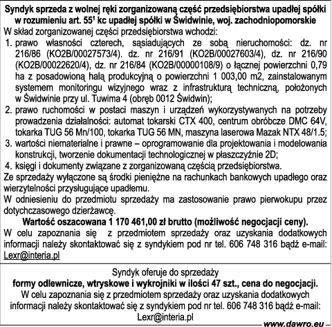 Syndyk sprzeda z wolnej ręki zorganizowaną część przedsiębiorstwa upadłej spółki w rozumieniu art. 551 kc upadłej spółki w Świdwinie, woj. zachodniopomorskie W skład zorganizowanej części przedsiębiorstwa wchodzi: 1. prawo własności czterech, sąsiadujących ze sobą nieruchomości: dz. nr 216/86 (KO2B/00027573/4). dz. nr 216/91 (KO2B/00027603/4), dz. nr 216/90 (KO2B/00022620/4), dz. nr 216/84 (KO2B/00000108/9) o łącznej powierzchni 0,79 ha z posadowioną halą produkcyjną o powierzchni 1 003,00 m2, zainstalowanym systemem monitoringu wizyjnego wraz z infrastrukturą techniczną, położonych w Świdwinie przy ul. Tuwima 4 (obręb 0012 Świdwin); 2. prawo ruchomości w postaci maszyn i urządzeń wykorzystywanych na potrzeby prowadzenia działalności: automat tokarski CTX 400, centrum obróbcze DMC 64V, tokarka TUG 56 Mn/100, tokarka TUG 56 MN, maszyna laserowa Mazak NTX 48/1.5; 3. wartości niematerialne i prawne – oprogramowanie dla projektowania i modelowania konstrukcji, tworzenie dokumentacji technologicznej w płaszczyźnie 2D; 4. księgi i dokumenty związane z zorganizowaną częścią przedsiębiorstwa. Ze sprzedaży wyłączone są środki pieniężne na rachunkach bankowych upadłego oraz wierzytelności przysługujące upadłemu. W odniesieniu do przedmiotu sprzedaży ma zastosowanie prawo pierwokupu przez dotychczasowego dzierżawcę. Wartość oszacowana 1 170 461,00 zł brutto (możliwość negocjacji ceny). W celu zapoznania się z przedmiotem sprzedaży oraz uzyskania dodatkowych informacji należy skontaktować się z syndykiem pod nr tel. 606 748 316 bądź e-mail: [email protected] Syndyk oferuje do sprzedaży formy odlewnicze, wtryskowe i wykrojniki w ilości 47 szt., cena do negocjacji. W celu zapoznania się z przedmiotem sprzedaży oraz uzyskania dodatkowych informacji należy skontaktować się z syndykiem pod nr tel. 606 748 316 bądź e-mail: Lexr@interia. pl